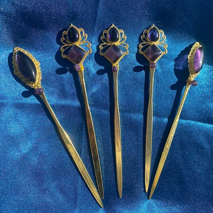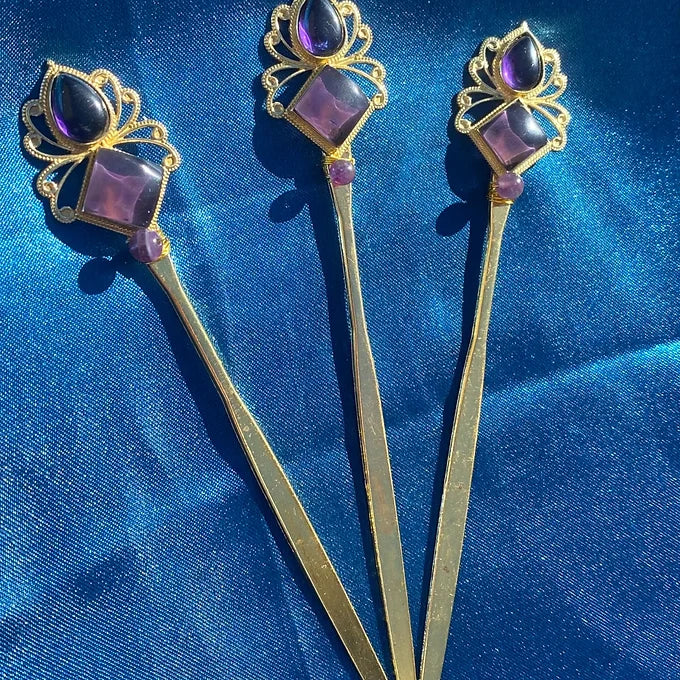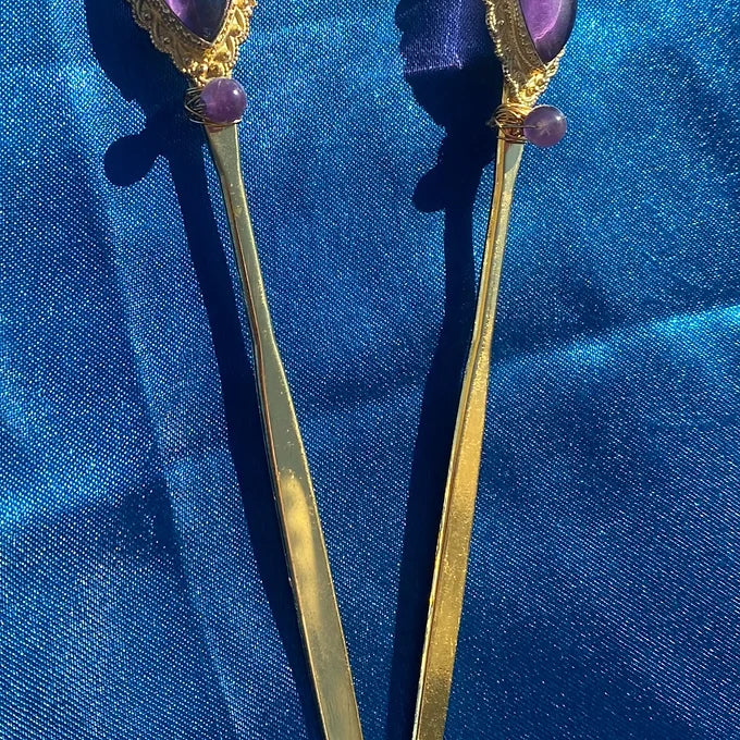 This listing is for 1 handmade amethyst hair pin. You can chose from the drop down menu if you would like style 1 or style 2.Please refer to the product photos, the upper right corner will have the style number. These hair pins are made of gold toned materials and has been reikied by a certified reiki master.