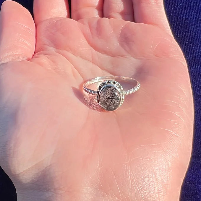 Boasting sterling silver and a size 8, this Black Rutile Quartz Ring is specially Reikied by an accredited master. Black Rutile Quartz is a potent combination of Tourmaline and Clear Quartz Crystal with immense protective and defensive qualities. Tourmaline helps purify one's energy and guard against negativity, while Quartz boosts energetic output. Furthermore, this potent gemstone amplifies and reflects negative energy or can convert it to positive power, depending on the wearer's intent. As a grounding force, this stone enhances the body's energy field to guard against external forces and harmful environmental impacts. Furthermore, it is often used as a symbol of unity and is an exceptional problem solver, capable of liberating the wearer from destructive patterns and stressful situations. This gemstone brings harmony and balance to polarities and transforms negative thoughts into positives. On a psychological level, it helps to heal and unify the dark elements, relieving any self-sabotage. It is also beneficial for harmonizing mer