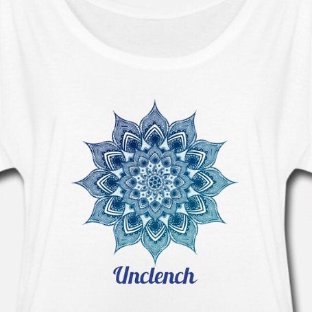 Beautiful blue ombre mandala with blue wording underneath that says “unclench”. This cute flowy top comes in black or white. Both shirts are loose fitting and comfortable.