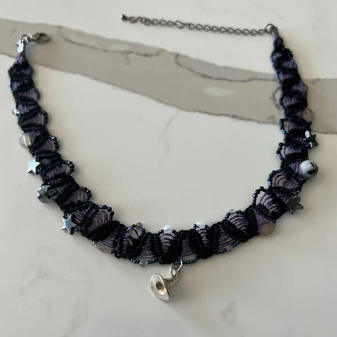 The Celestial Witch Choker is inspired by astrology, celestial bodies, and of course witches. In honor of spooky season, Lala Lotus Co. had created 5 one-of-a-kind, limited edition chokers. This beautiful one-of-a-kind piece is handmade with over 300 tiny knots and beads. Made with Black and Purple cotton cords, this necklace is 13 inches and can adjust to 15 inches, the traditional choker size. The metal fixings are a gunmetal black and the detail seedbeds are a deep metallic blue. This necklace is made with Blue Goldstone, Labradorite, Rainbow Moonstone, Black Moonstone, Hematite Stars, and Black Rutile Quartz. The best part? This piece was reikied by a certified reiki master.