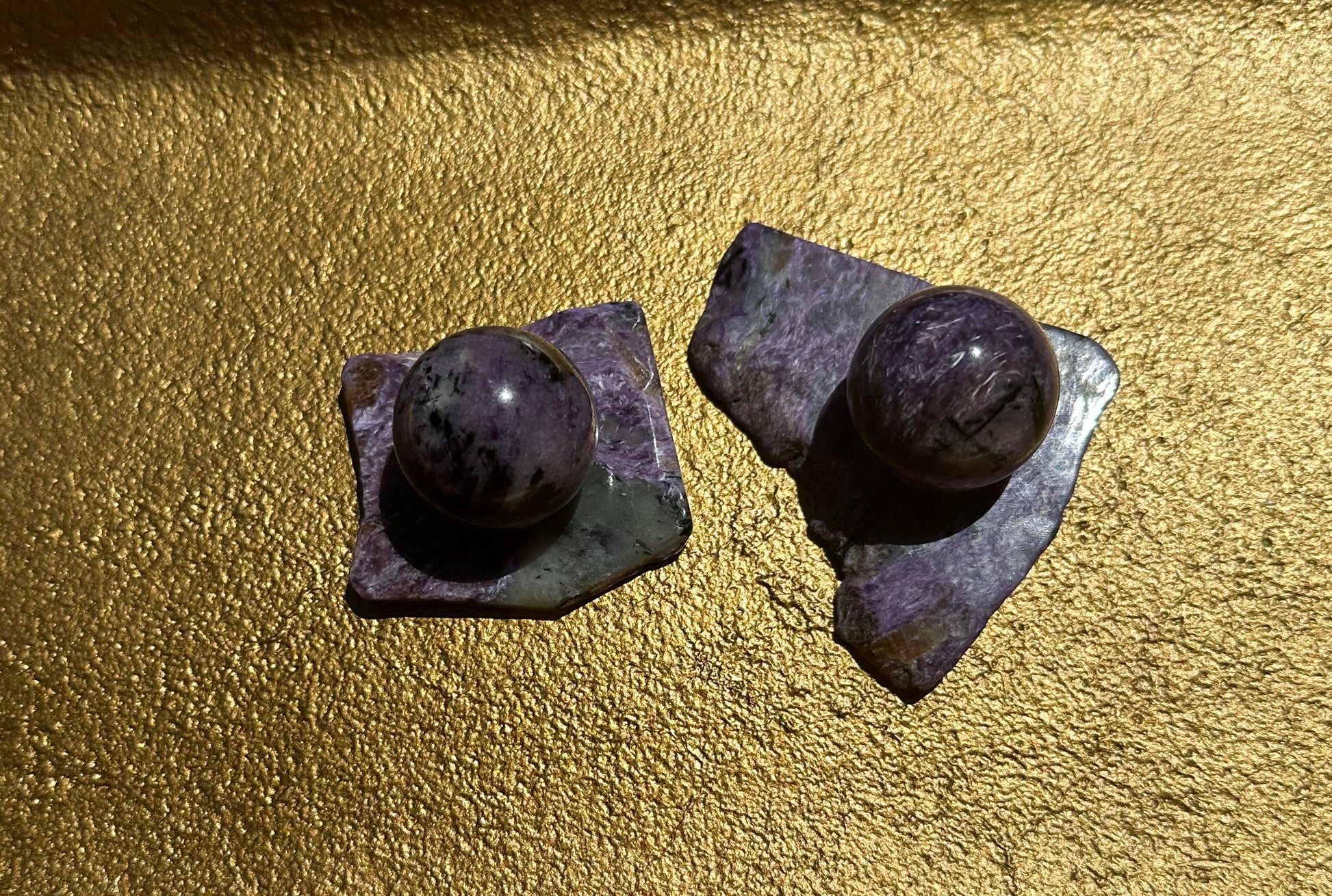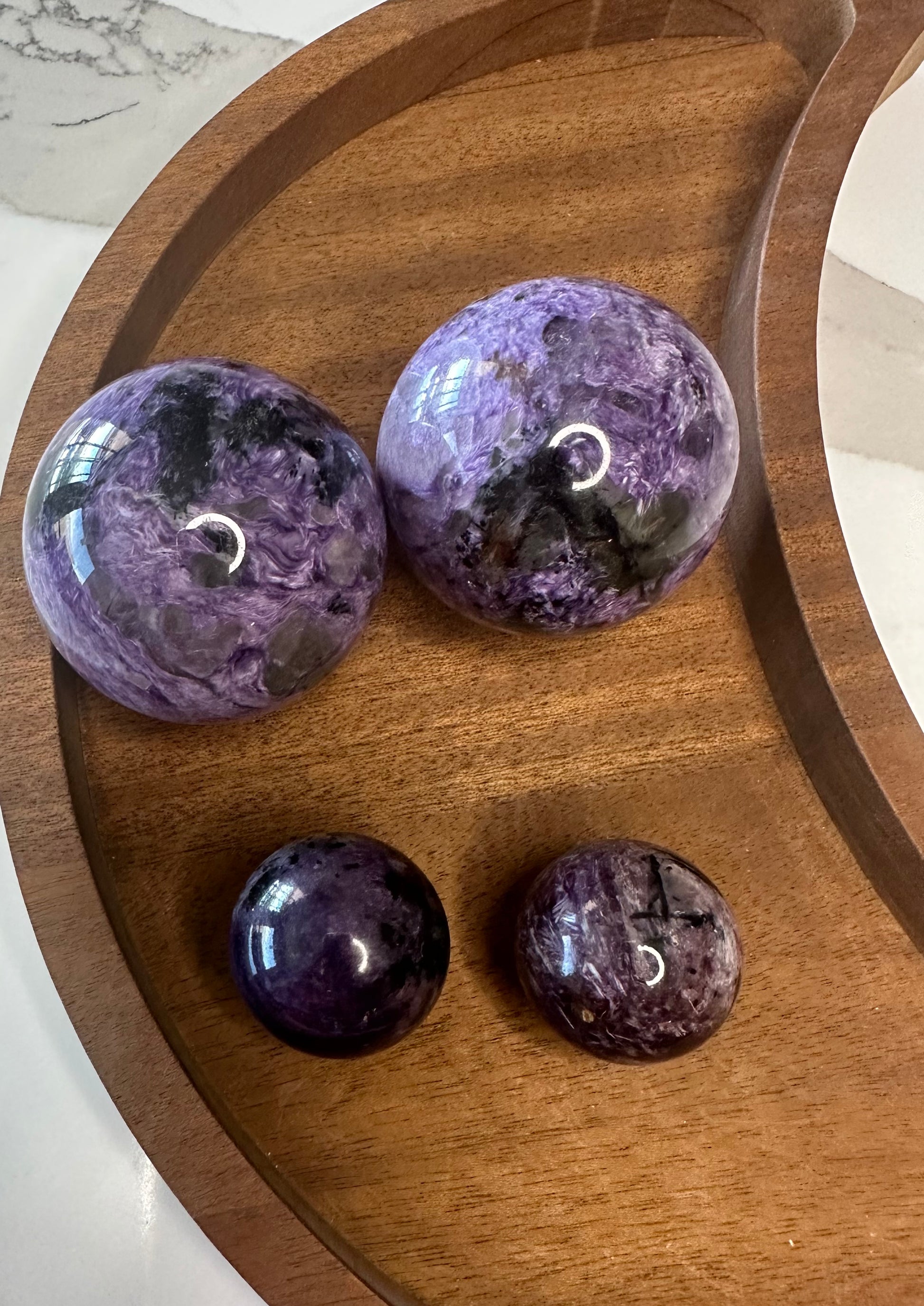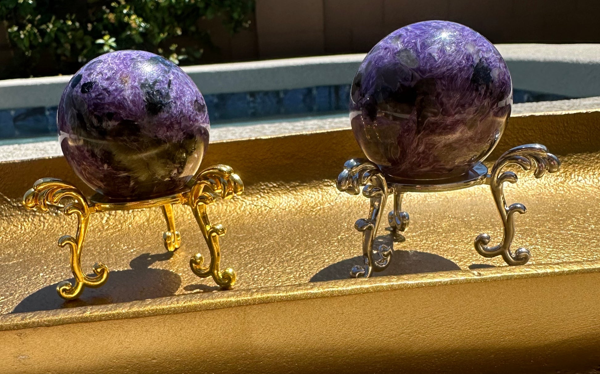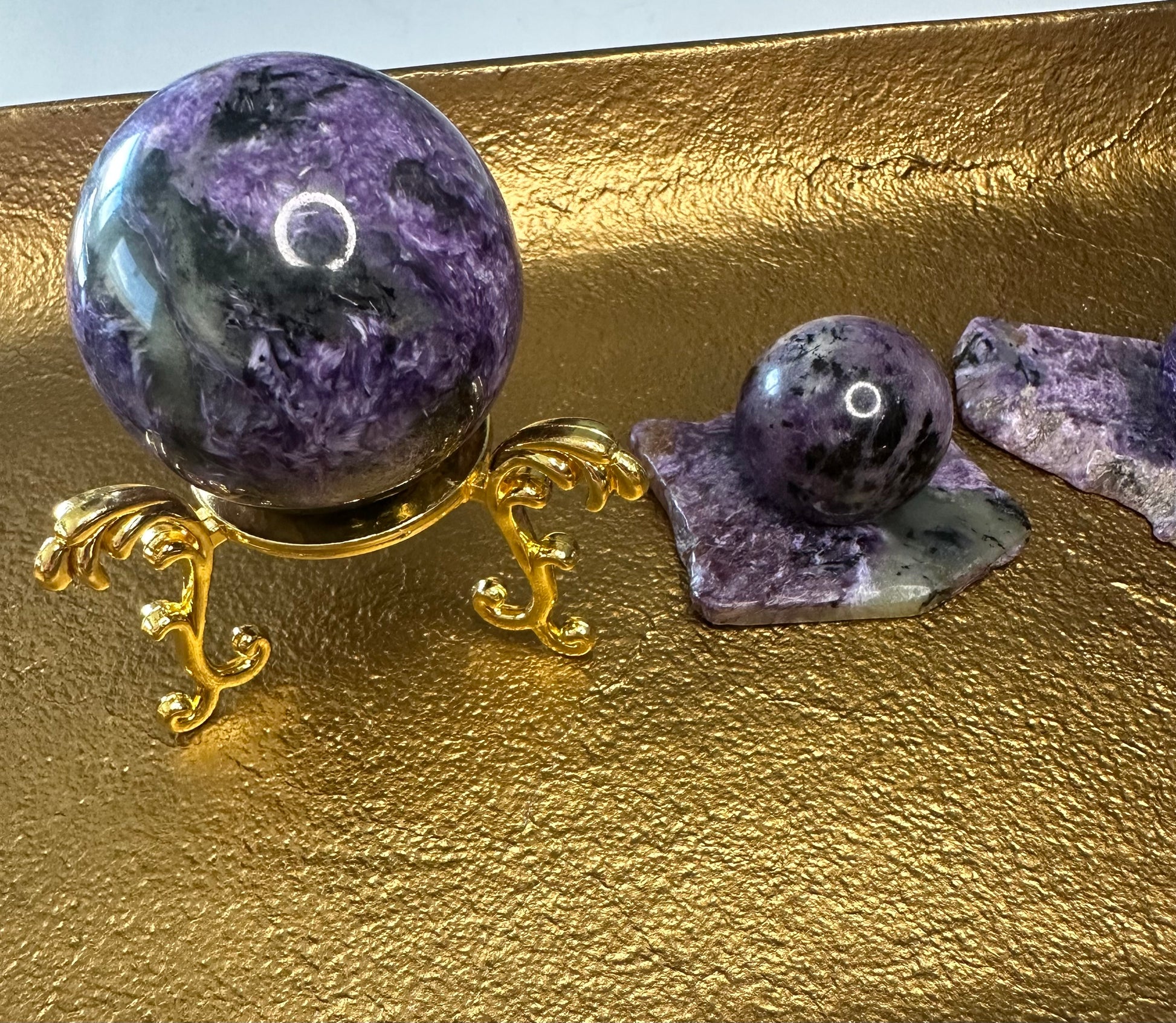 This listing is for one intuitively chosen Charoite sphere, available in mini and large sizes. Certified Reiki and energy healing master Reikied, this rare purple crystal must not get wet. Known as the stone of transformation, Charoite aids in transmuting negative emotions and connecting with higher frequencies. It opens the heart, reduces stress, and increases self-esteem and creativity. Connecting one to dualities and mother earth, its perfect for past-life work and meditation. Charoite balances body, mind, and spirit and it promotes courage and clarity of decision making based on love, not fear. It can even help those struggling with ADHD or Asperger's. This purple talisman is also great for healing and detoxing.