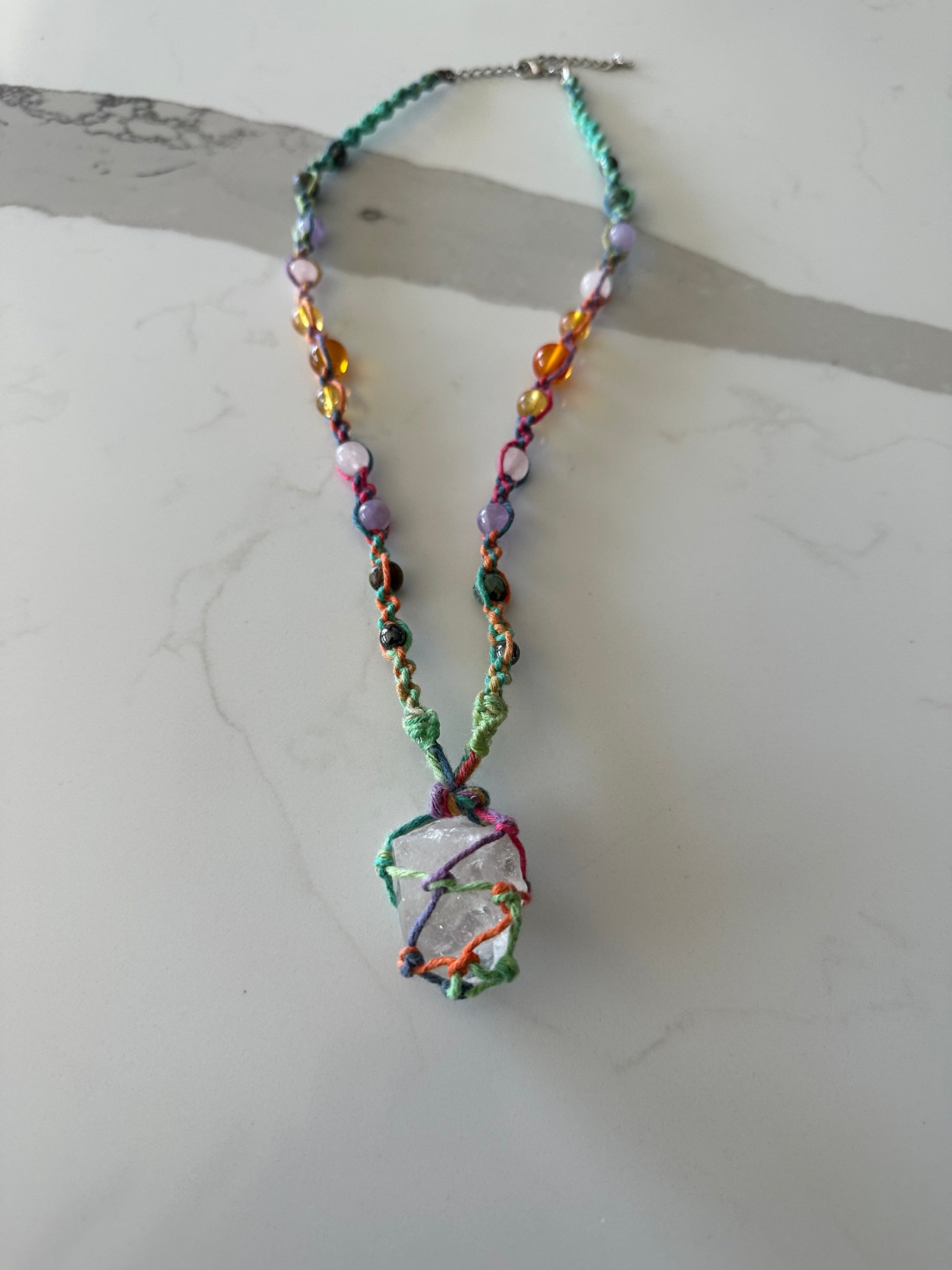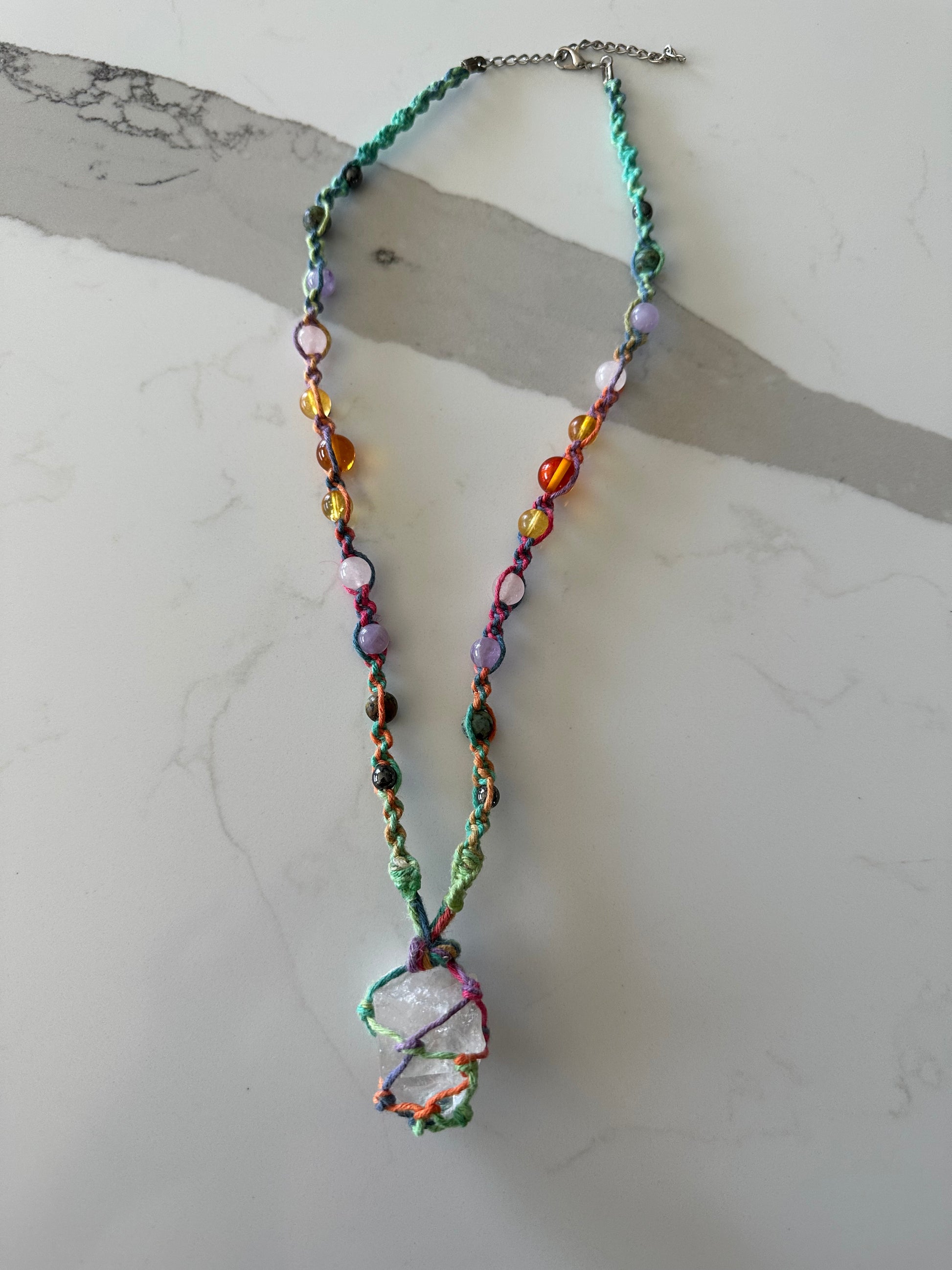 Complete chakra set is handmade with grade A or higher crystals and rainbow tie-dye hemp cord. The bracelet is made with the same stones as the necklace, black cord, and is adjustable. Each crystal is hand selected for each chakra. This necklace is 20inch necklace that can adjust to 23 inches. This necklace can also be mad on black hemp cord.
