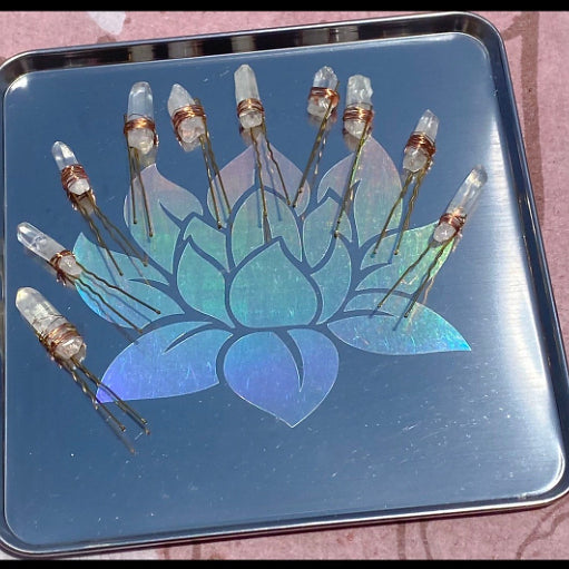 Due to the rough quartz points, not all hair pins will be the same size and shape. Some quartz points will be larger or smaller than others. All, however, will be made with love and attention to detail.