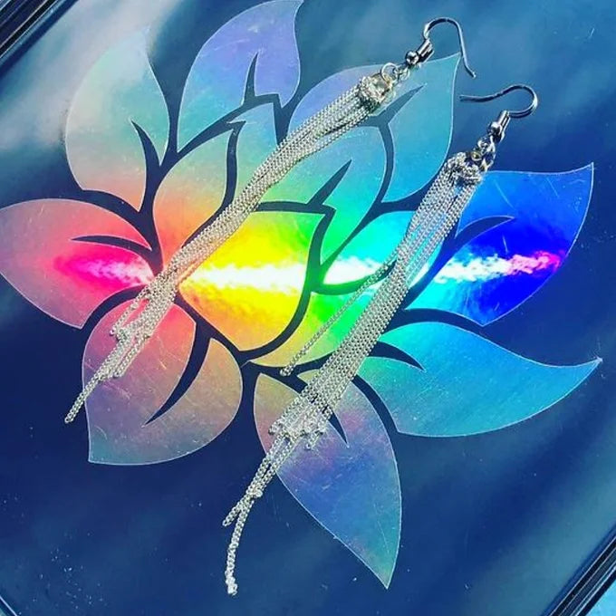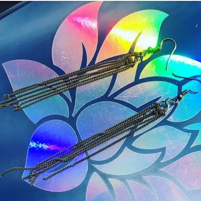 Delicate chain earrings are handmade. They come in gold, bronze, silver, and mixed metals! They are light weight and are shoulder length. (About 4 inches). These earrings have been recycled from vintage jewlery.