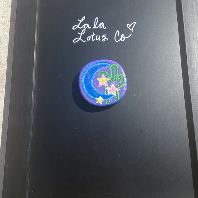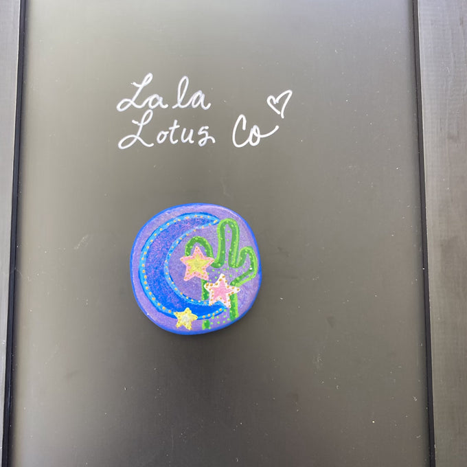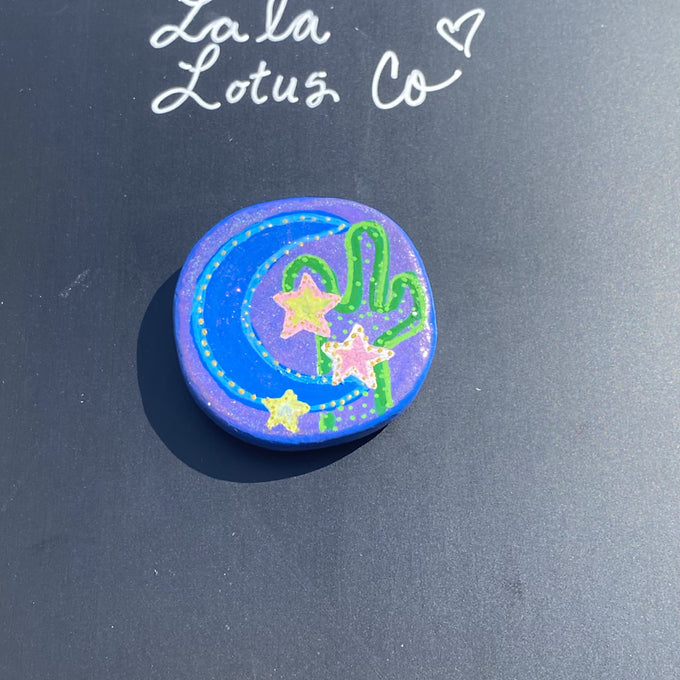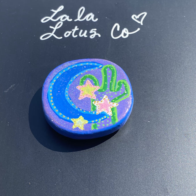 Desert at night magnet is hand painted on a 3 by 3 circular stone. The background is blue and sparkly purple. The painting depicts a cactus, there’s stars, and a blue moon. The cactus is made with different shades of green. The stars are each unique. One is painted yellow and outlined with a pale pink. One is painted pink and outlined with white. One is white outlined in yellow. There are gold accents and sparkles outlining the stars. The moon is a large blue crescent moon. It is outlined with a light blue and has gold accents to match the stars. It has a coat of shimmer paint over it.