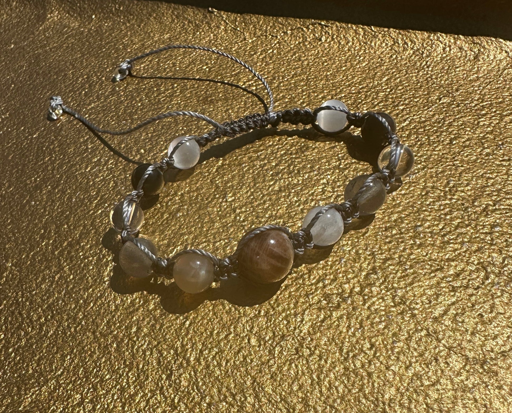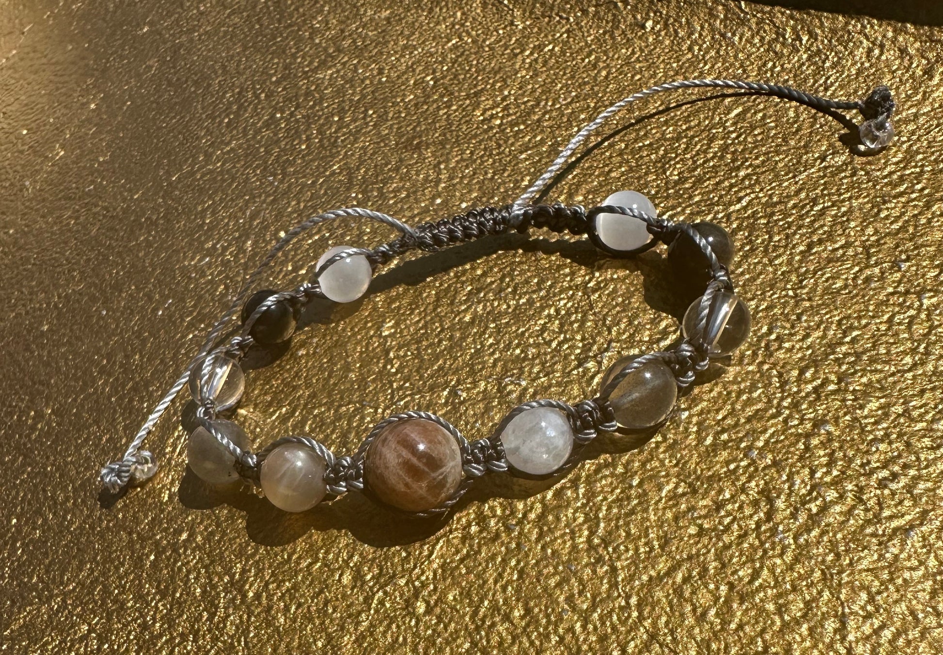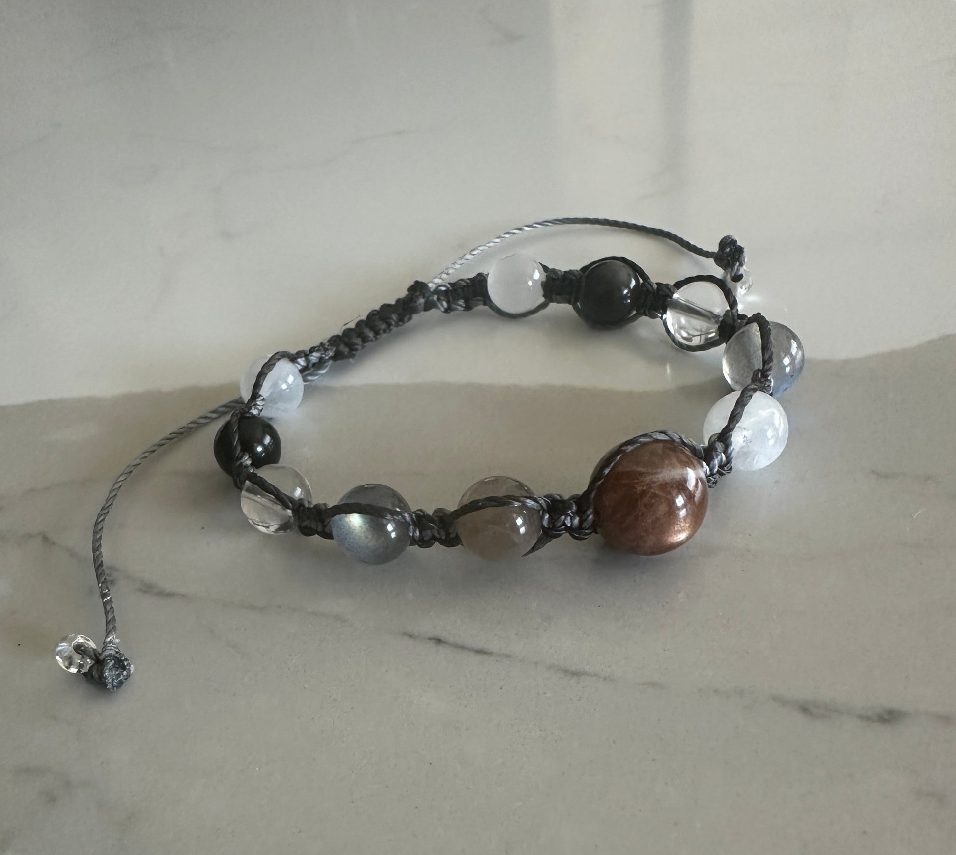 Crafted and reiki-infused by a certified healer, the Eclipse bracelet is your guide through the transformative journey of eclipse season. Cherished during lunar and solar eclipses, as well as on new and full moons, it becomes an integral part of your daily practice. Reversible and handwoven with silver and gunmetal gray cord, it beautifully symbolizes the various faces of the moon. Adorned with selenite, silver sheen obsidian, clear quartz, labradorite, rainbow moonstone, black moonstone, and a rare form of sunstone, this bracelet empowers you to embrace change and illumination.