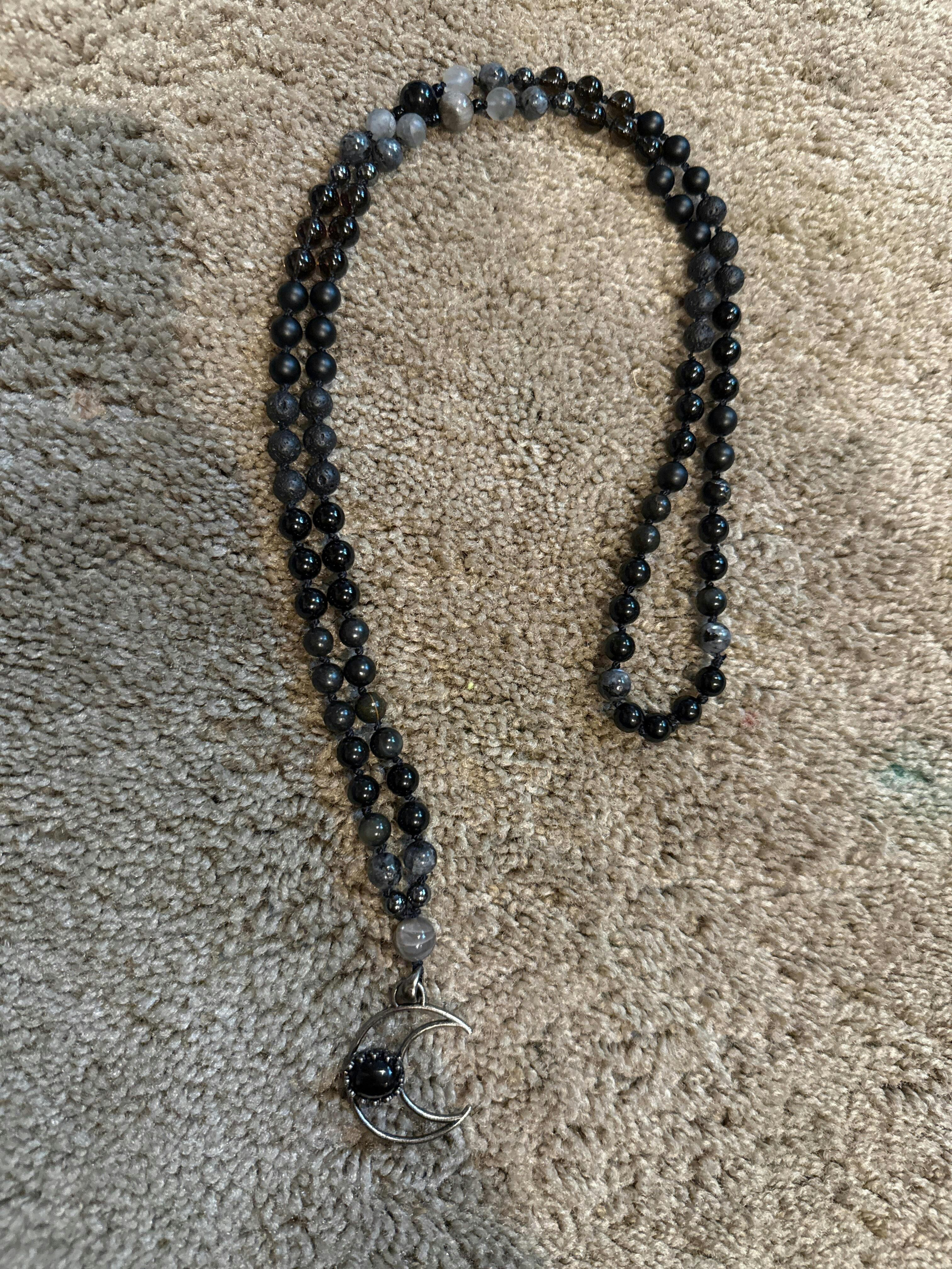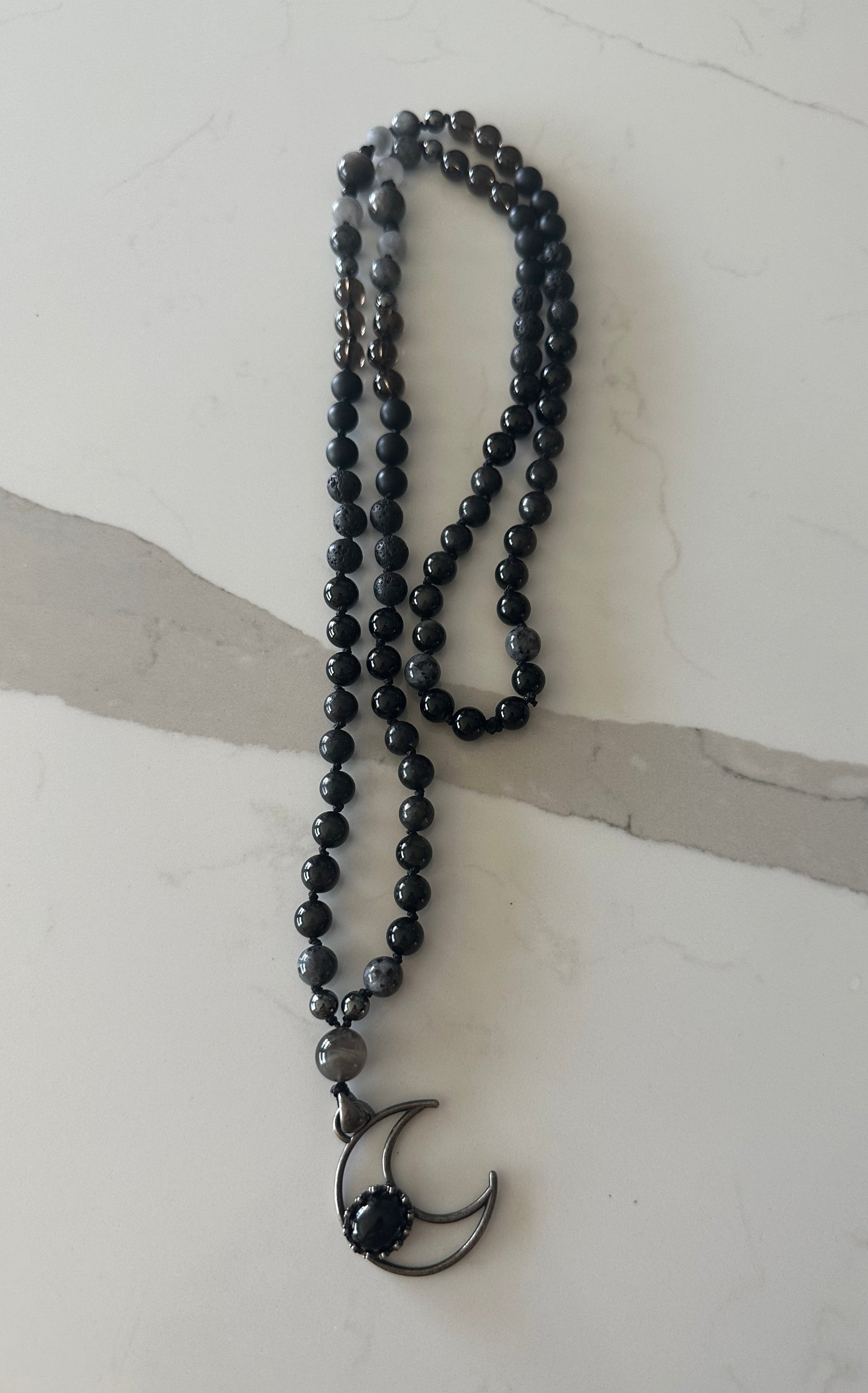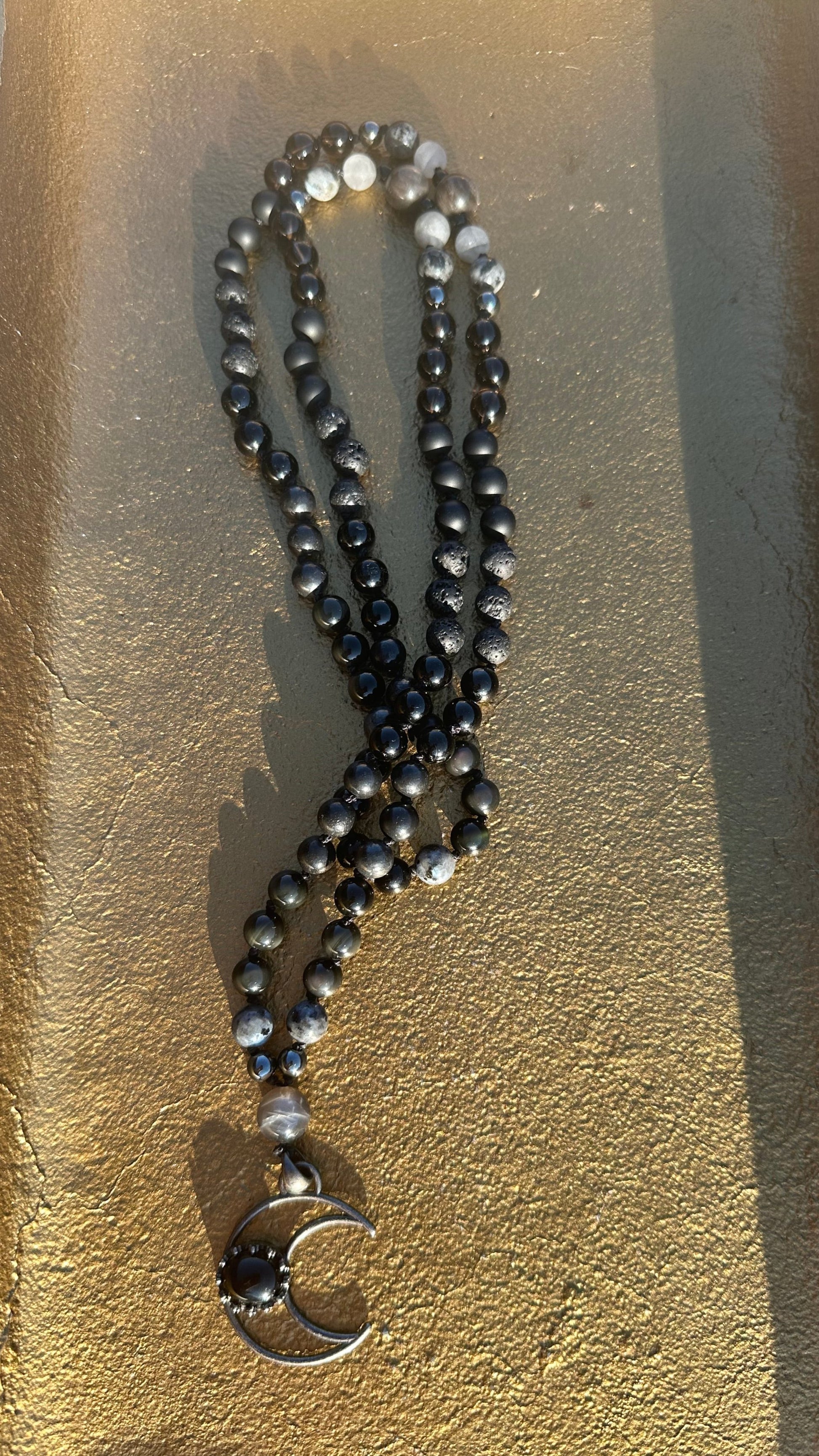 Handmade and blessed by a certified energy healing and reiki master, this Eclipse Moon Mala is a unique and stunning piece. Designed with a combination of Black Onyx, Onyx Agate, Hematite, Larvikite, Rainbow Obsidian, Shungite, Lava Stone (which can be used with essential oils), and Silver Sheen Obsidian, and Black Moonstone; it offers both grounding and protection. Ideal for the eclipse season, this mala is a must-have for those seeking to enhance their energy and well-being. This necklace is 38 inches.