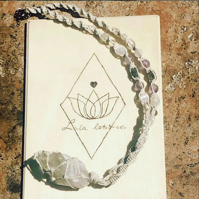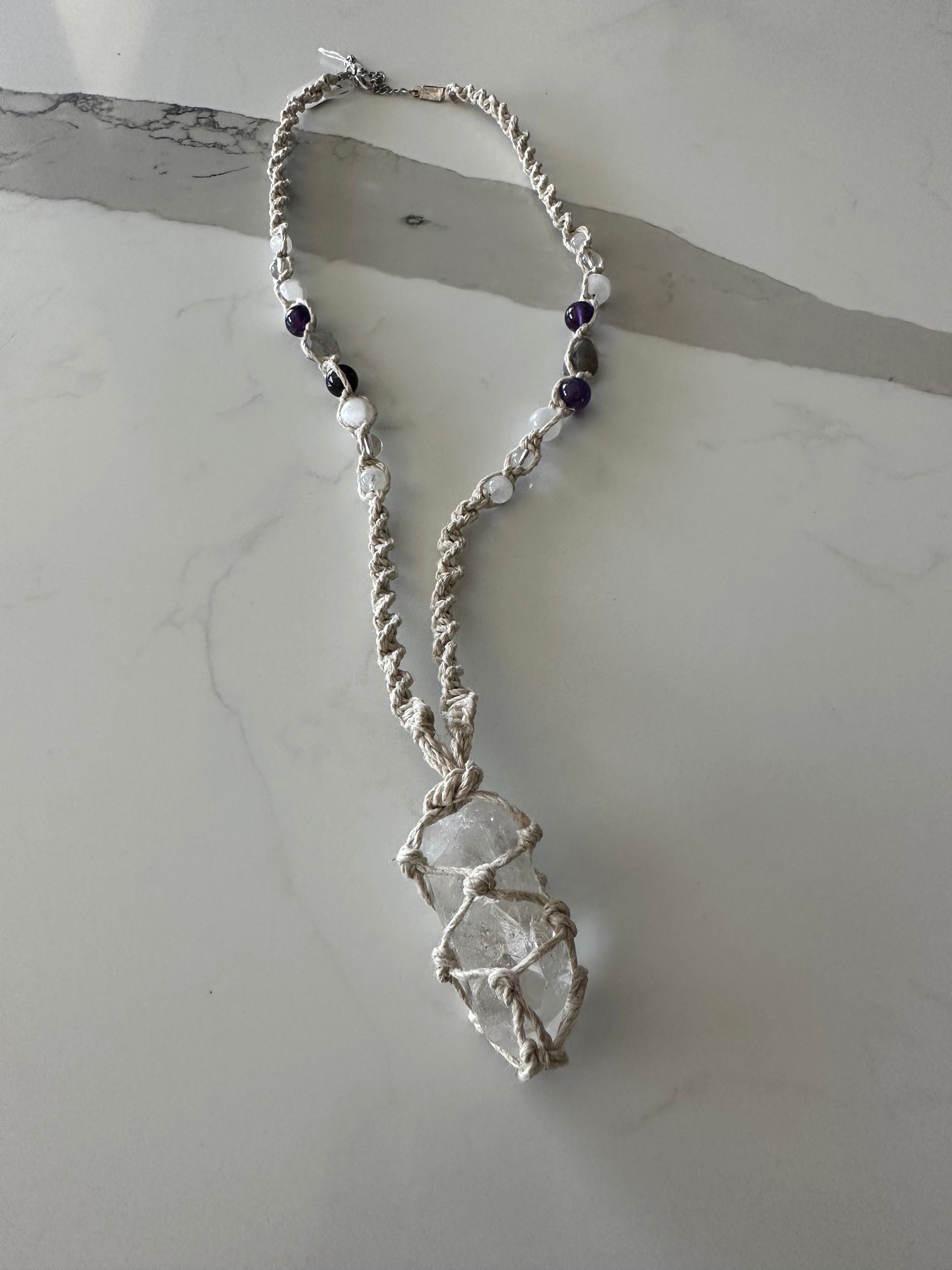 This beautiful necklace was handmade and designed to help empath a or anyone on their spiritual journey! Made with clear quartz, rainbow moonstone, selenite, amethyst, labradorite and glow in the dark hemp. The best part? It’s been reikied by a certified reiki master.