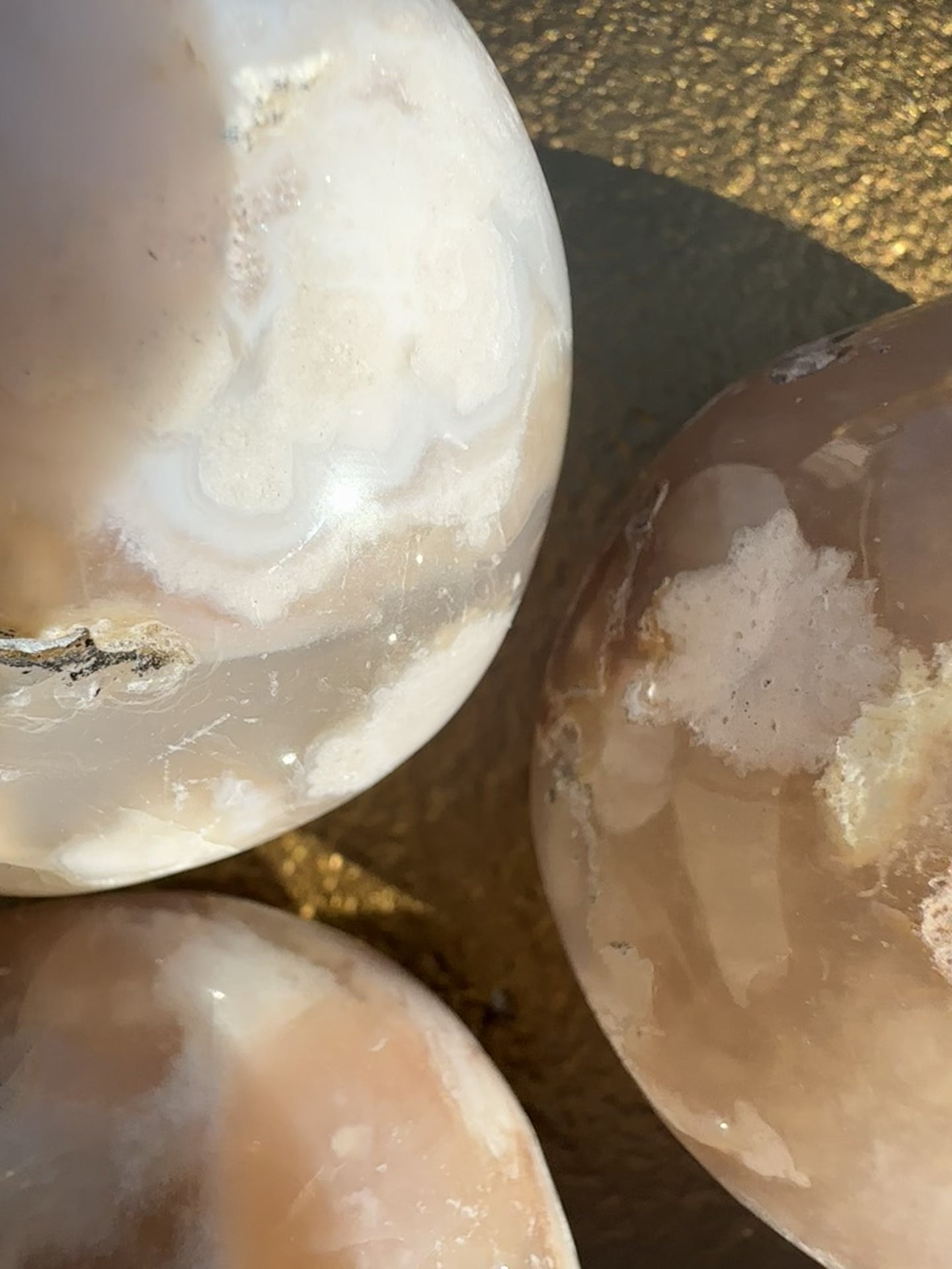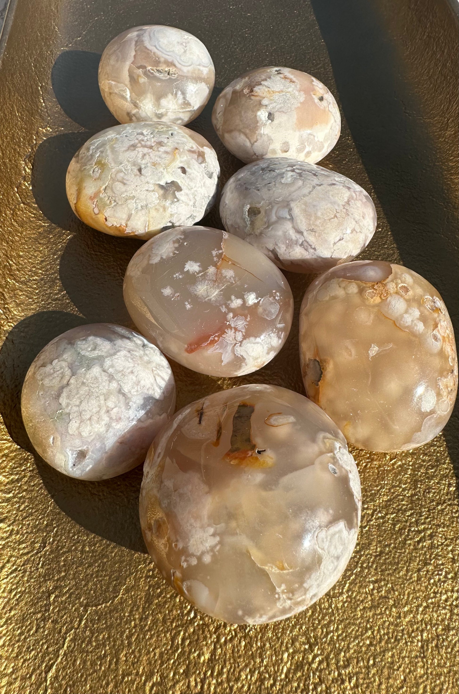 This listing features one hand-picked Cherry Blossom Agate Palm Stone, blessed by an accredited energy healer and Reiki master.