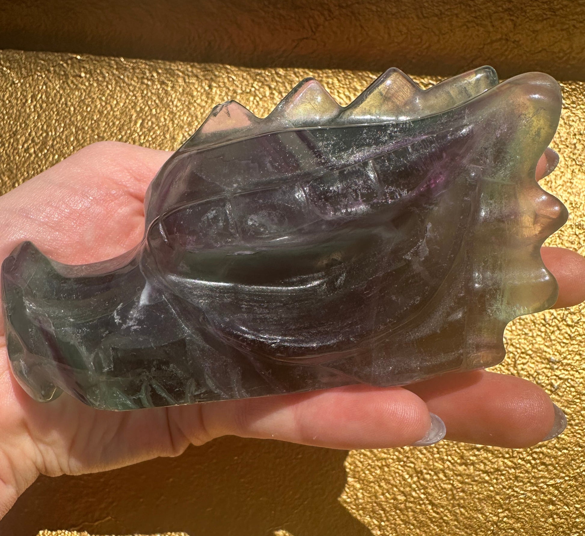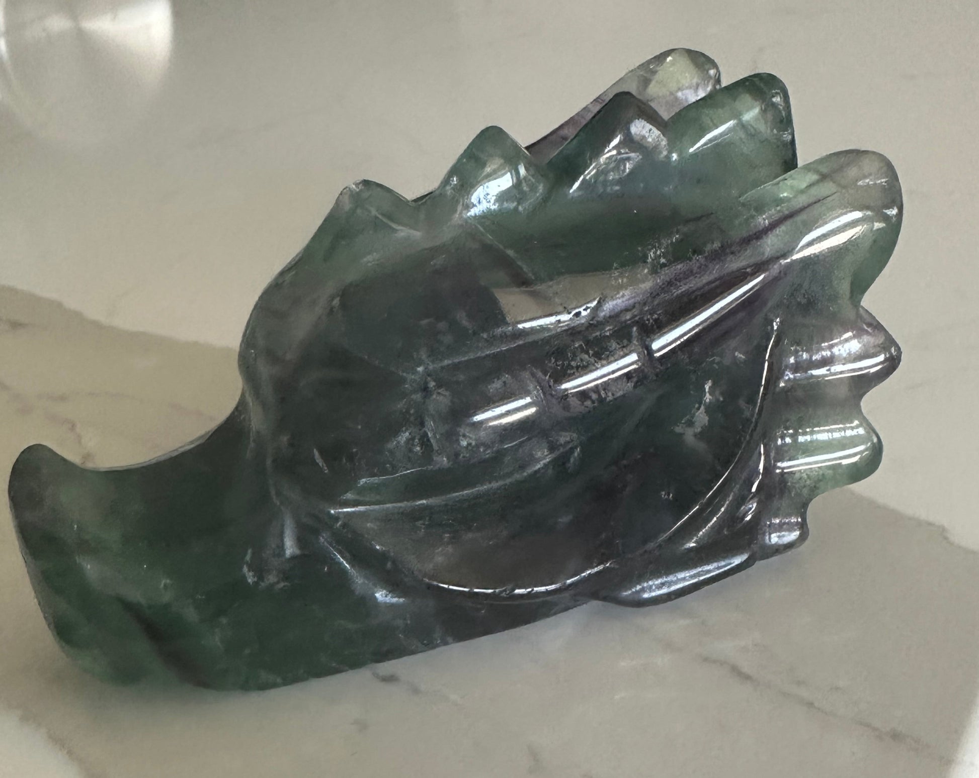 This listing is for 1 large Rainbow Fluorite Dragon Head. This Carving was blessed and reikied by a certified energy healing and reiki master. This sculpture measures approximately 4 inches in length and 3 inches in width.