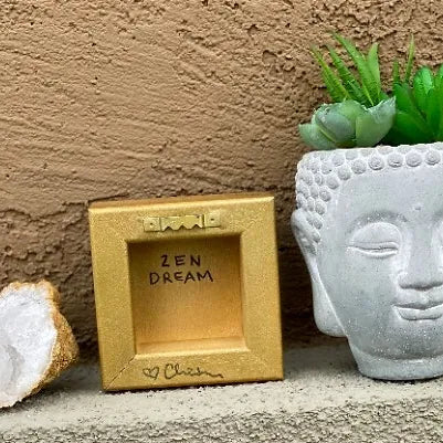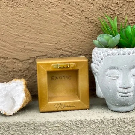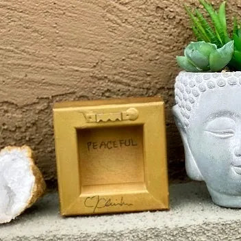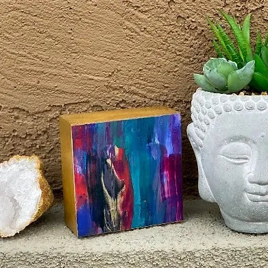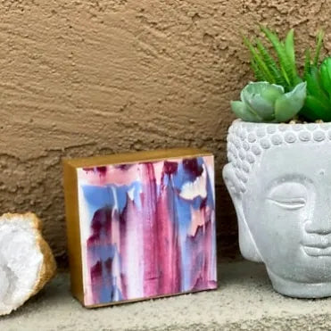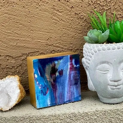 Geode paintings can be bought as a set or separately. Please check variations the prices may vary. The sides are gold. These paintings can stand up on their own or be hung on the wall. The measurements are 4x4 inches and the thickness is 1 1/2 inches.