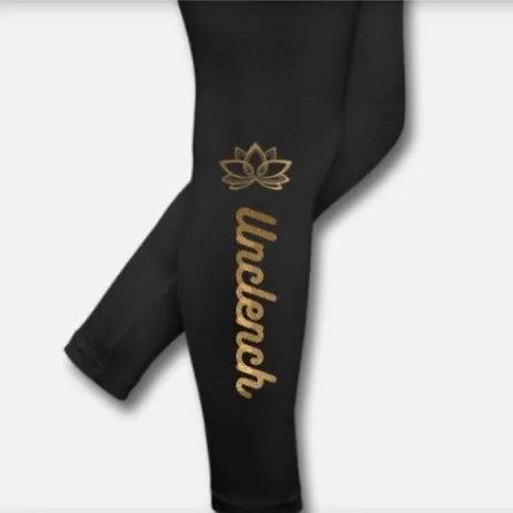 Gold foiled unclench leggings are cute black leggings that come in any size. Says unclench in a beautiful script on the leg with a gold lotus flower over it.