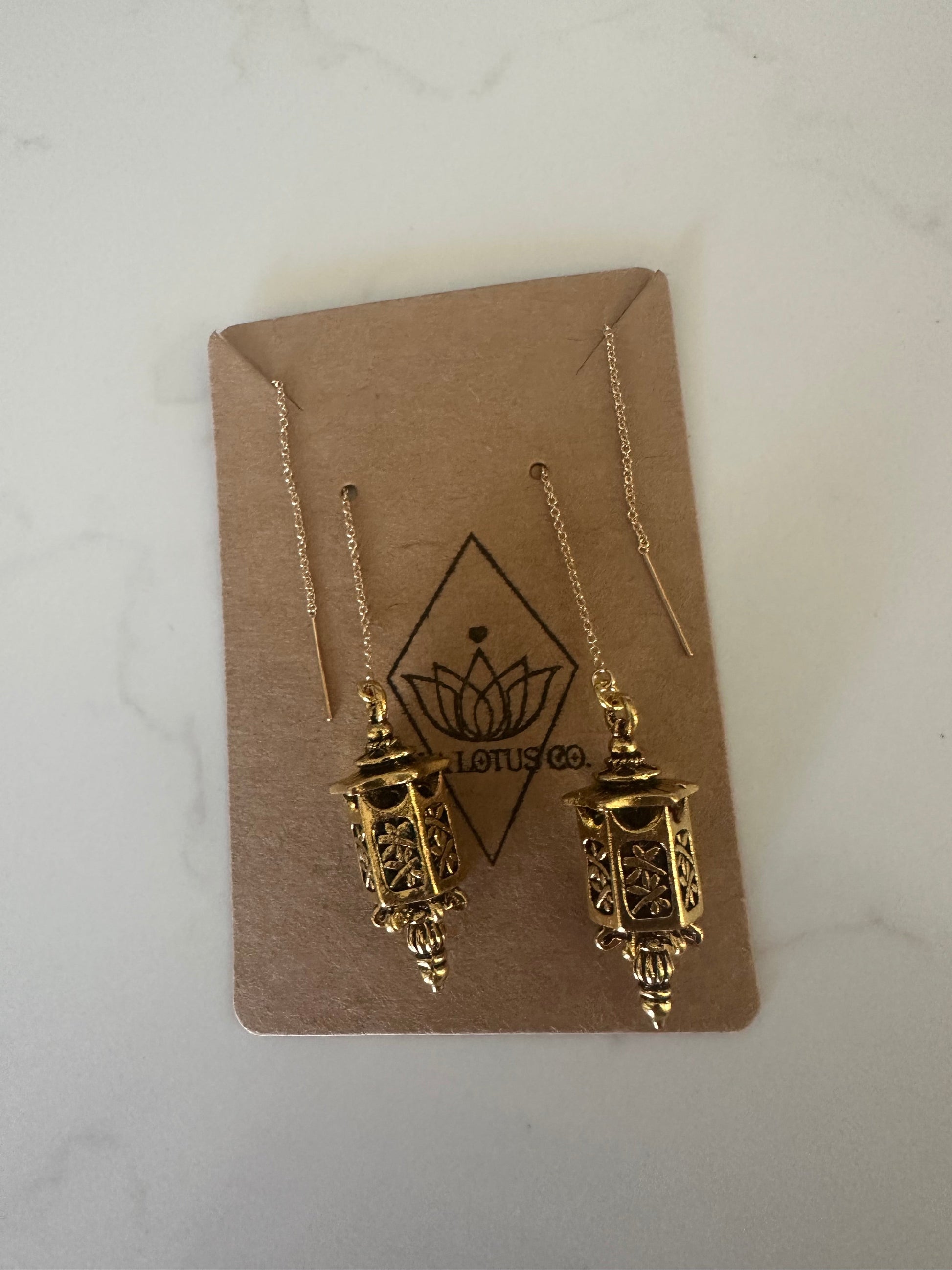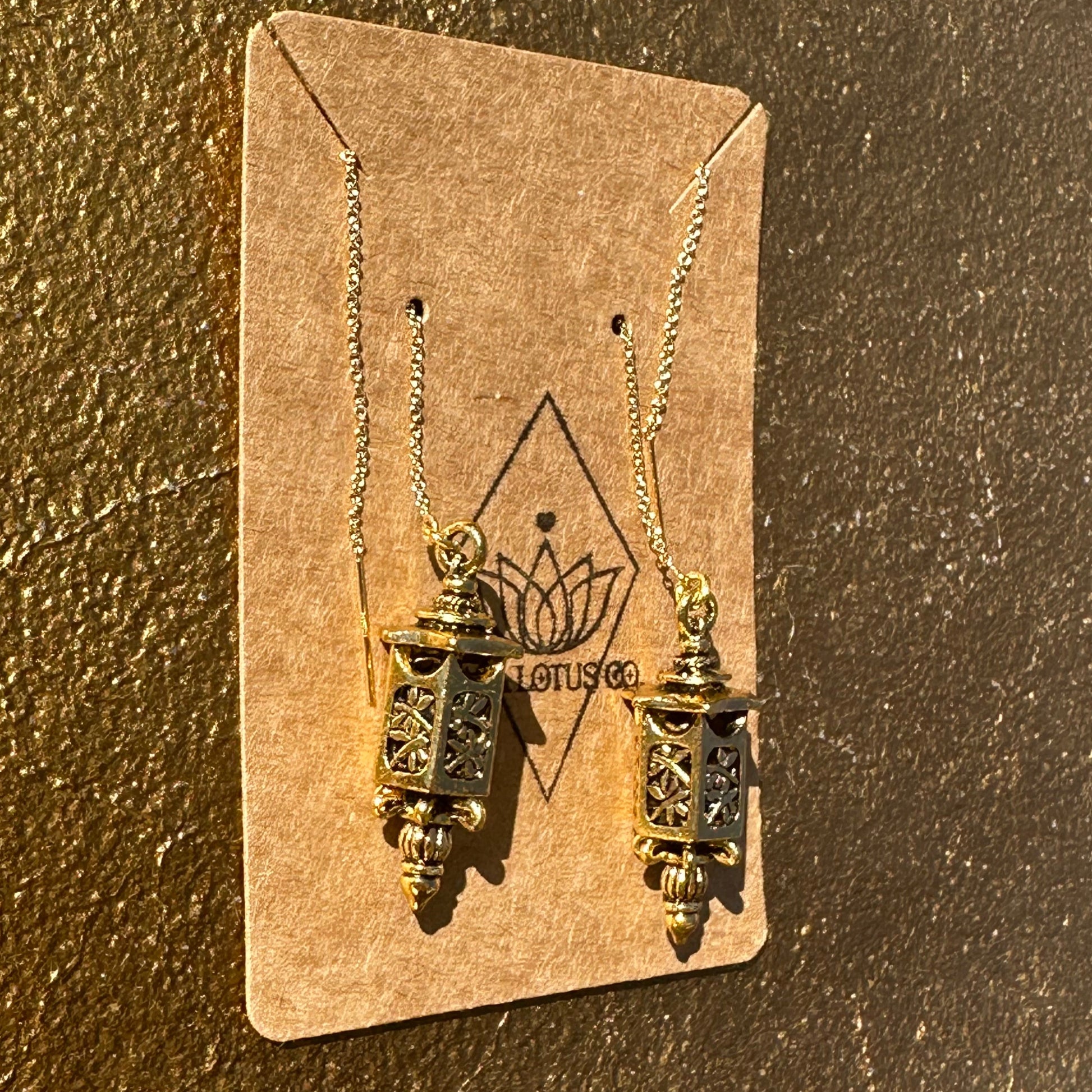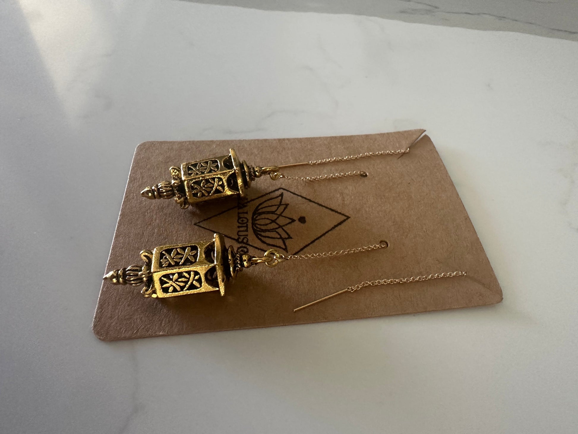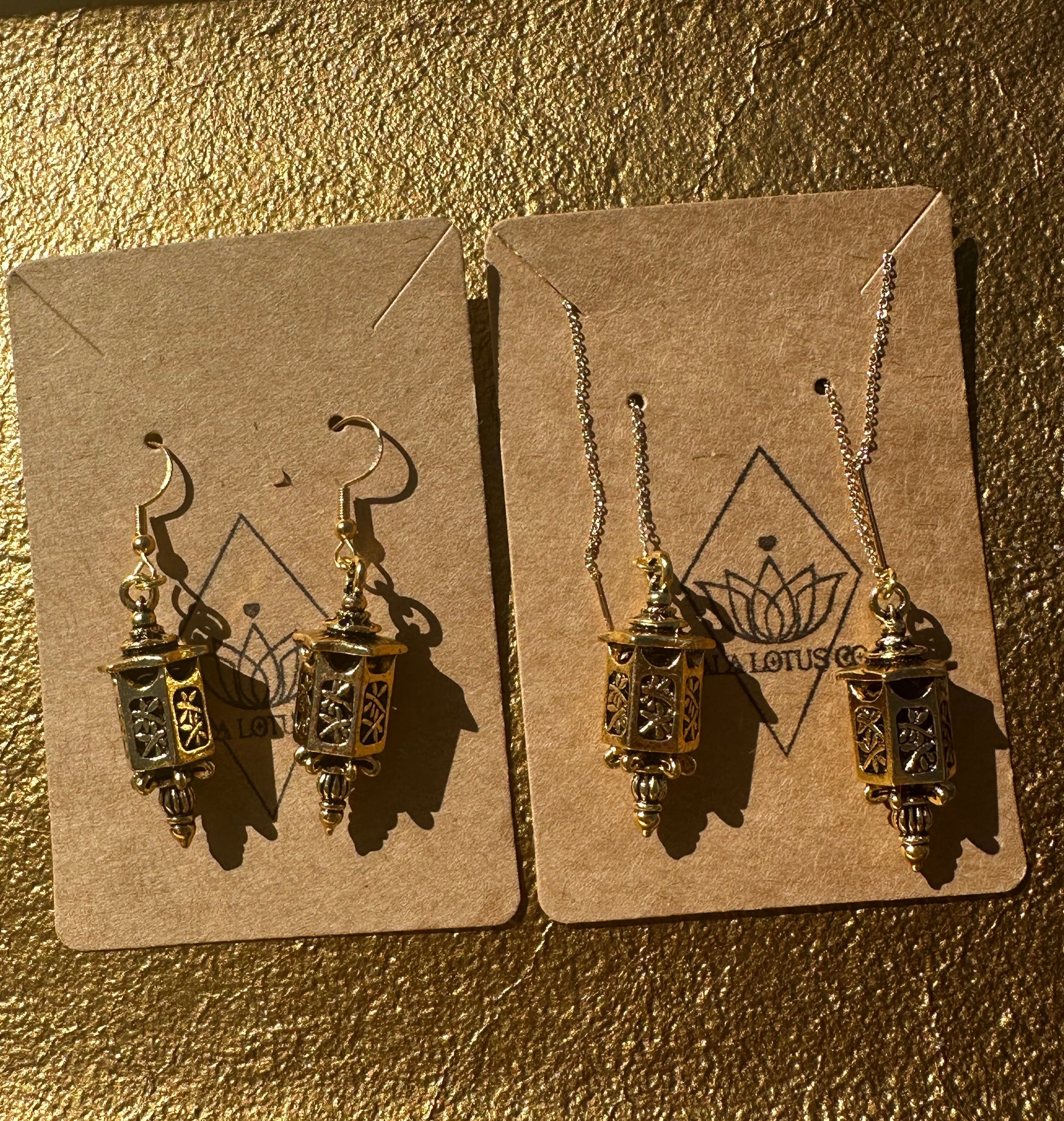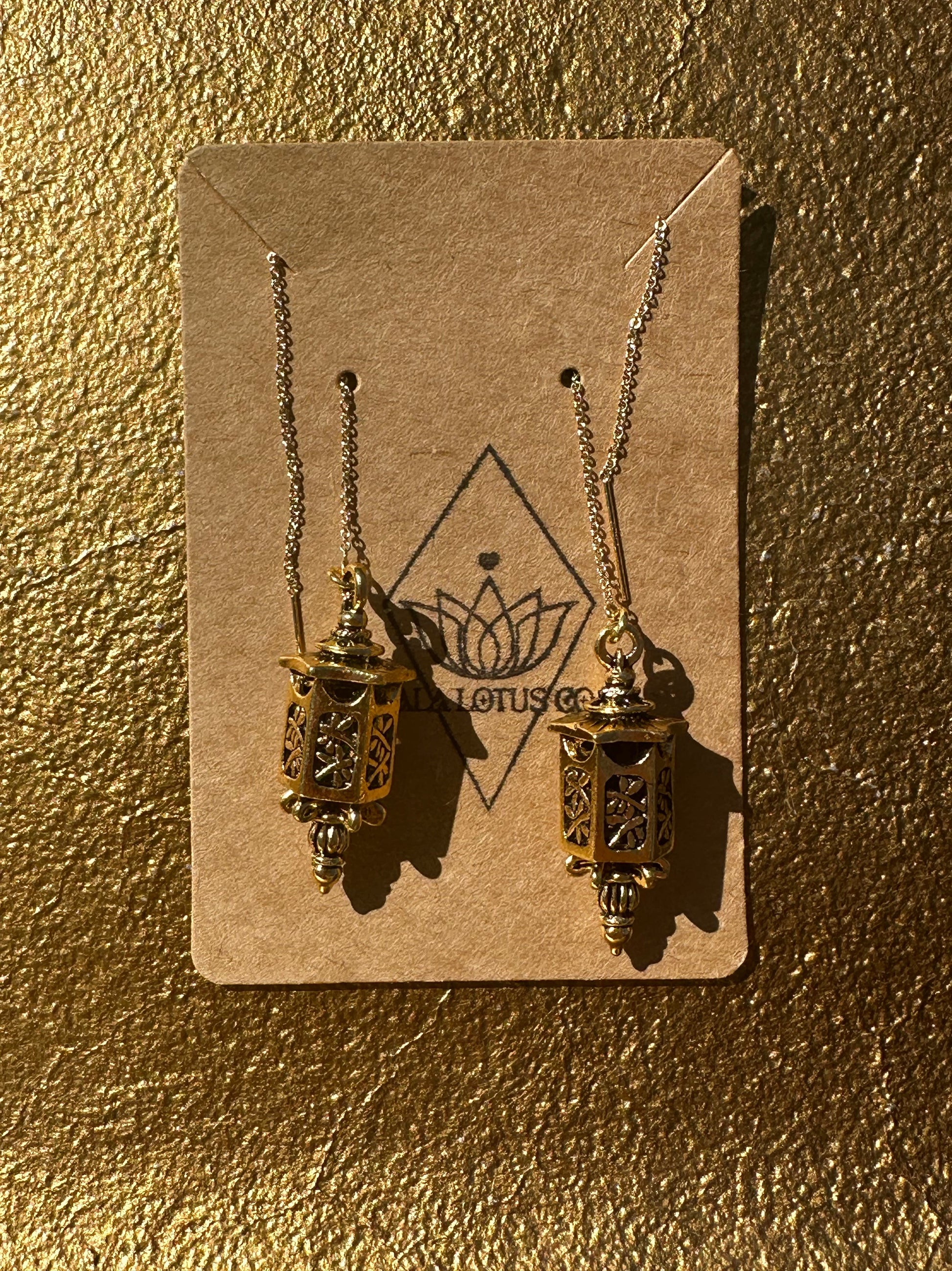 Introducing the Golden Twilight Lantern Earrings, designed in collaboration with artist Rebekah inspired by her Twilight Lantern community. These handmade earrings, featuring ornate golden lanterns, are available in two designs - the shorter dangle at 2 inches and the longer threader at 5 inches, providing adjustable length options. Each set comes with earring backs. Please note, the longer threader design may feel heavier than the dangle design. Infused with Reiki blessings, these earrings are truly magical.