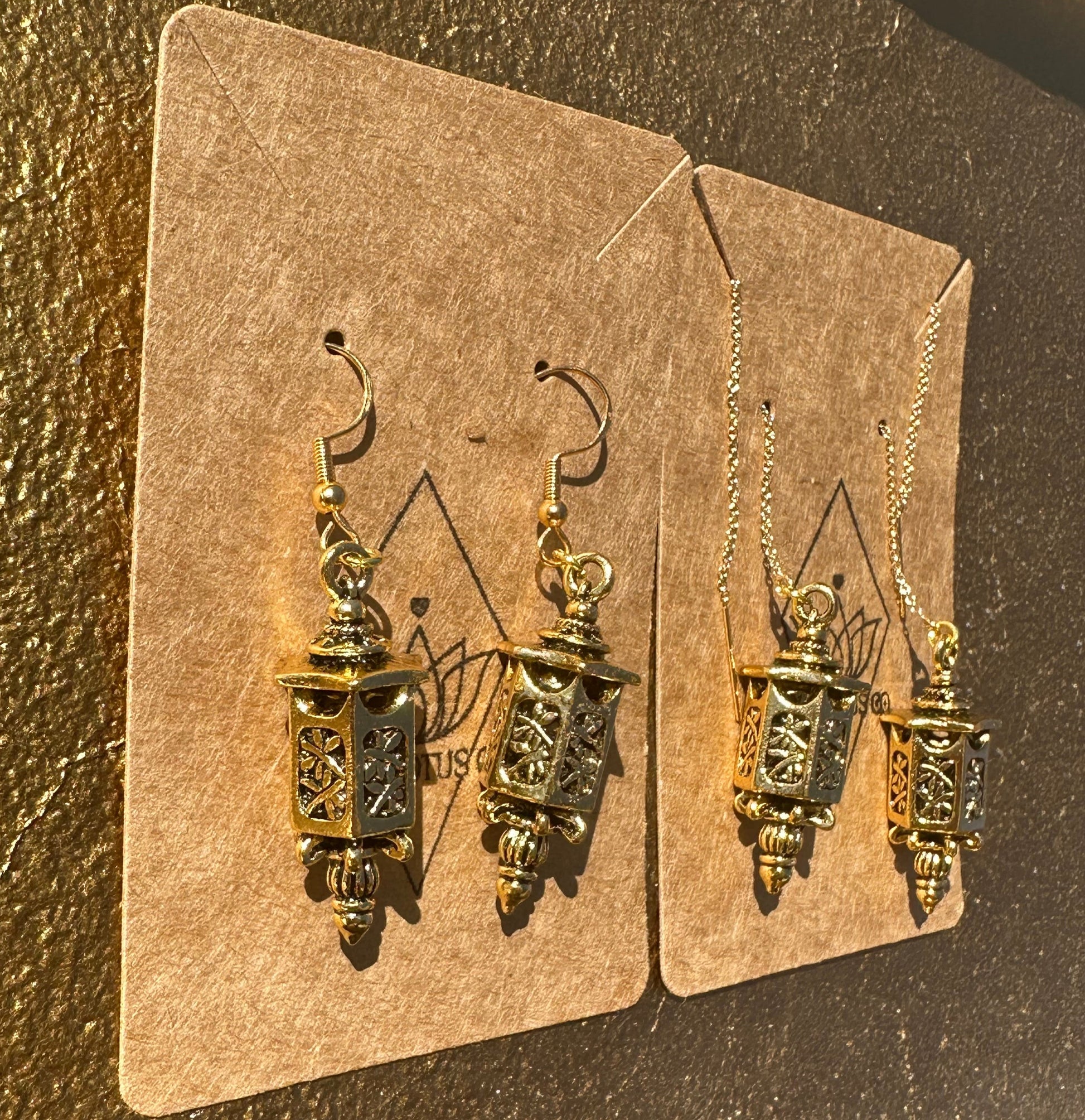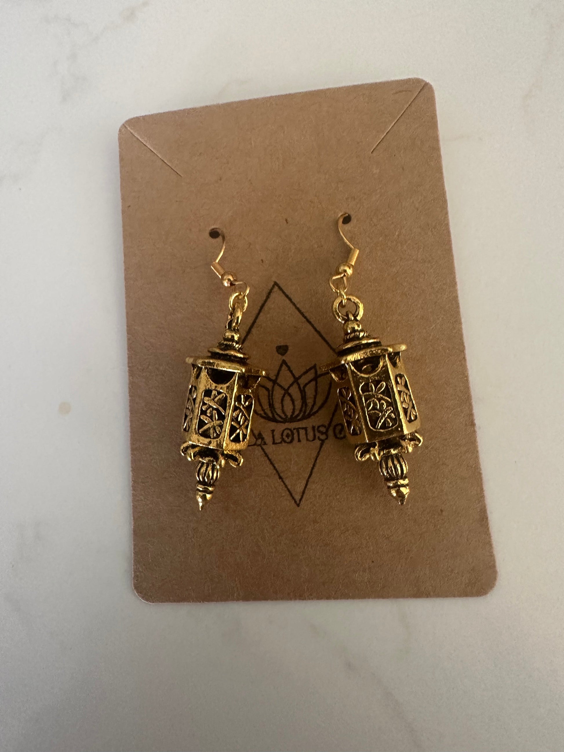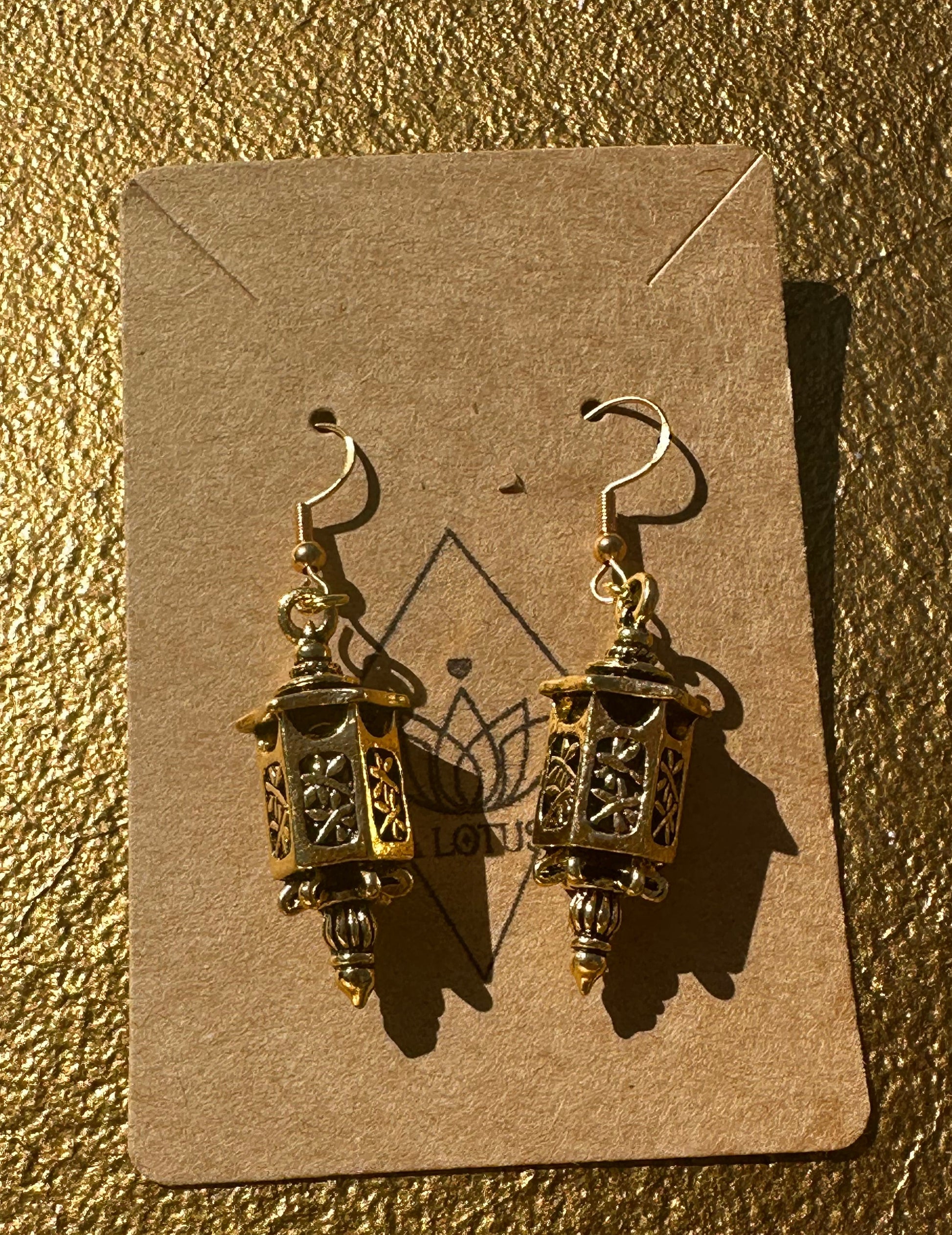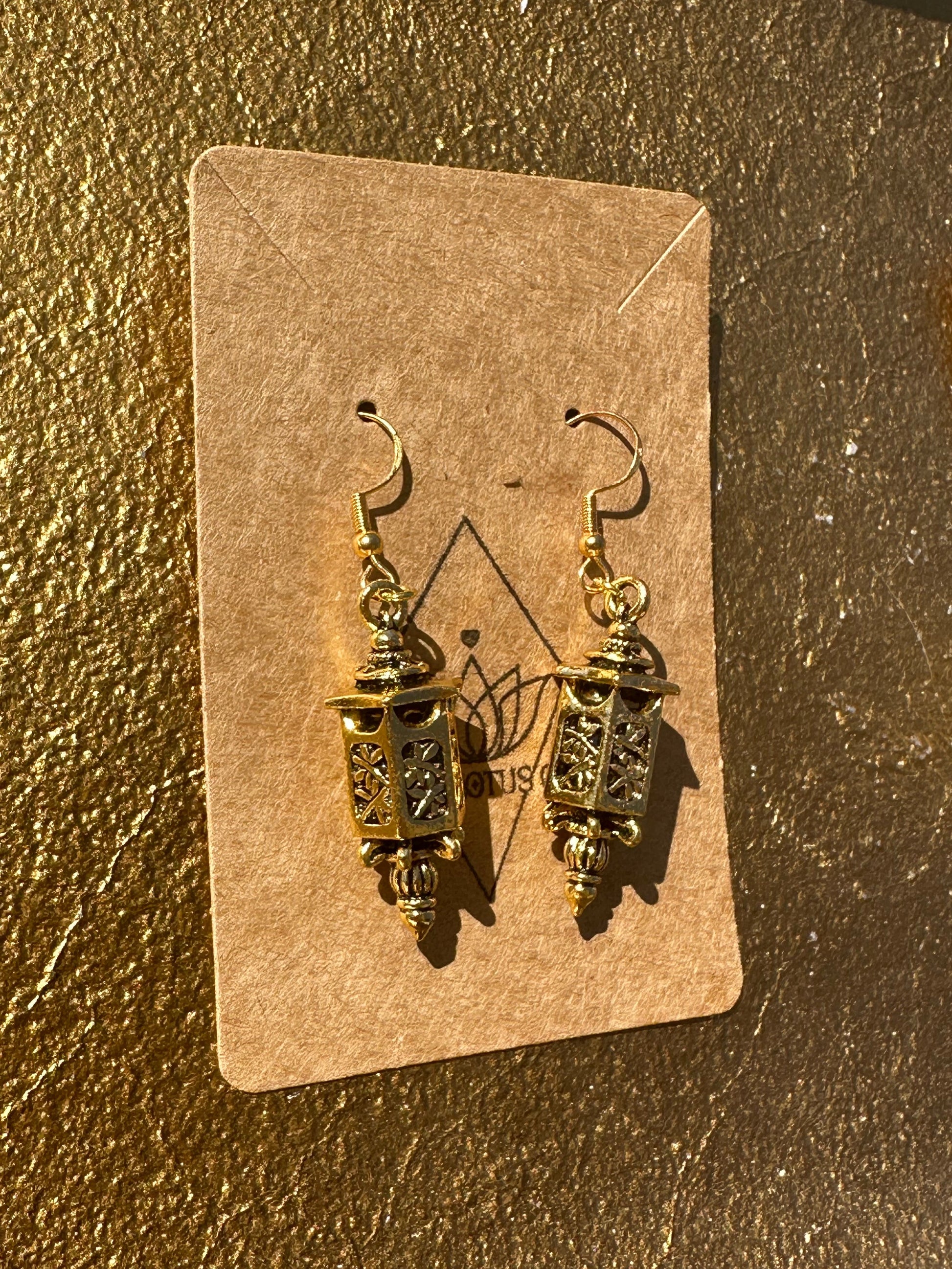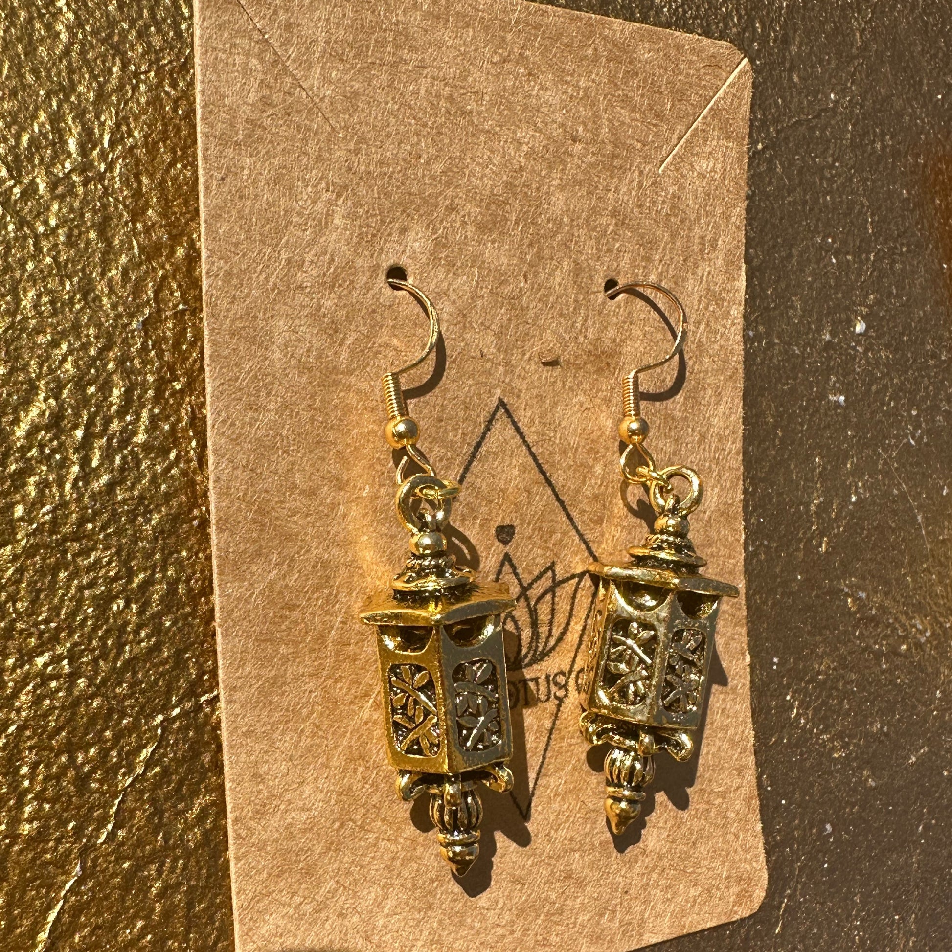 Introducing the Golden Twilight Lantern Earrings, designed in collaboration with artist Rebekah inspired by her Twilight Lantern community. These handmade earrings, featuring ornate golden lanterns, are available in two designs - the shorter dangle at 2 inches and the longer threader at 5 inches, providing adjustable length options. Each set comes with earring backs. Please note, the longer threader design may feel heavier than the dangle design. Infused with Reiki blessings, these earrings are truly magical.