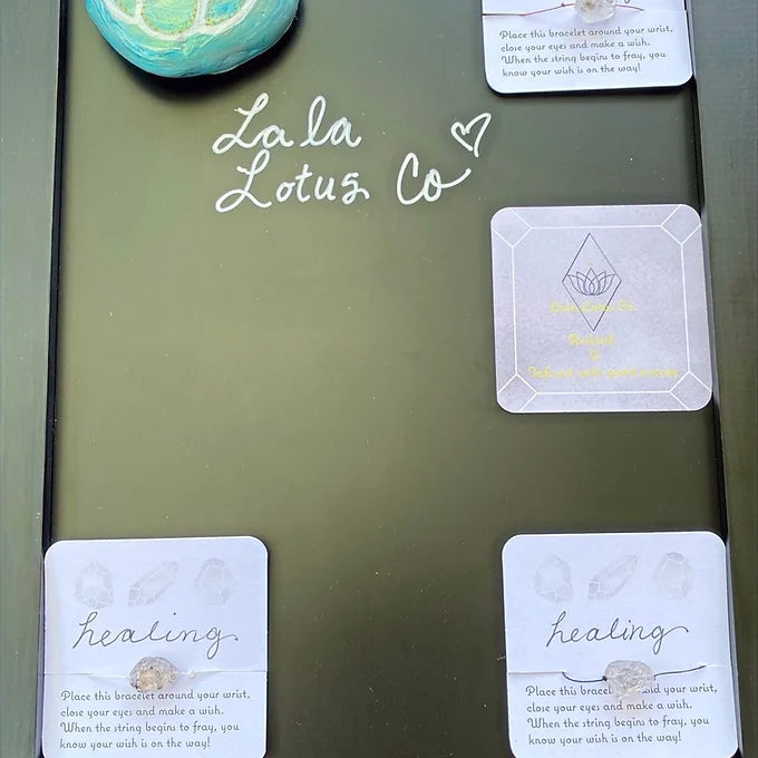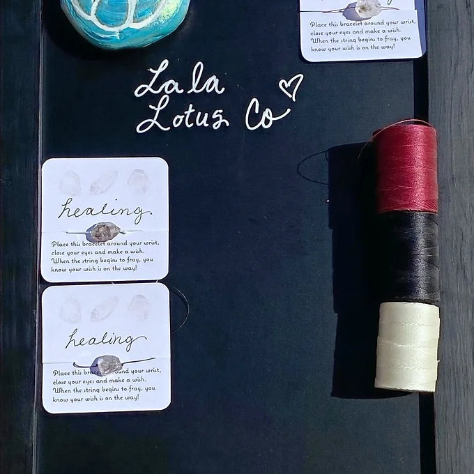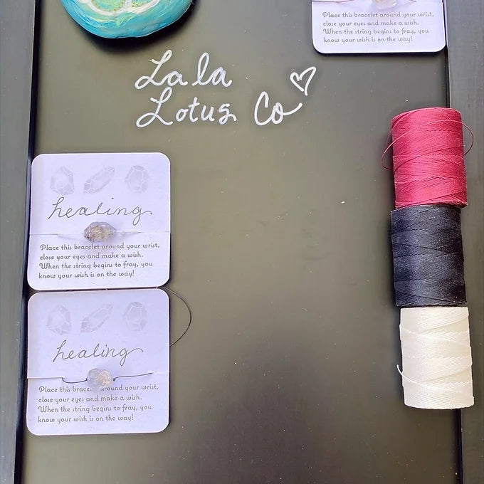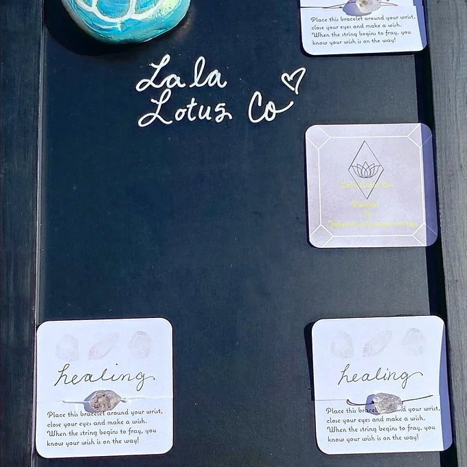 Herkimer Diamond wish bracelets come in three colors: black, burgundy, and white.Place this bracelet around your wrist, close your eyes and make a wish. When the string begins to fray, you know your wish is on the way! These bracelets have been infused with good energy and reikied by certified masters. Herkimer Diamond- Herkimer Diamonds are the most powerful of all Quartz crystals. Being doubly terminated, they have the ability to not only transmit their own energies, but to receive spiritual energy and to amplify and focus it intently. Herkimer Diamond is useful in chakra healing and balancing energy. Herkimer Diamond, with its pure, crystal light, clears the chakras, opening channels for spiritual energy to flow. It stimulates conscious attunement to the highest level, and is particularly helpful in activating and opening the Crown and Third Eye Chakras.If you would like to place a custom order, have any comments, questions, or concerns please reach out. Email: Lalalotusco@gmail.comPlease note: these bracelets are designed to break eventually so they are made with a very thin cord. Wish bracelets can be used as an excellent manifestation tool!