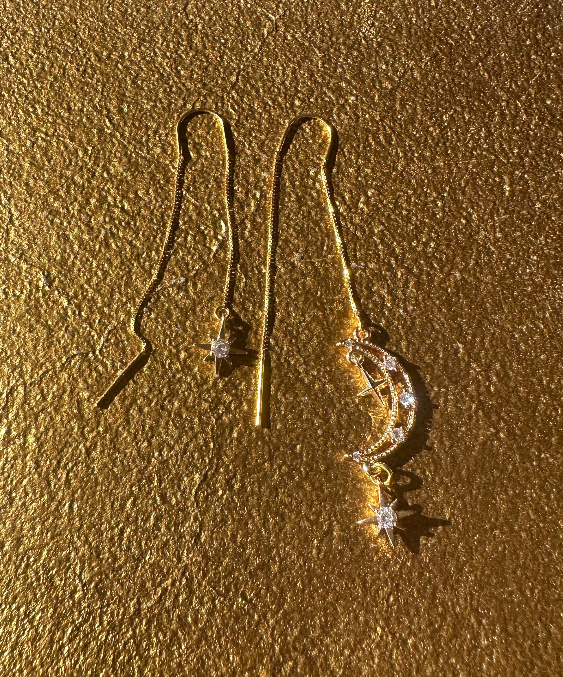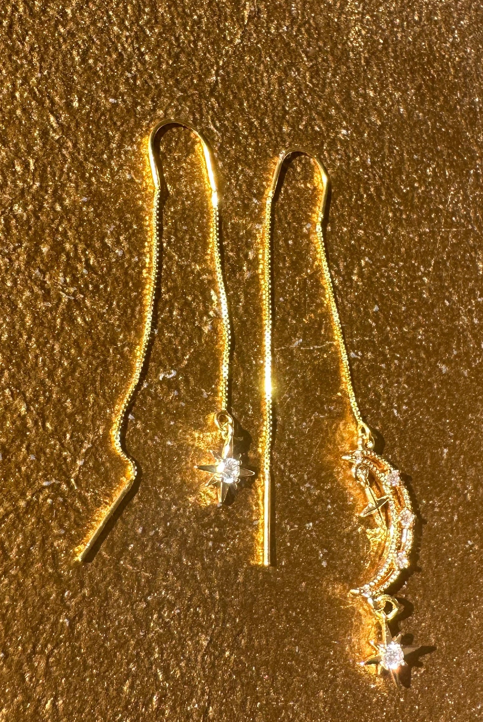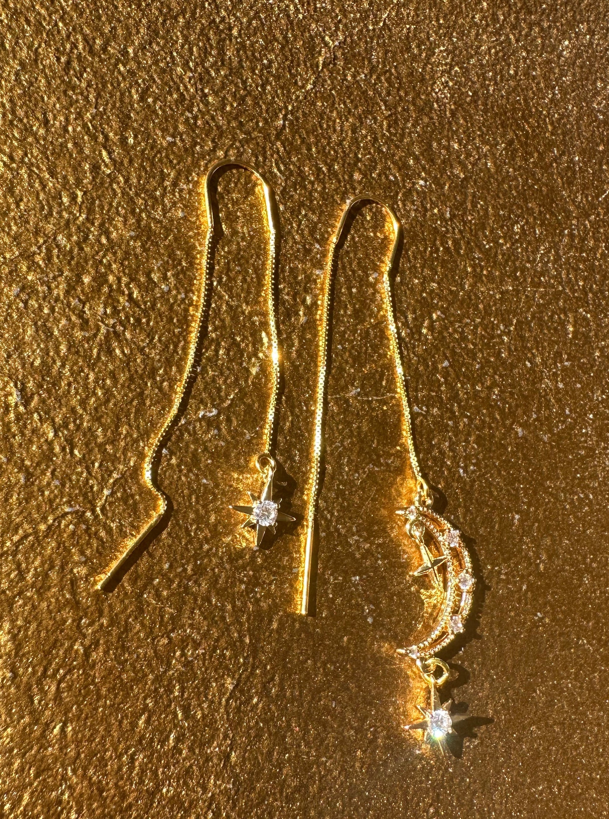 Introducing our signature Gold Celestial Threader Earrings. Handcrafted design inspired by astrology and celestial symbolism. Crafted from high quality sterling silver with gold filled materials, these threader earrings measure approximately 4 inches in total length, draping to about 2 inches when worn. The asymmetrical design showcases an ornate cubic zirconia star paired with a bejeweled moon accented by delicate star details, creating a sophisticated statement piece that captures the magic of the night sky.
