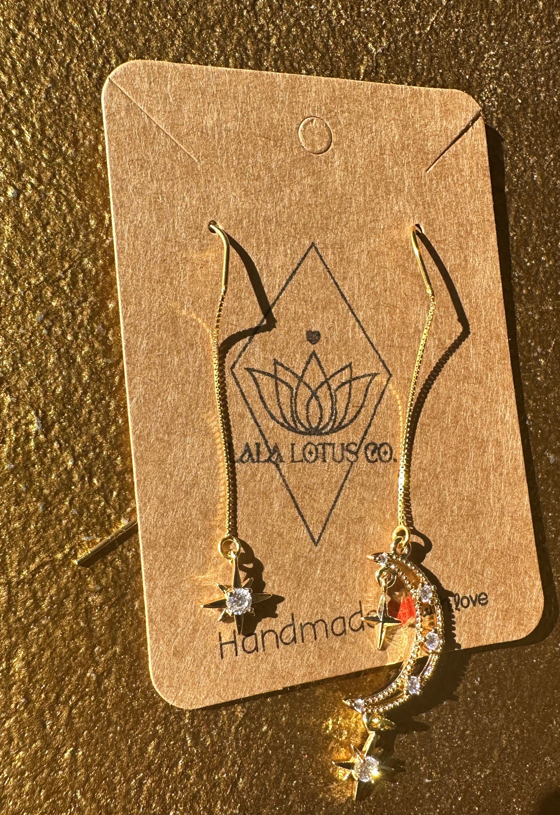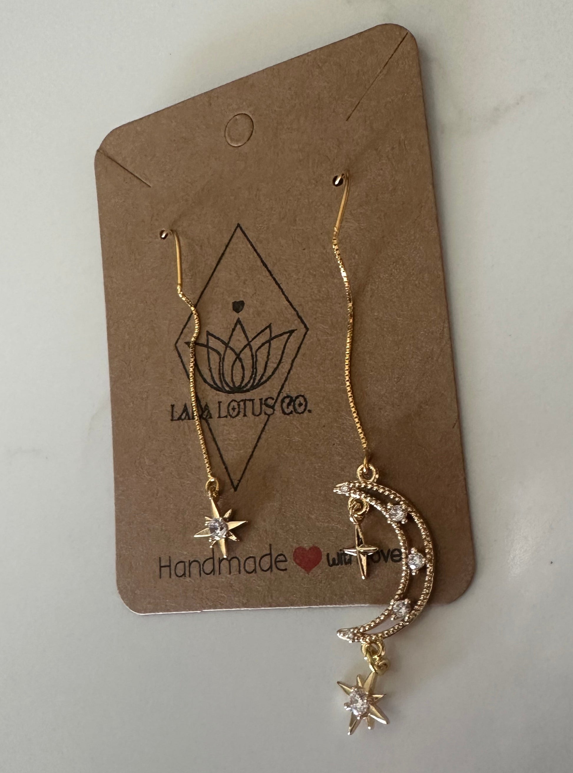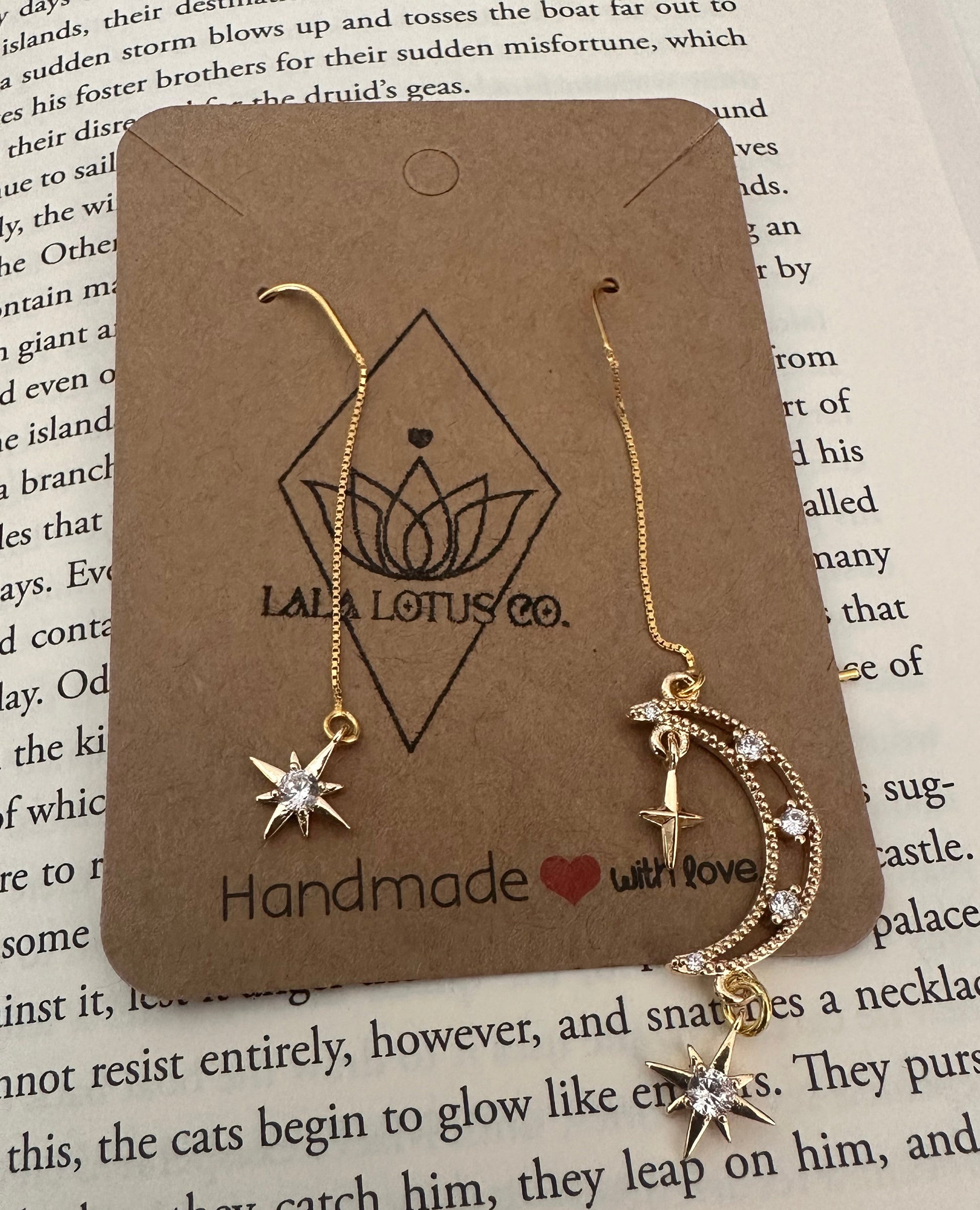 Introducing our signature Gold Celestial Threader Earrings. Handcrafted design inspired by astrology and celestial symbolism. Crafted from high quality sterling silver with gold filled materials, these threader earrings measure approximately 4 inches in total length, draping to about 2 inches when worn. The asymmetrical design showcases an ornate cubic zirconia star paired with a bejeweled moon accented by delicate star details, creating a sophisticated statement piece that captures the magic of the night sky.