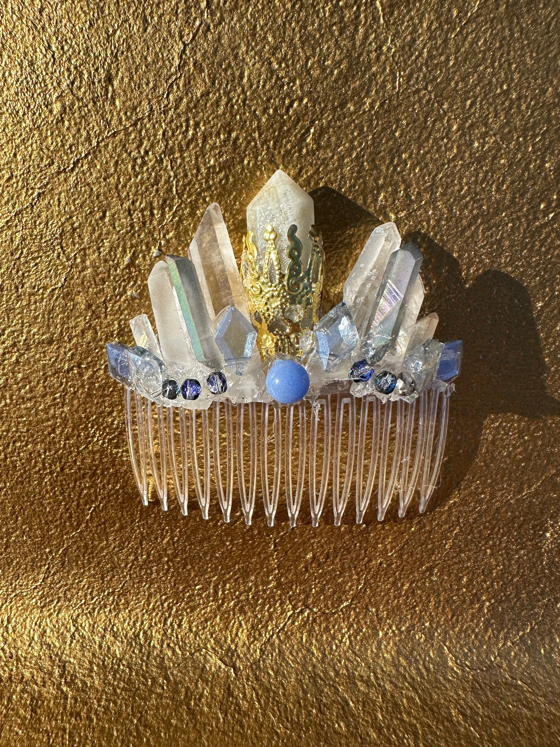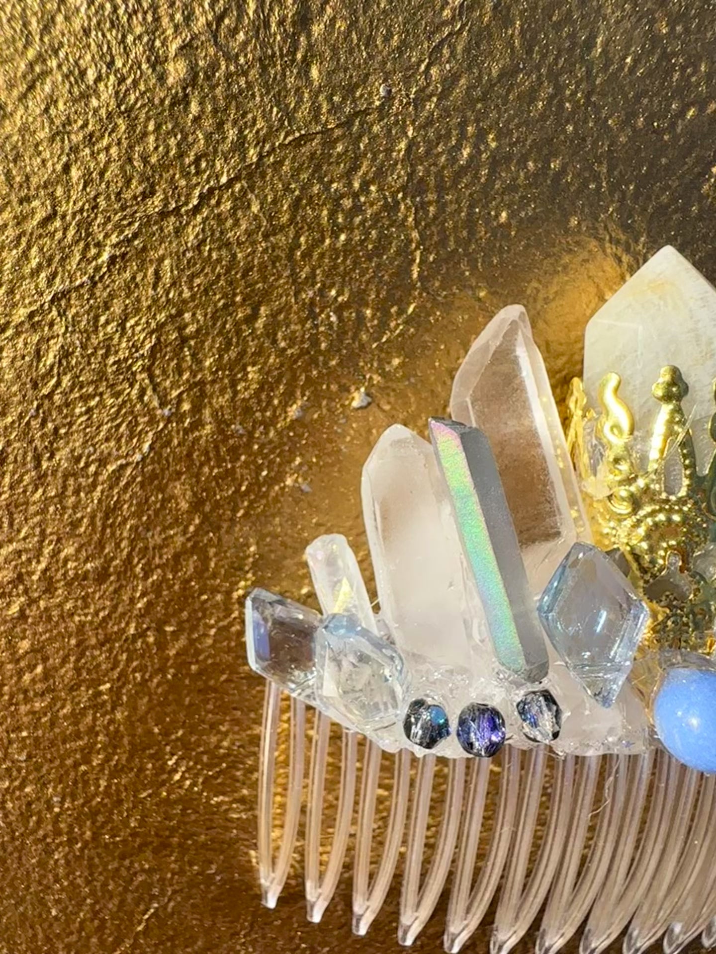 Introducing the Phantom (Glow) Hair Comb, a beautifully handcrafted and blessed statement piece by a certified energy healing and reiki master. Embedded with precious stones such as moonstone, titanium quartz, clear quartz, and blue aragonite, these hair combs also feature elegant Gold filigree. Please handle with care as the materials are delicate. Each hair comb has been blessed by a certified reiki master.