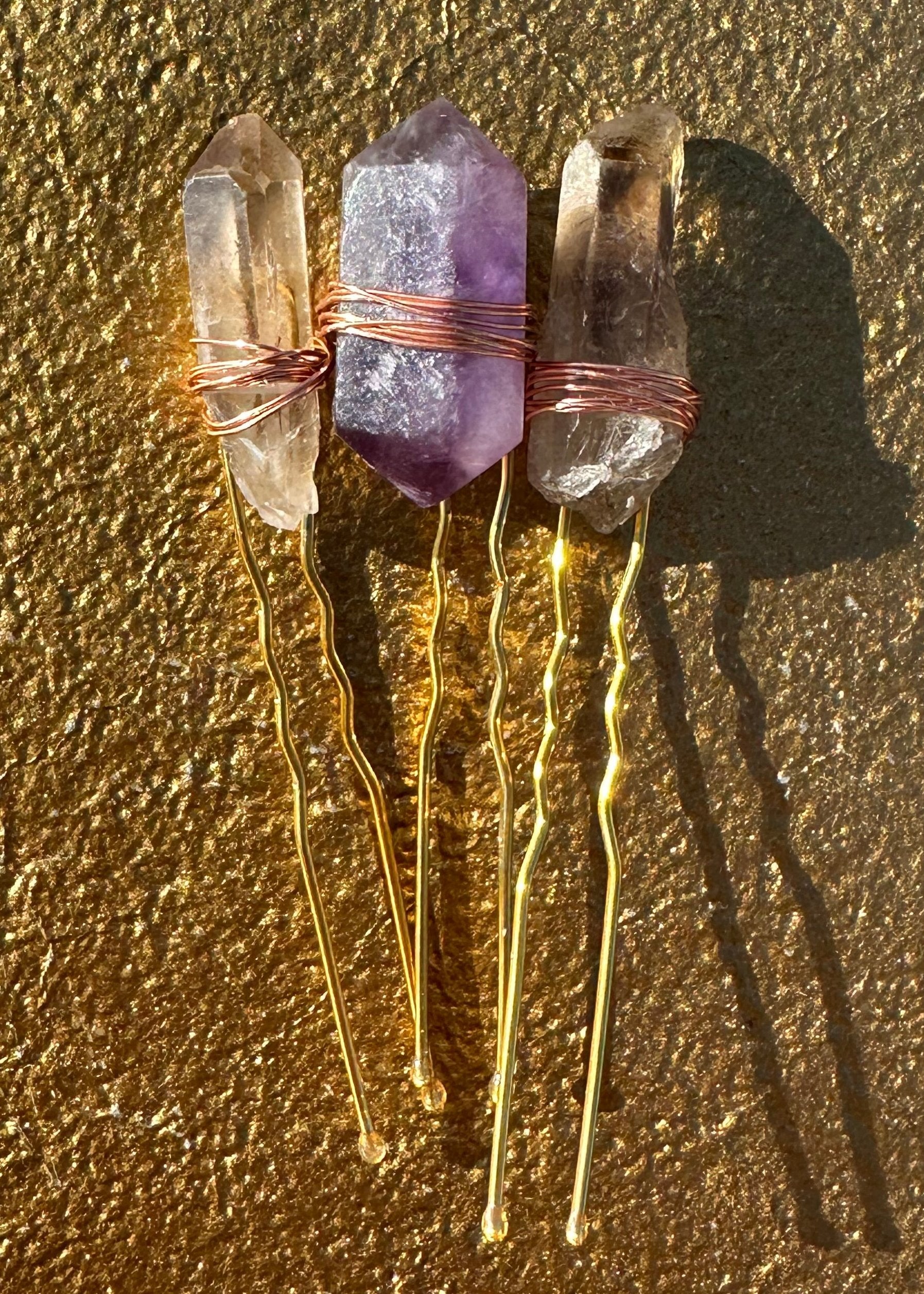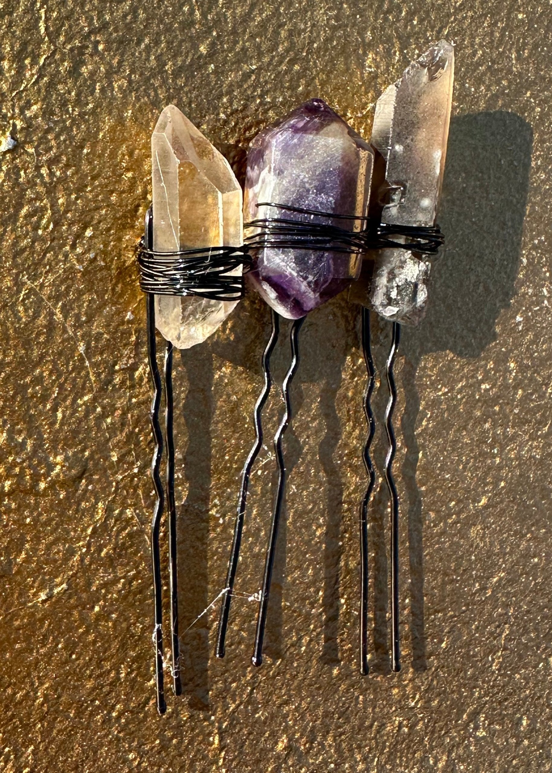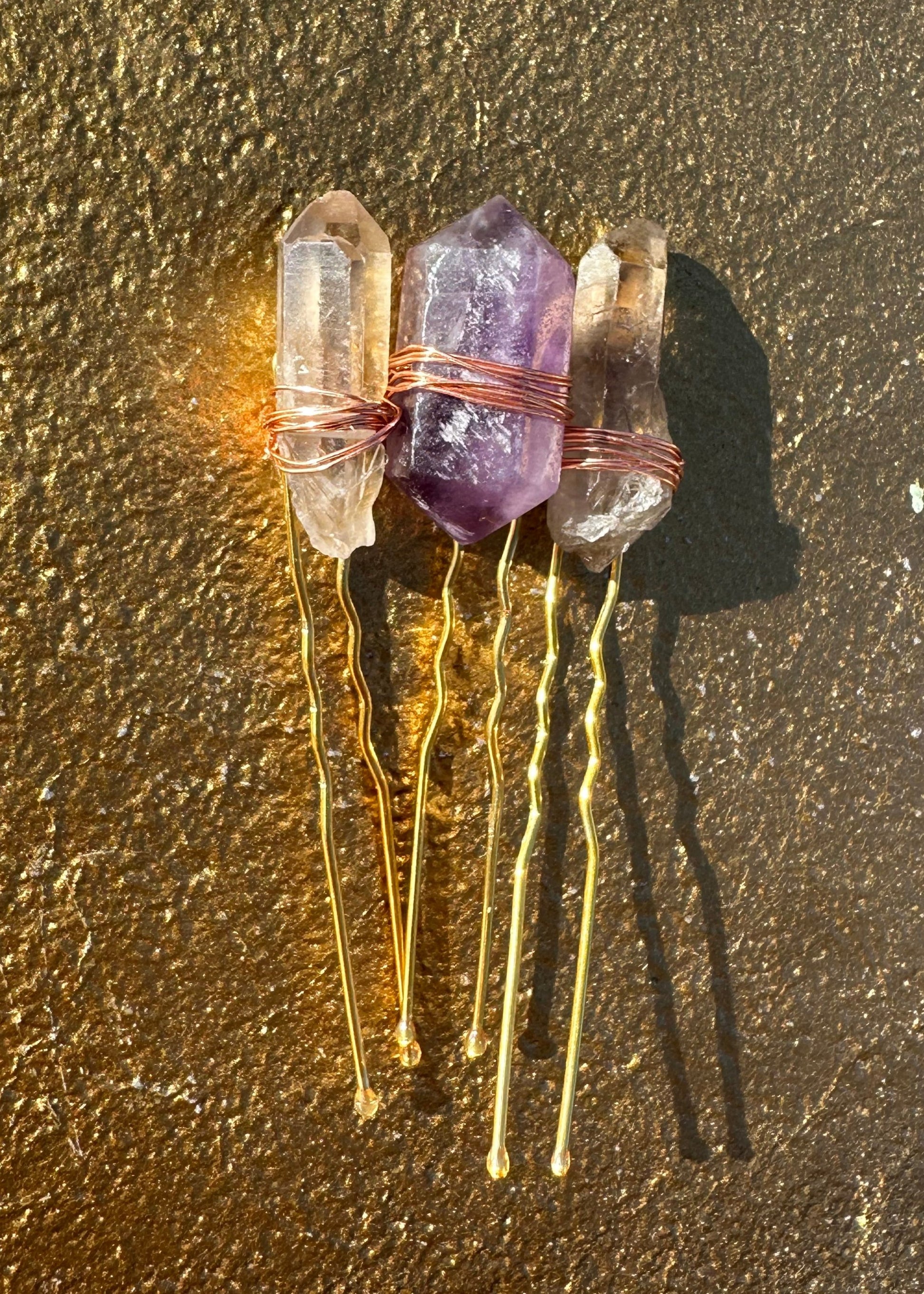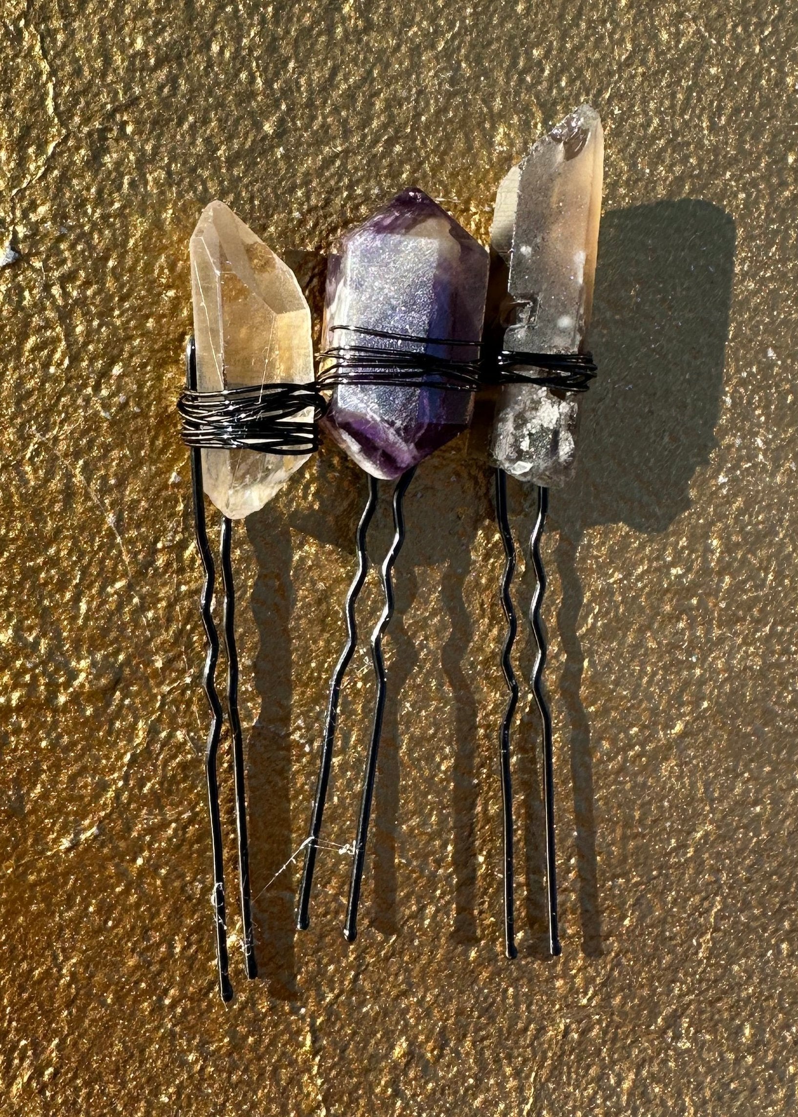 Introducing the seasonal Intuition & Protection Hairpins, available in sets of 3. Handmade and blessed by a certified energy healing and reiki master, these hairpins are versatile and customizable, offering metal color options (Black or Copper) and stone options (Amethyst or Moonstone). Each set also comes with 2 smoky quartz hairpins, adding an extra touch of magic to any updo. Perfect for elevating your hairstyle with a touch of enchantment.