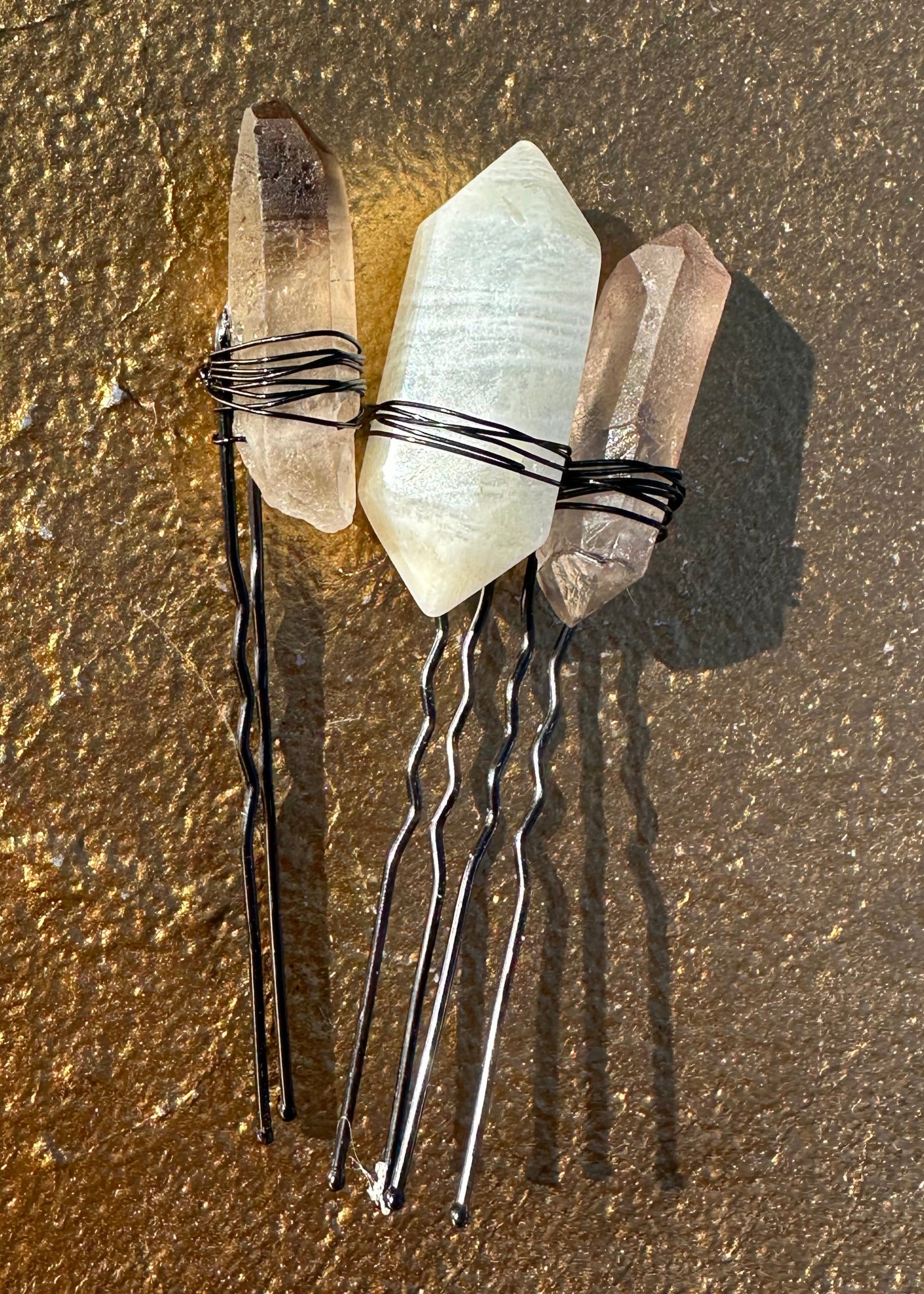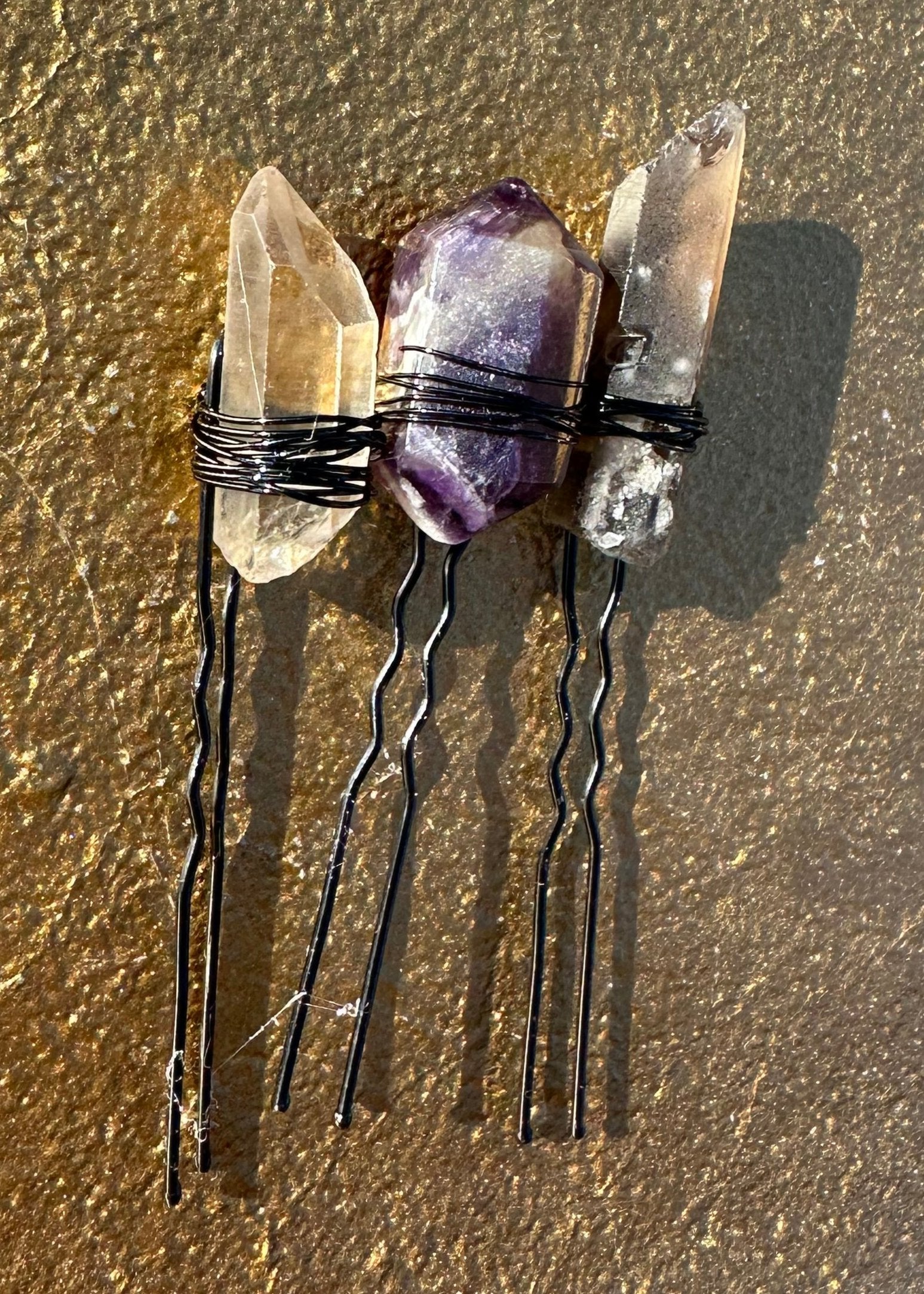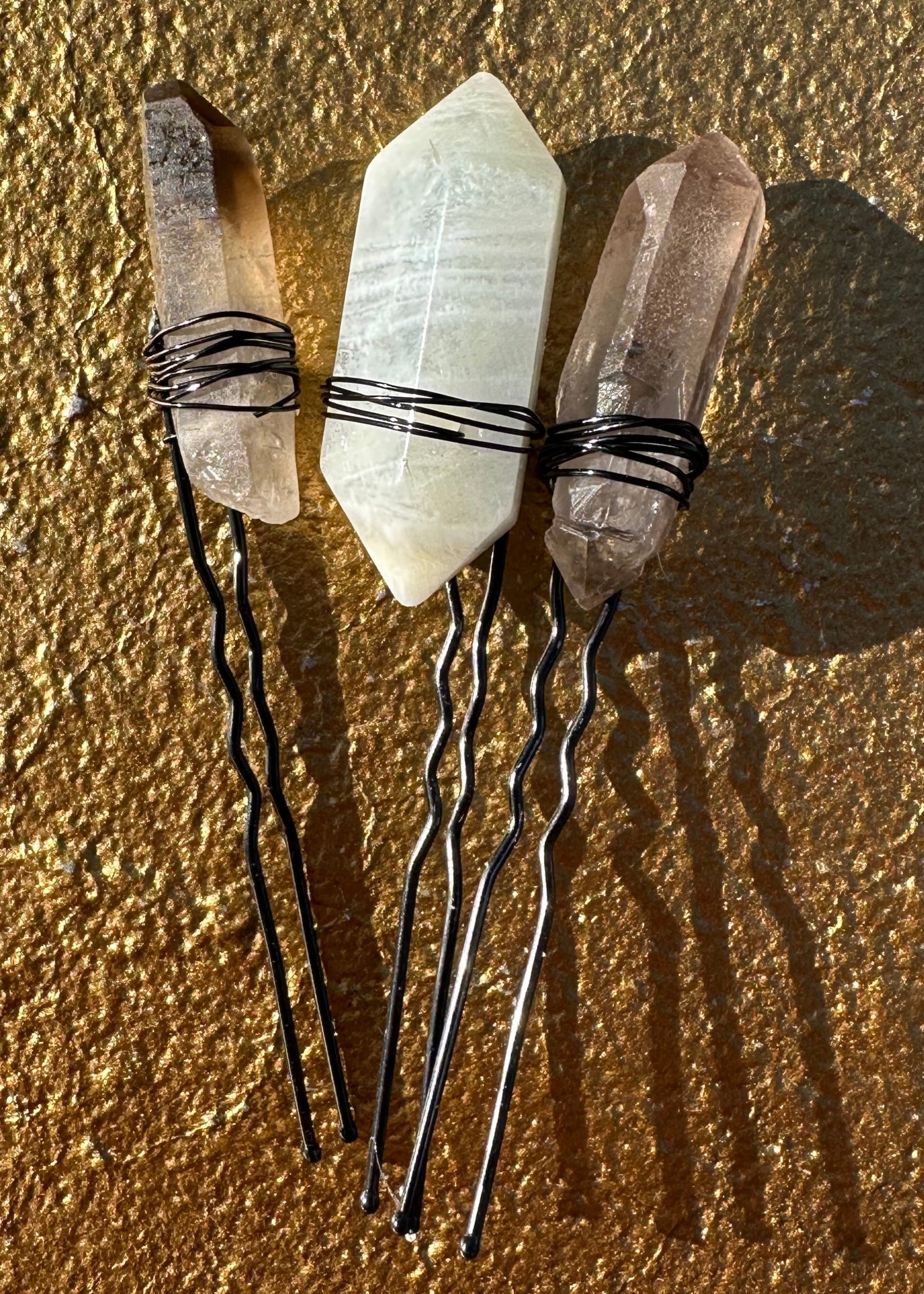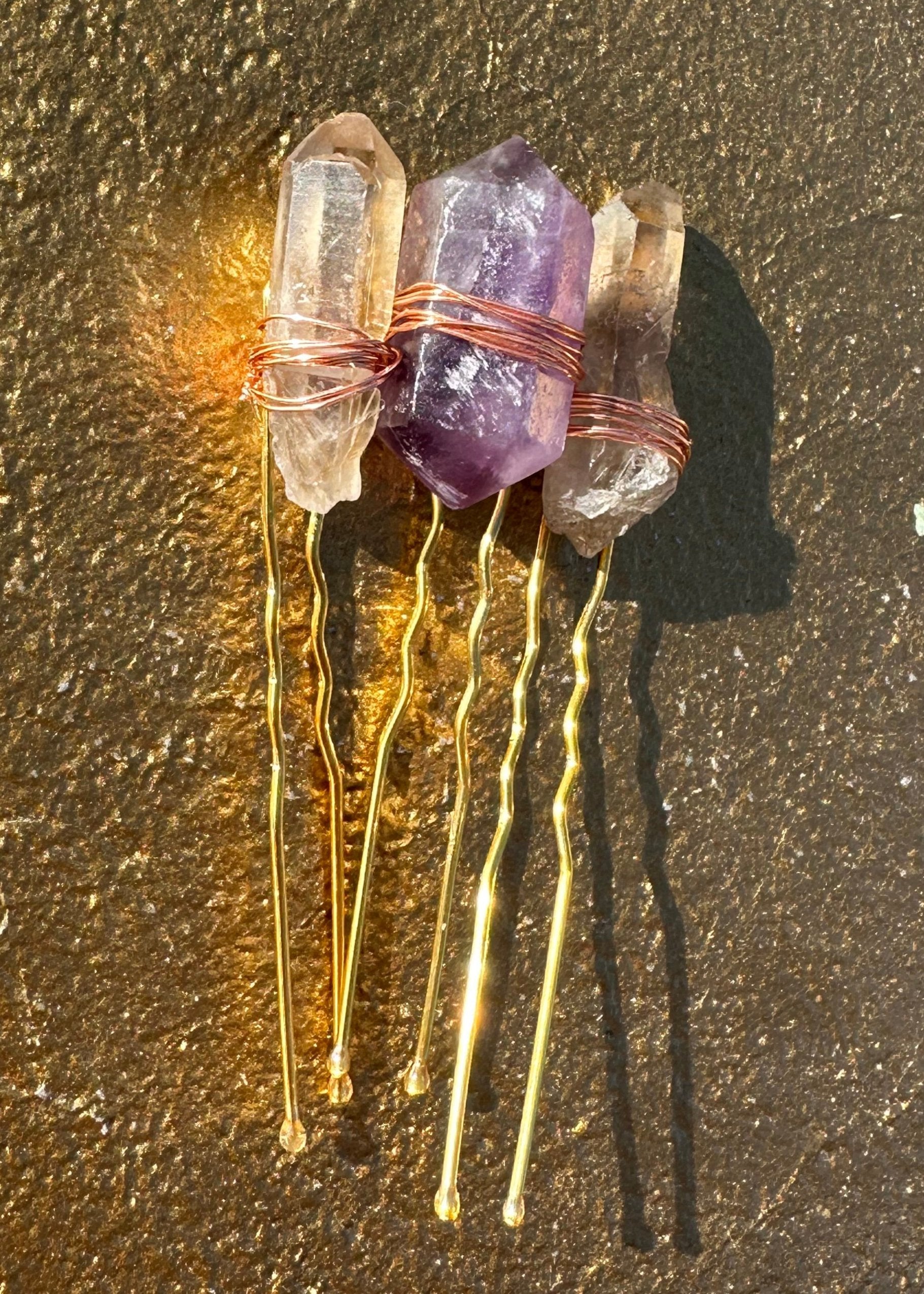 Introducing the seasonal Intuition & Protection Hairpins, available in sets of 3. Handmade and blessed by a certified energy healing and reiki master, these hairpins are versatile and customizable, offering metal color options (Black or Copper) and stone options (Amethyst or Moonstone). Each set also comes with 2 smoky quartz hairpins, adding an extra touch of magic to any updo. Perfect for elevating your hairstyle with a touch of enchantment.