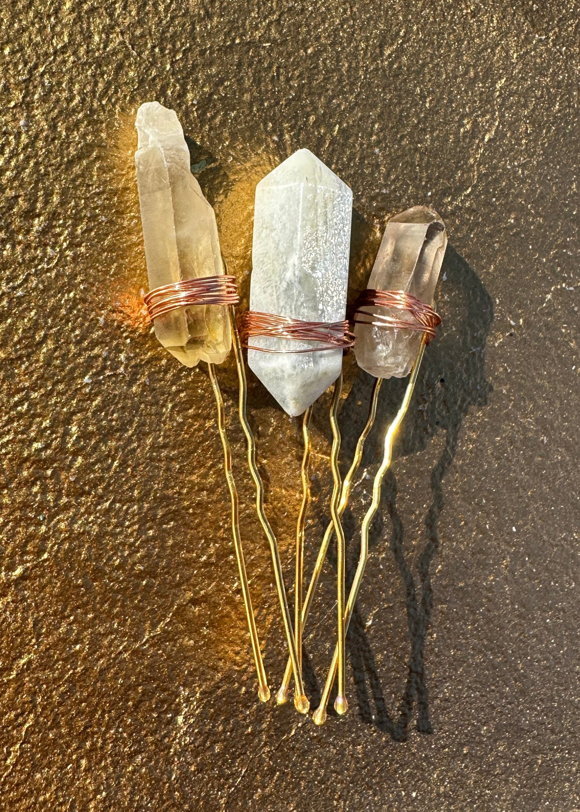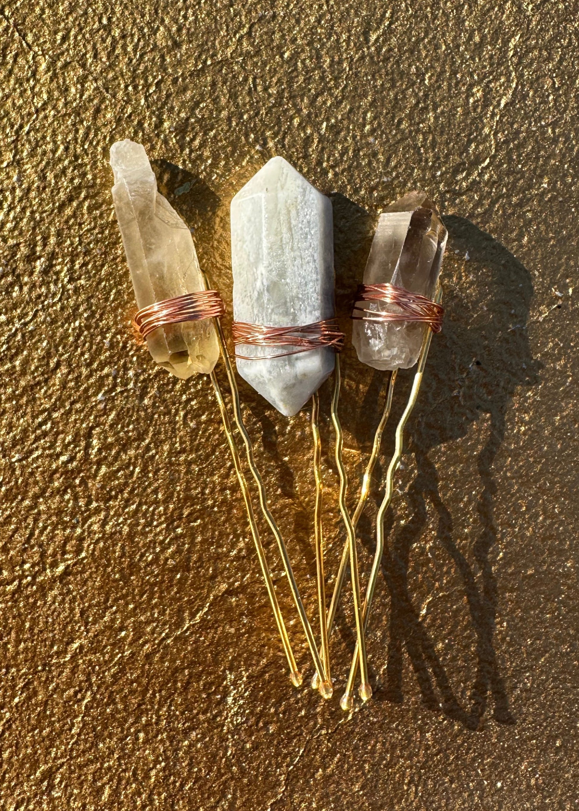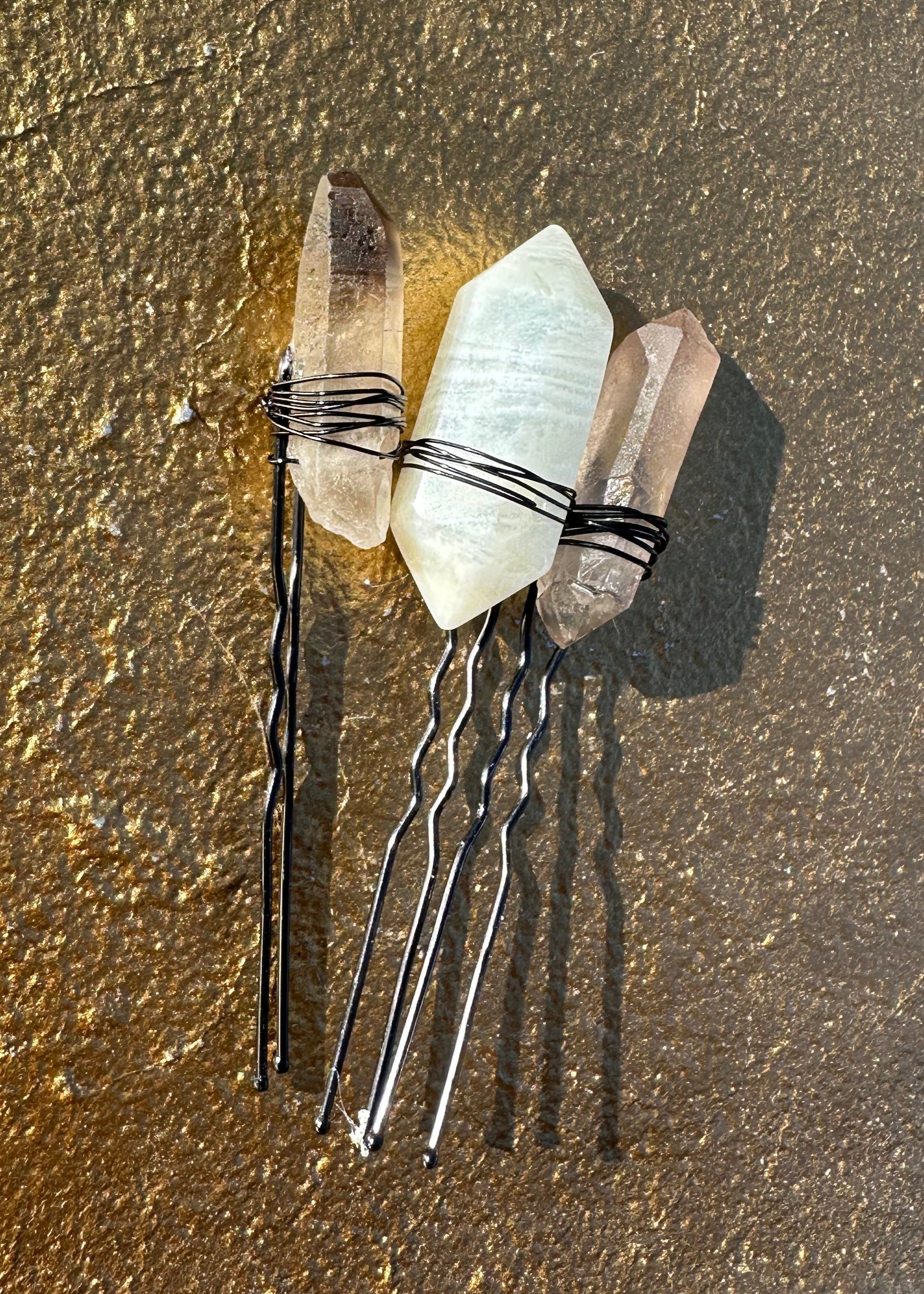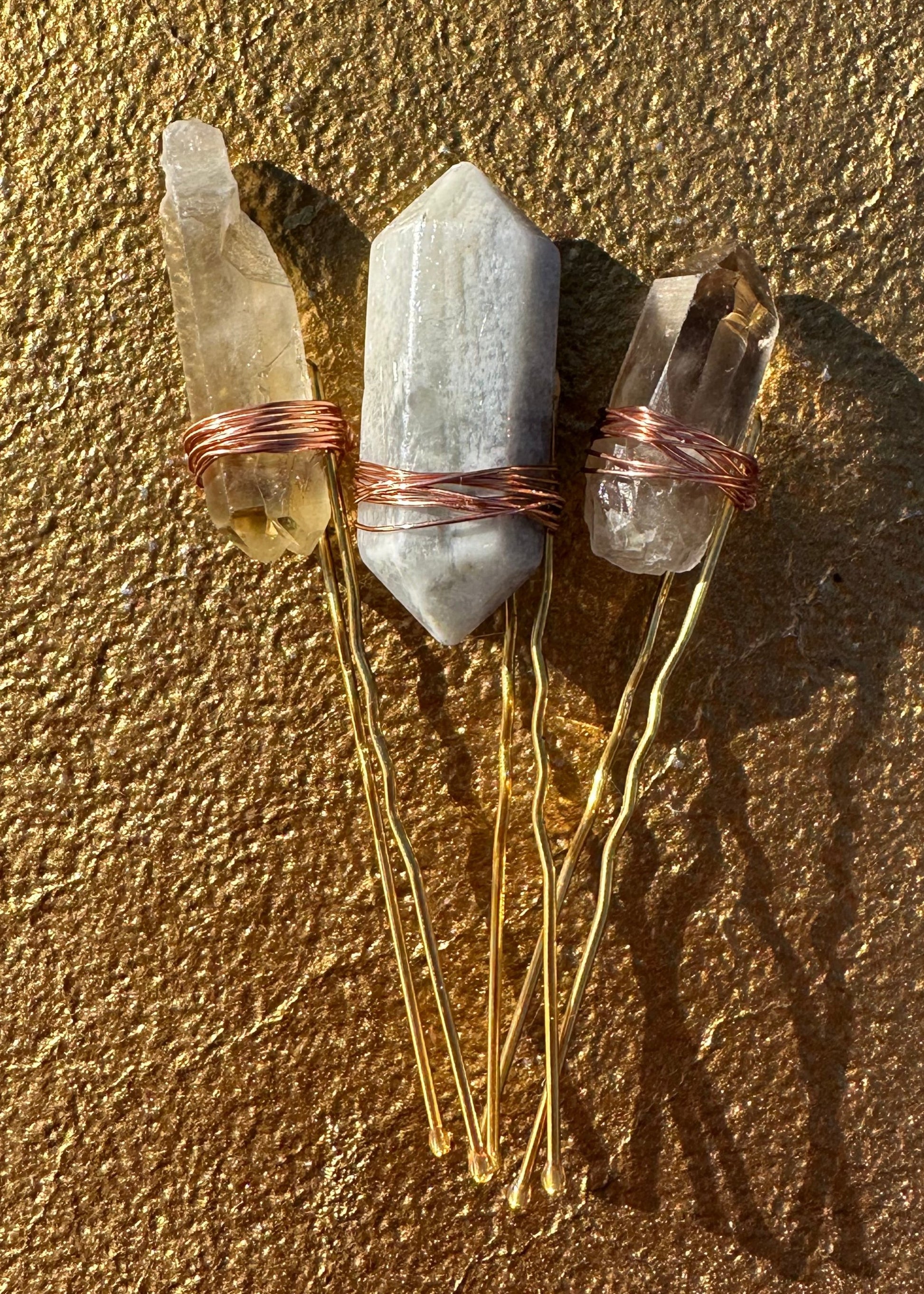 Introducing the seasonal Intuition & Protection Hairpins, available in sets of 3. Handmade and blessed by a certified energy healing and reiki master, these hairpins are versatile and customizable, offering metal color options (Black or Copper) and stone options (Amethyst or Moonstone). Each set also comes with 2 smoky quartz hairpins, adding an extra touch of magic to any updo. Perfect for elevating your hairstyle with a touch of enchantment.