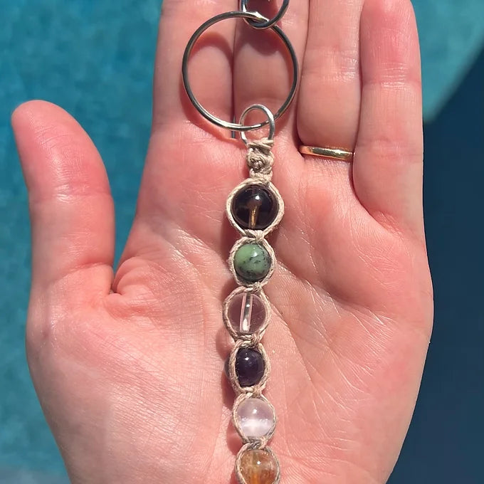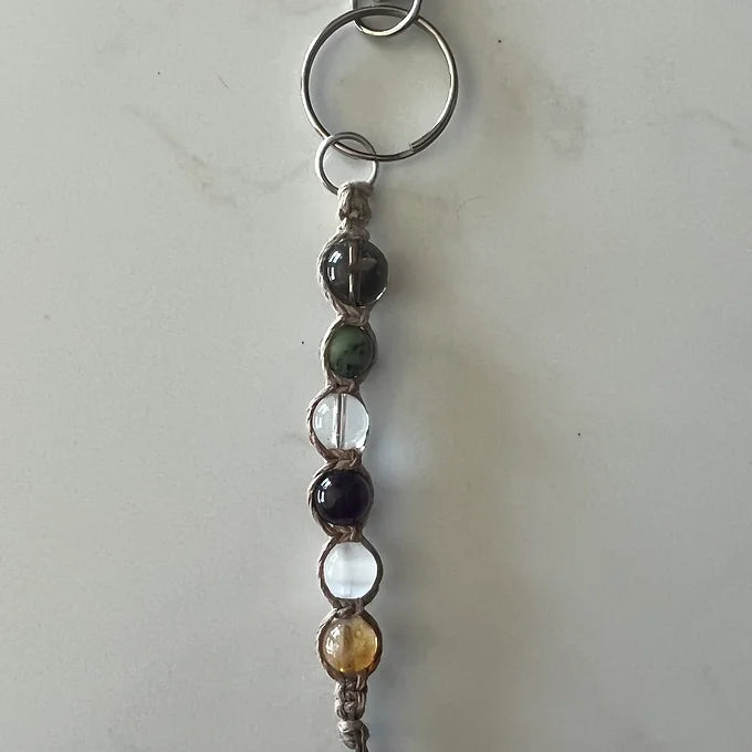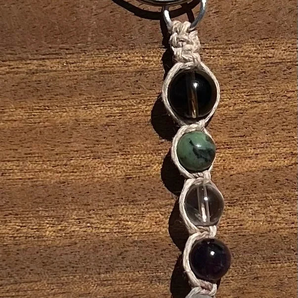 Jimothy’s Adventuring Keychain was inspired by Jimothy’s adventurous spirit. Designed and reikied with the intention of protecting and guiding every adventurer out there, this keychain is handmade on a camo hemp cord. Using the square knot technique, this keychain is about 6 inches in length, including the clasp and jump ring (the knotwork and crystals are about 4 inches). The stones used to create this uniquely adventurous piece are Smoky Quartz, Green Jade, Clear Quartz, Amethyst, Selenite, and Citrine.