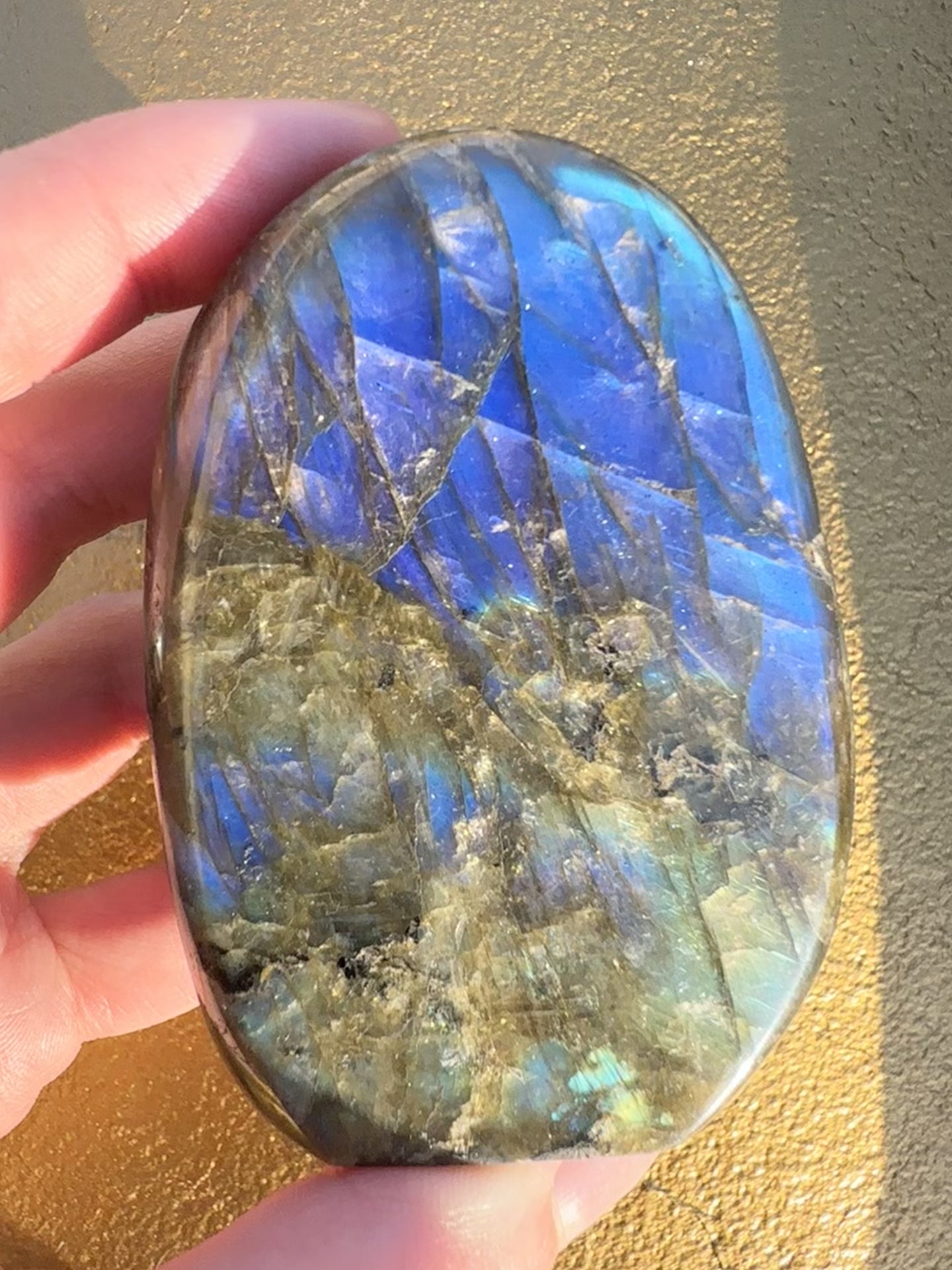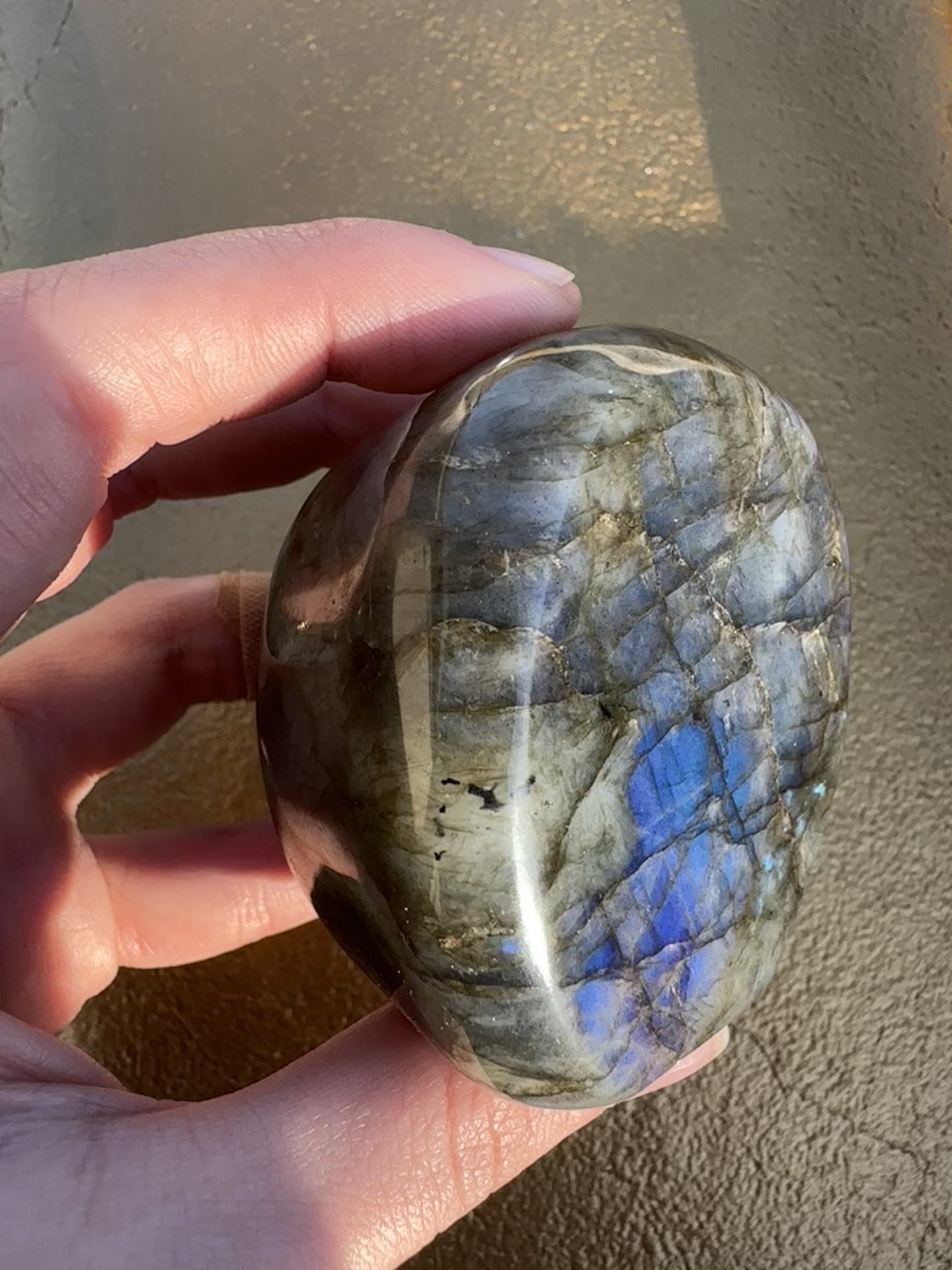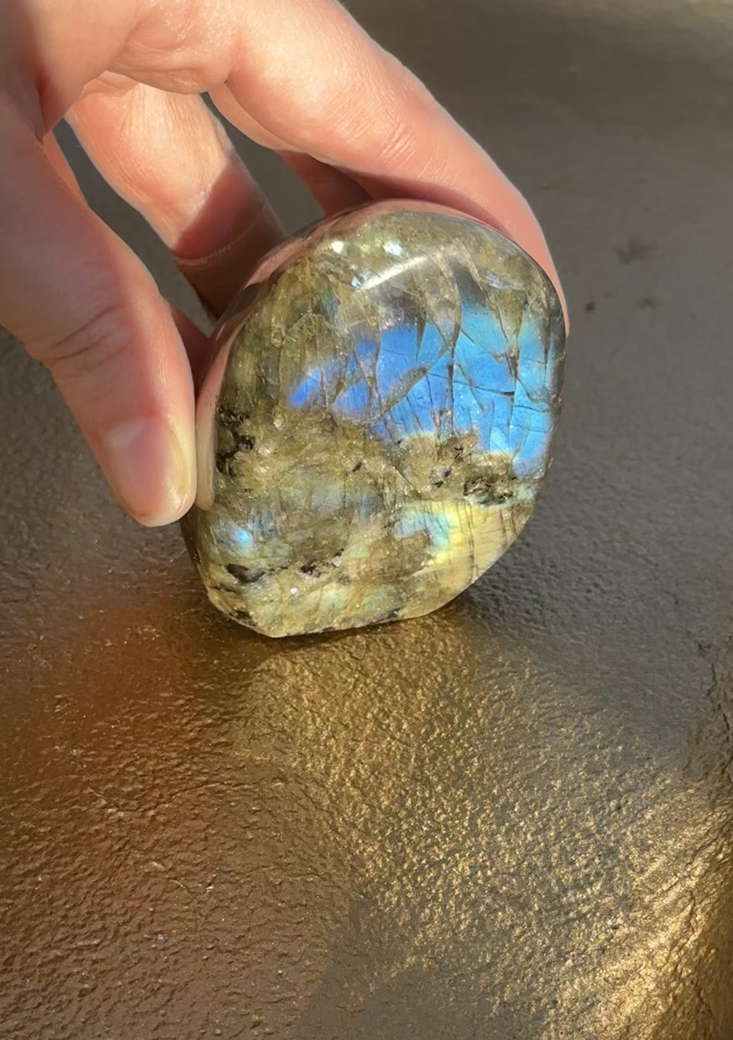 This listing offers a choice of 1 Labradorite Freeform. The available Labradorite free forms vary in size, with the 228g option being more round and exhibiting a cyan blue flash, while the 190g option has a more oval shape and showcases indigo and purple inclusions.