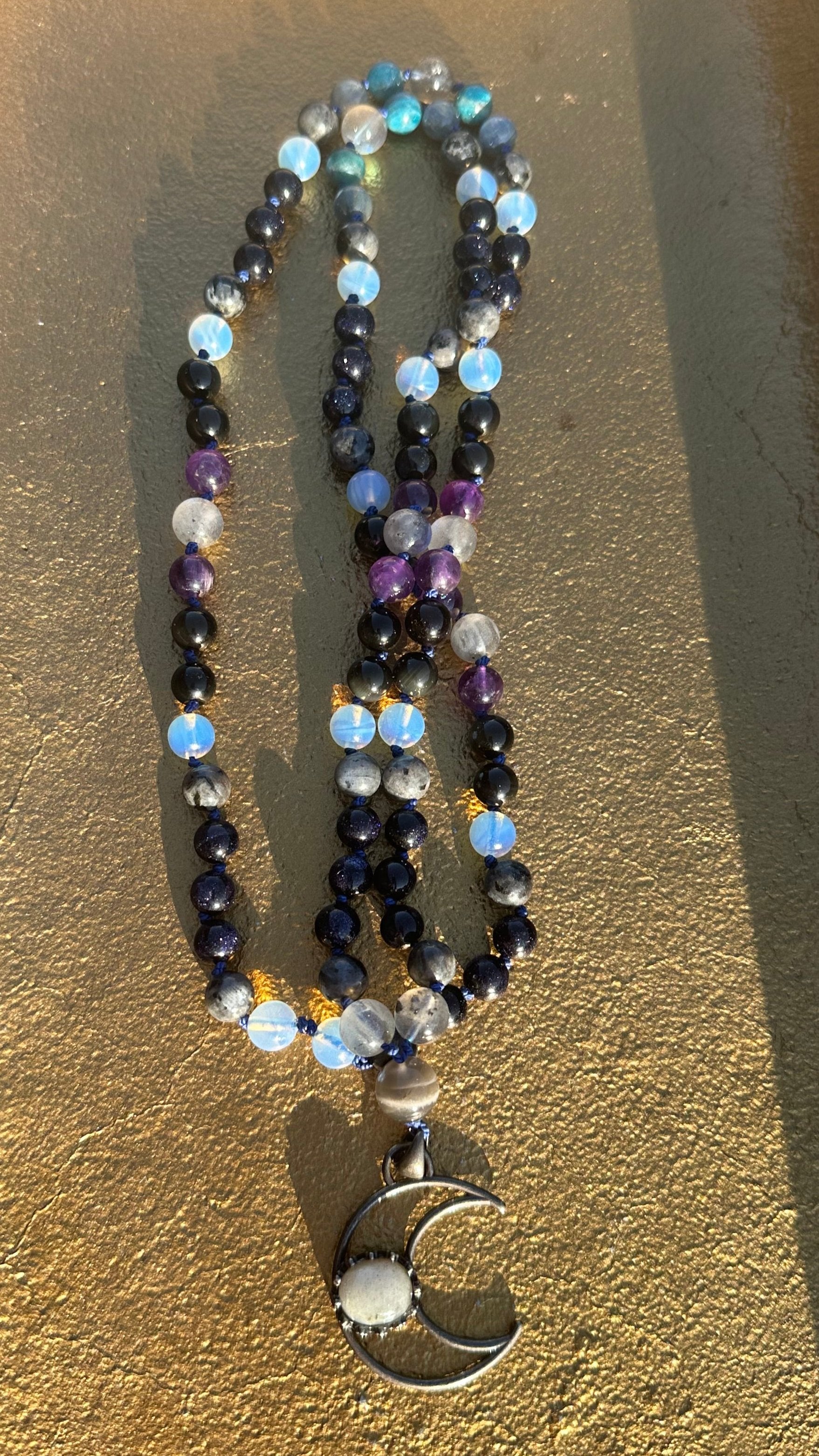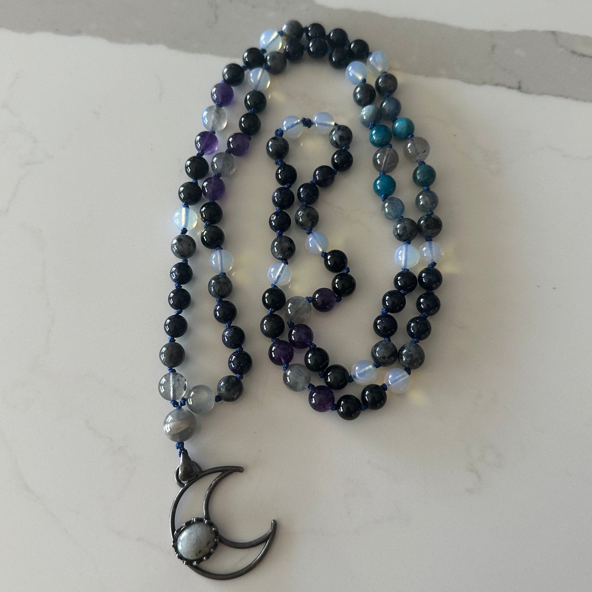 The Third Eye Moon Mala was crafted and blessed by a certified energy healing and reiki expert. It features powerful stones for activating the third eye and enhancing intuition. Strung on a navy blue silk cord, this stunning mala is perfect for cultivating spiritual growth and connecting with spiritual guides. The stones, including Labradorite, Black Moonstone, Blue Goldstone, and more, are thoughtfully chosen to support spiritual development. Measuring 38 inches, this mala can also be worn doubled for added versatility. Note that Blue Goldstone is a manmade crystal.