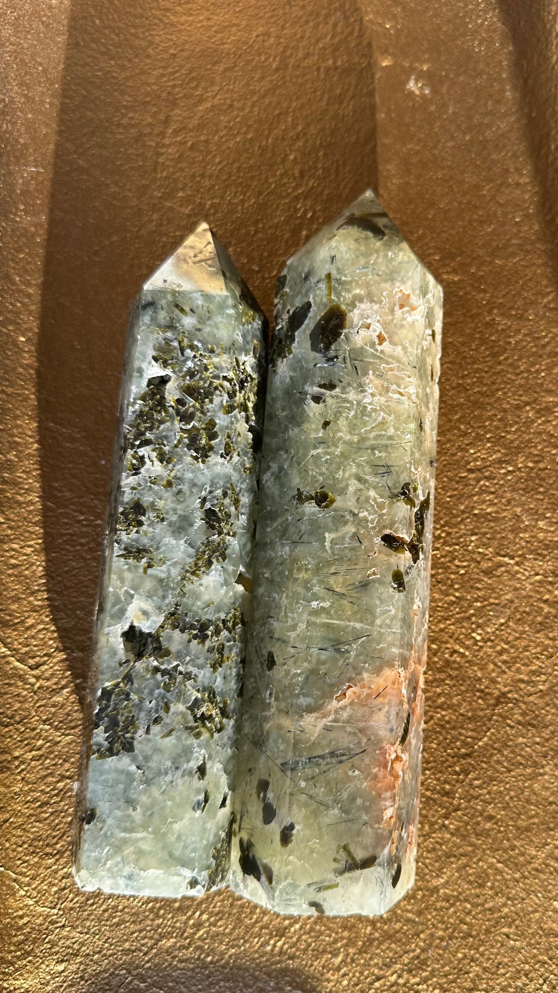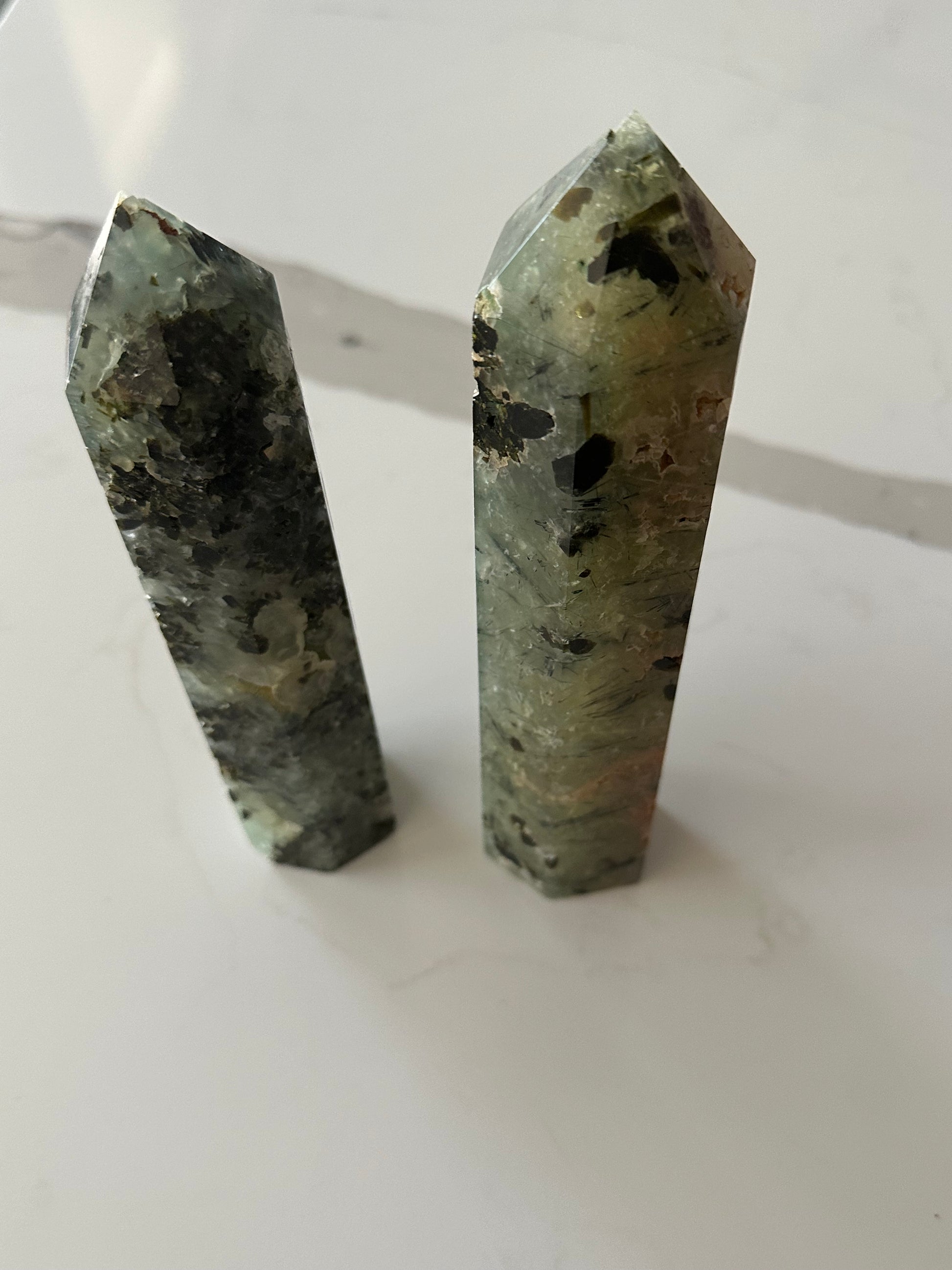 This listing is for 1 Large Reikied Prehnite Tower of your choice. Tower 1 is 6.5 inches high, 2 inches wide, and weighs slightly over a pound. Tower 2 is 7.5 inches high, 3 inches wide, and weighs slightly over 2 pounds.