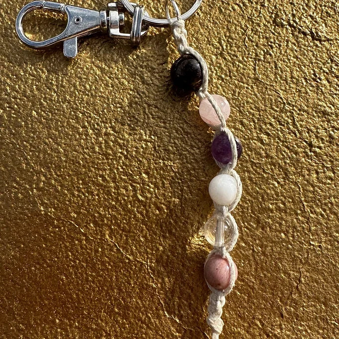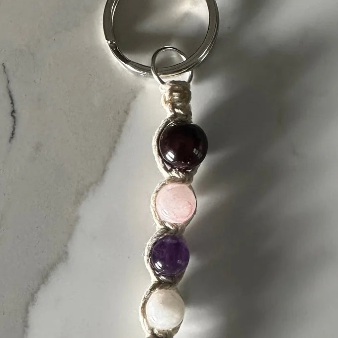 The Love and Healing Keychain was designed and Reikied by a certified Energy Healing and Reiki Master. This unique piece was made with a white cord that glows in the dark. The intentionally selected stones are Garnet, Rose Quartz, Amethyst , Rainbow Moonstone, Clear Quartz, and Rhodochrosite.