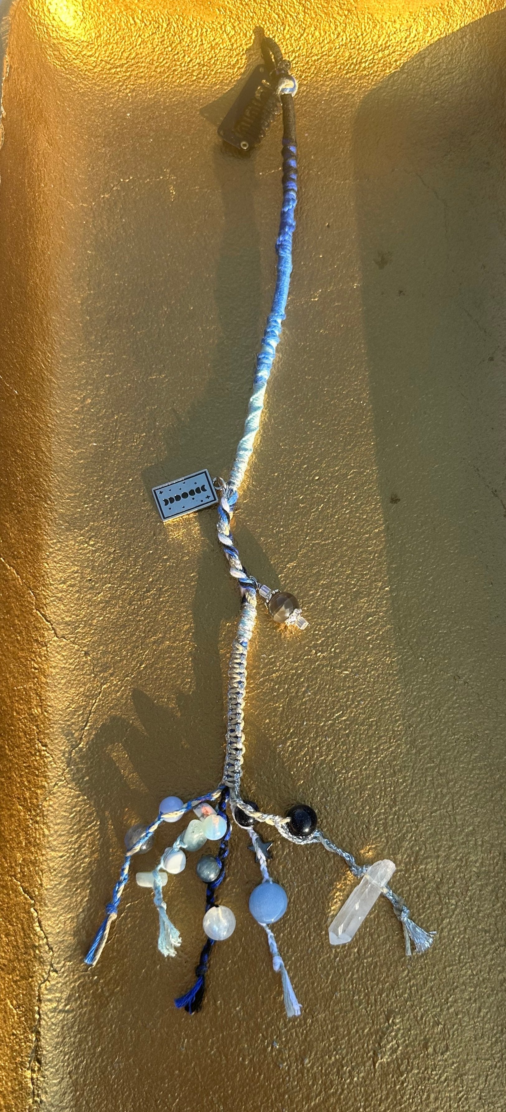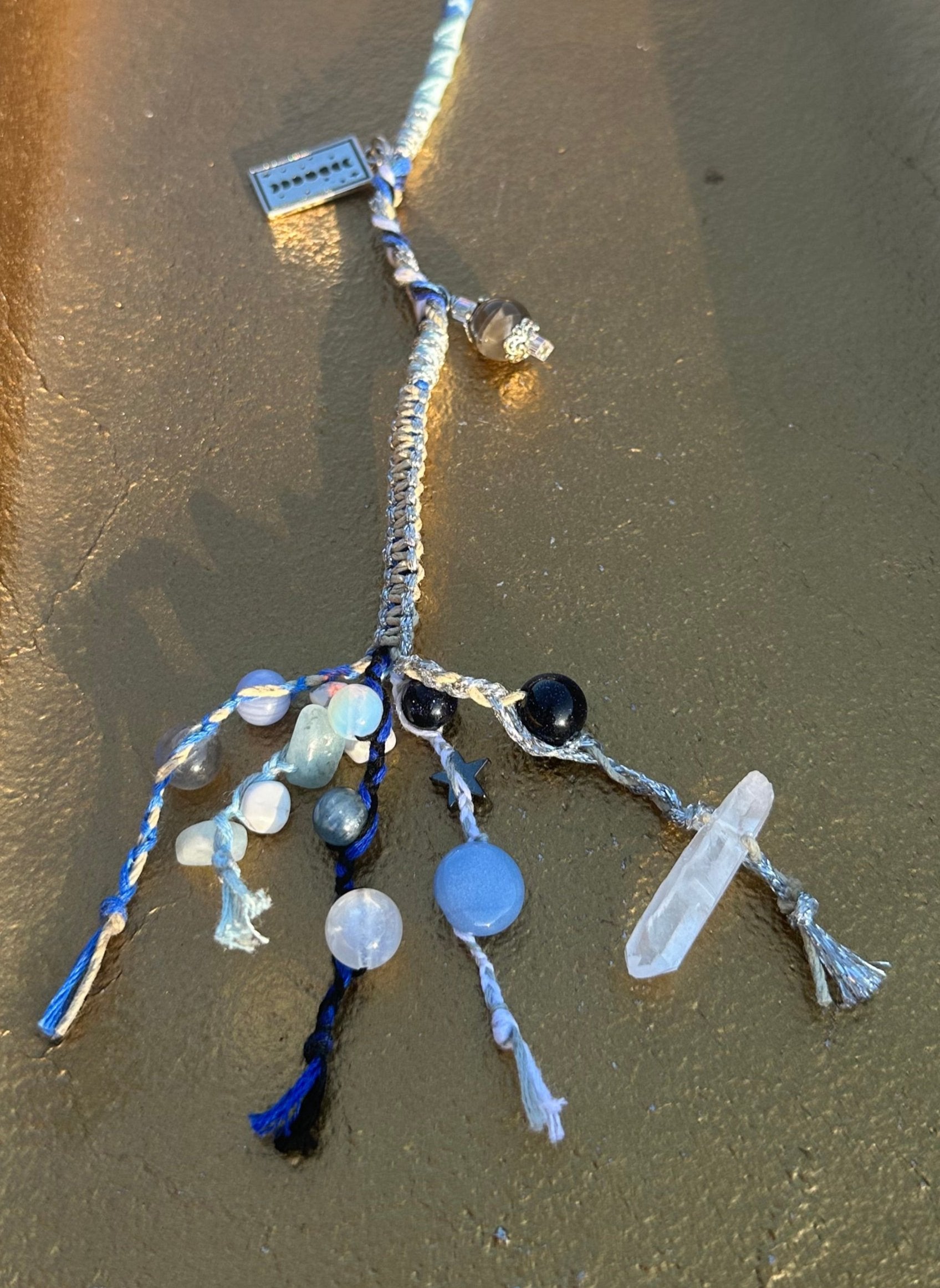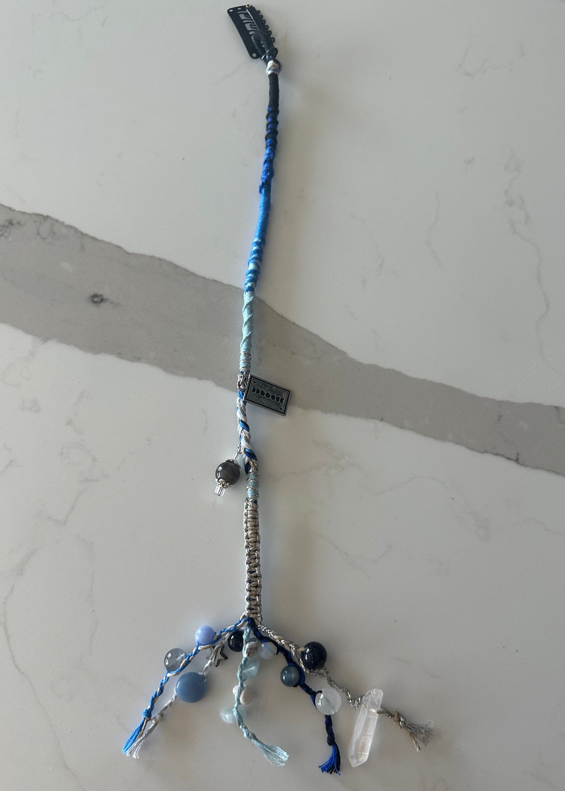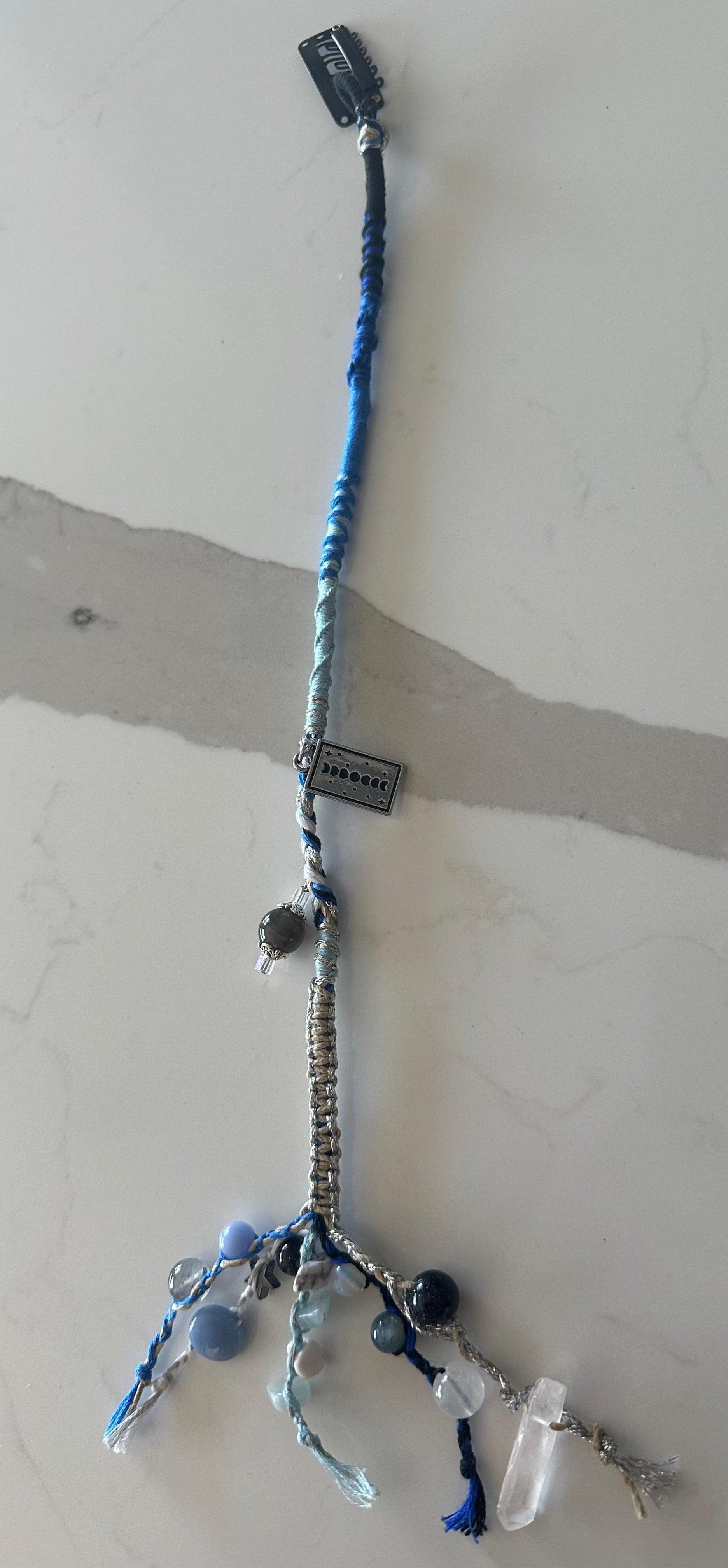 This unique Moon Phase Oracle Card Hair Wrap is handcrafted by a certified energy healing and reiki expert and infused with luminous elements that glow in the dark. It features various precious stones, including black moonstone, clear quartz, blue aragonite, blue goldstone, hematite, opalite, blue kyanite, rainbow moonstone, aquamarine, howlite, and labradorite, incorporated into its mystical 14-inch design. The clip-in feature allows for versatile styling options, and the inclusion of a silver moon phase oracle card charm makes it perfect for harnessing the power of moon energies.