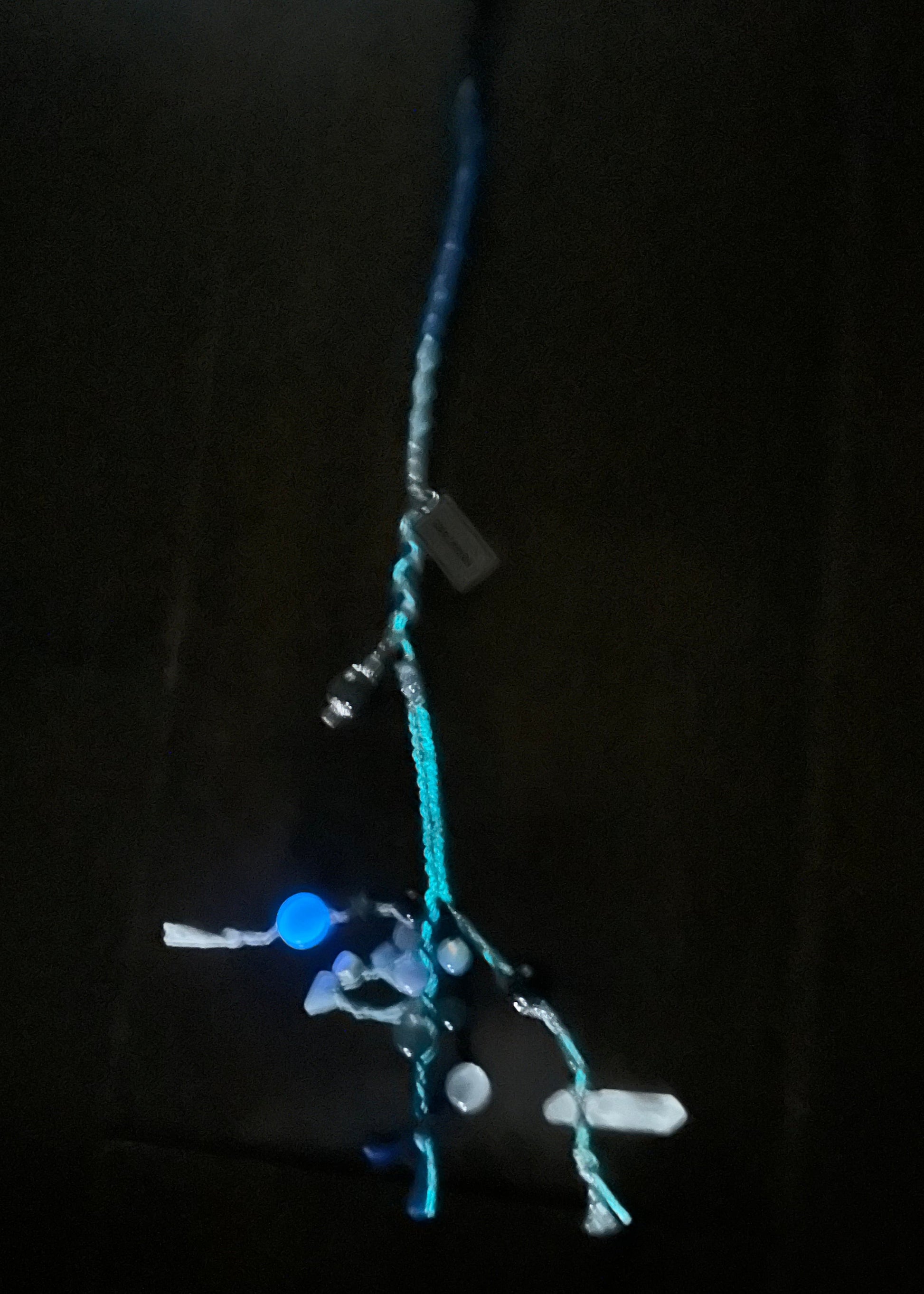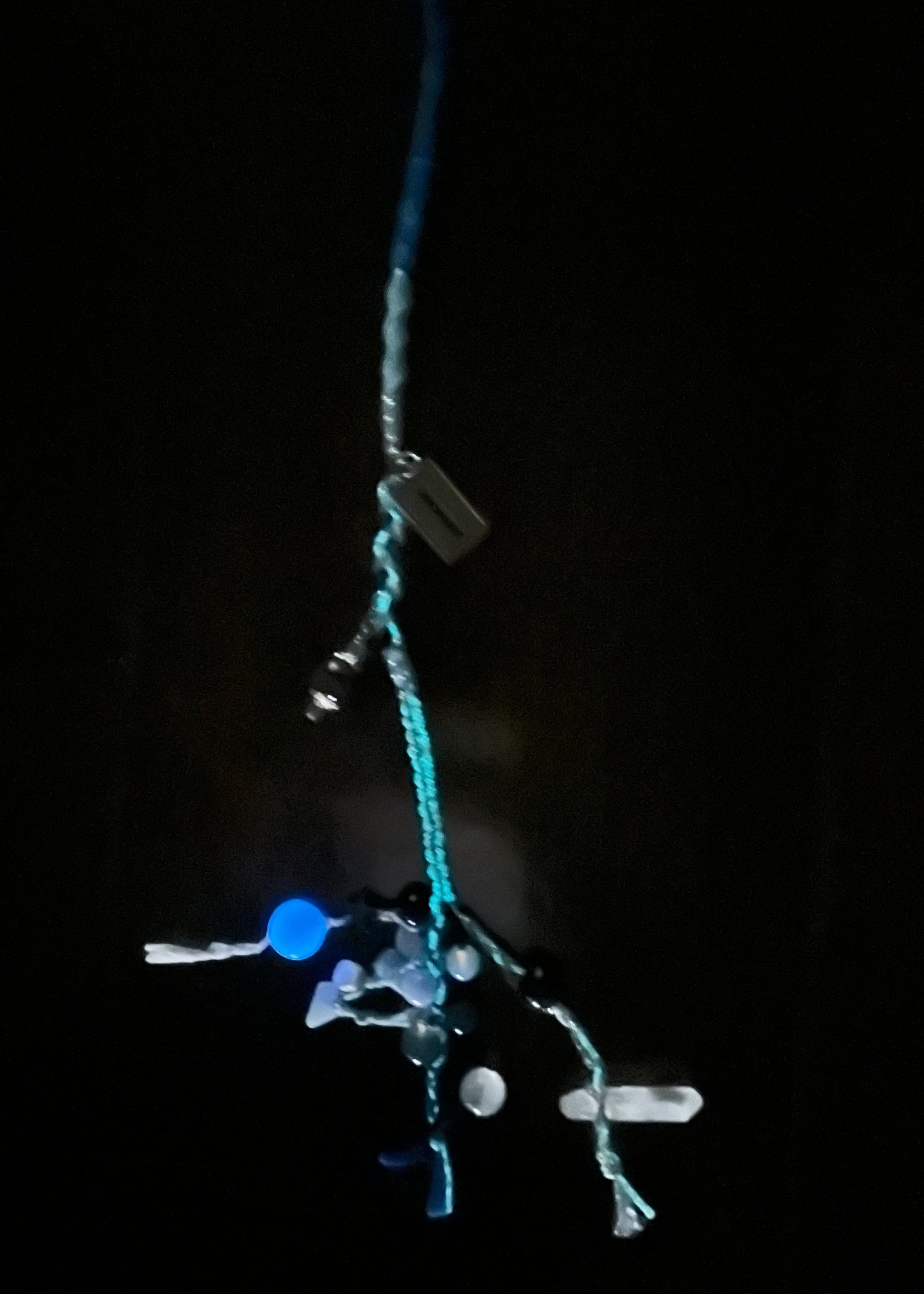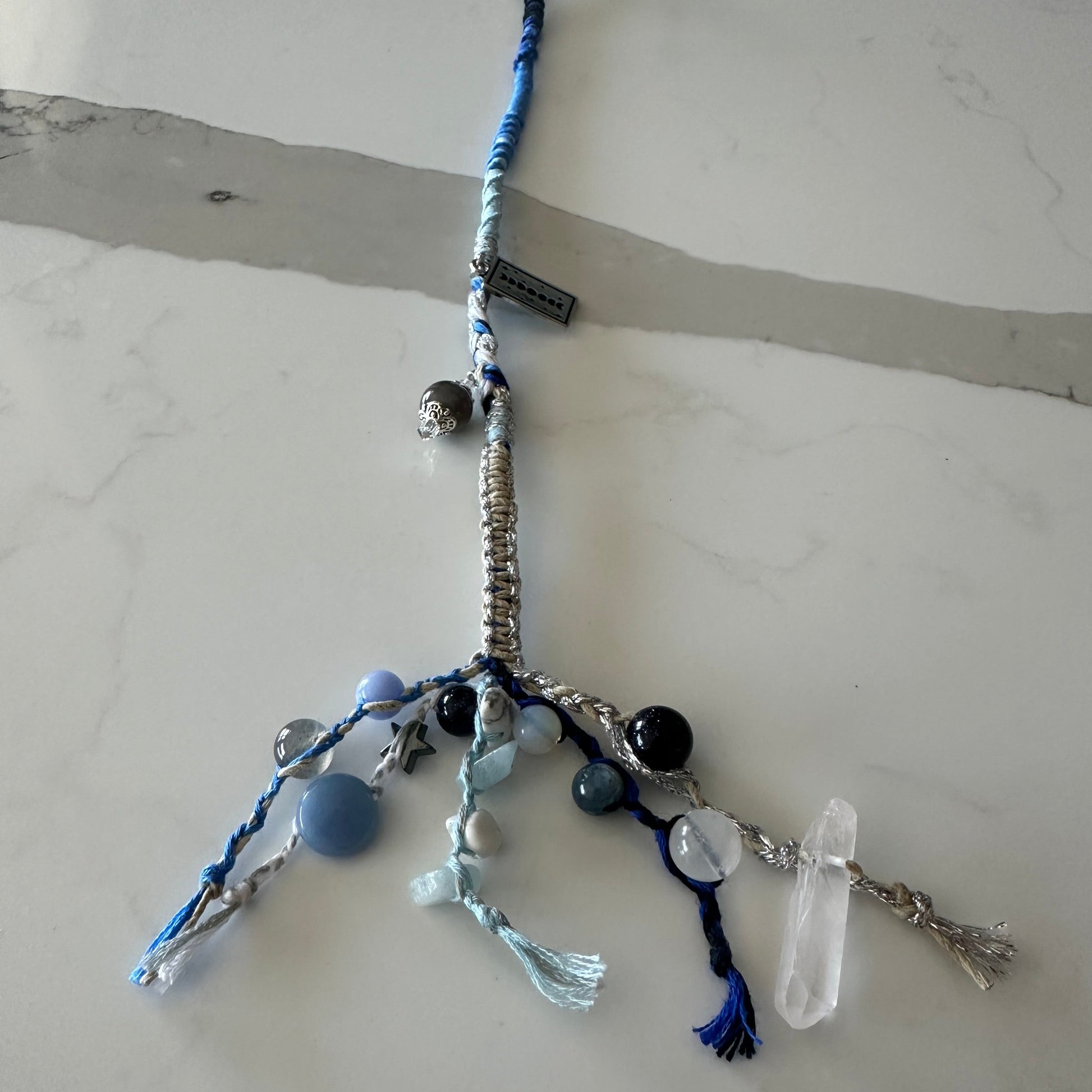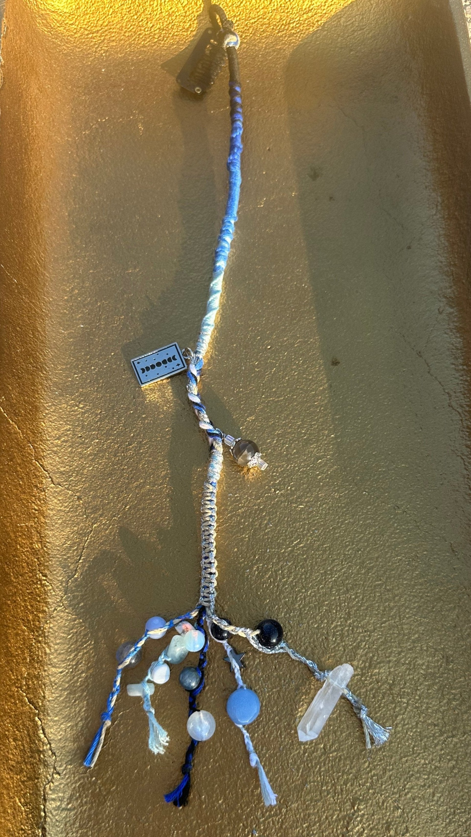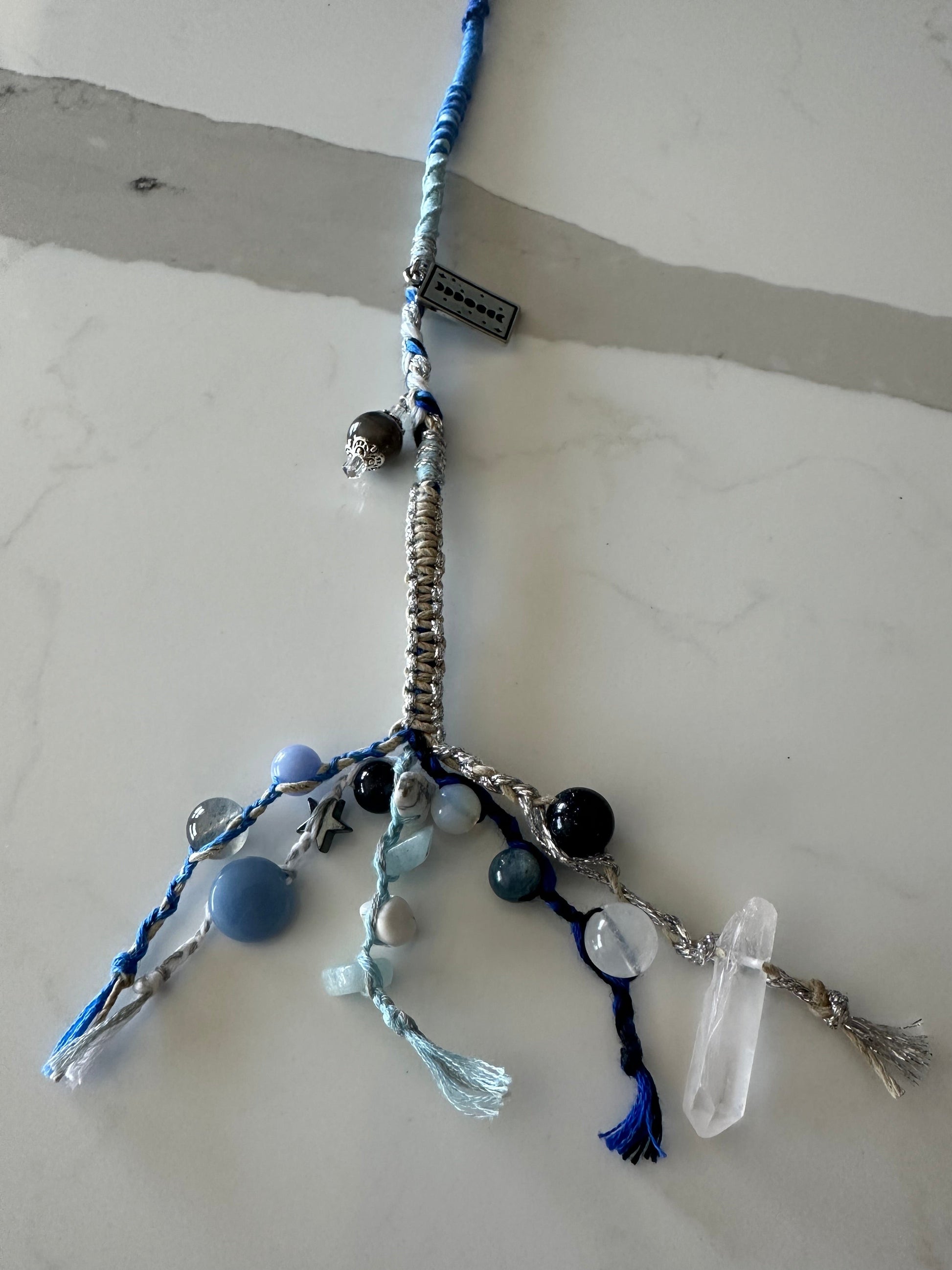 This unique Moon Phase Oracle Card Hair Wrap is handcrafted by a certified energy healing and reiki expert and infused with luminous elements that glow in the dark. It features various precious stones, including black moonstone, clear quartz, blue aragonite, blue goldstone, hematite, opalite, blue kyanite, rainbow moonstone, aquamarine, howlite, and labradorite, incorporated into its mystical 14-inch design. The clip-in feature allows for versatile styling options, and the inclusion of a silver moon phase oracle card charm makes it perfect for harnessing the power of moon energies.