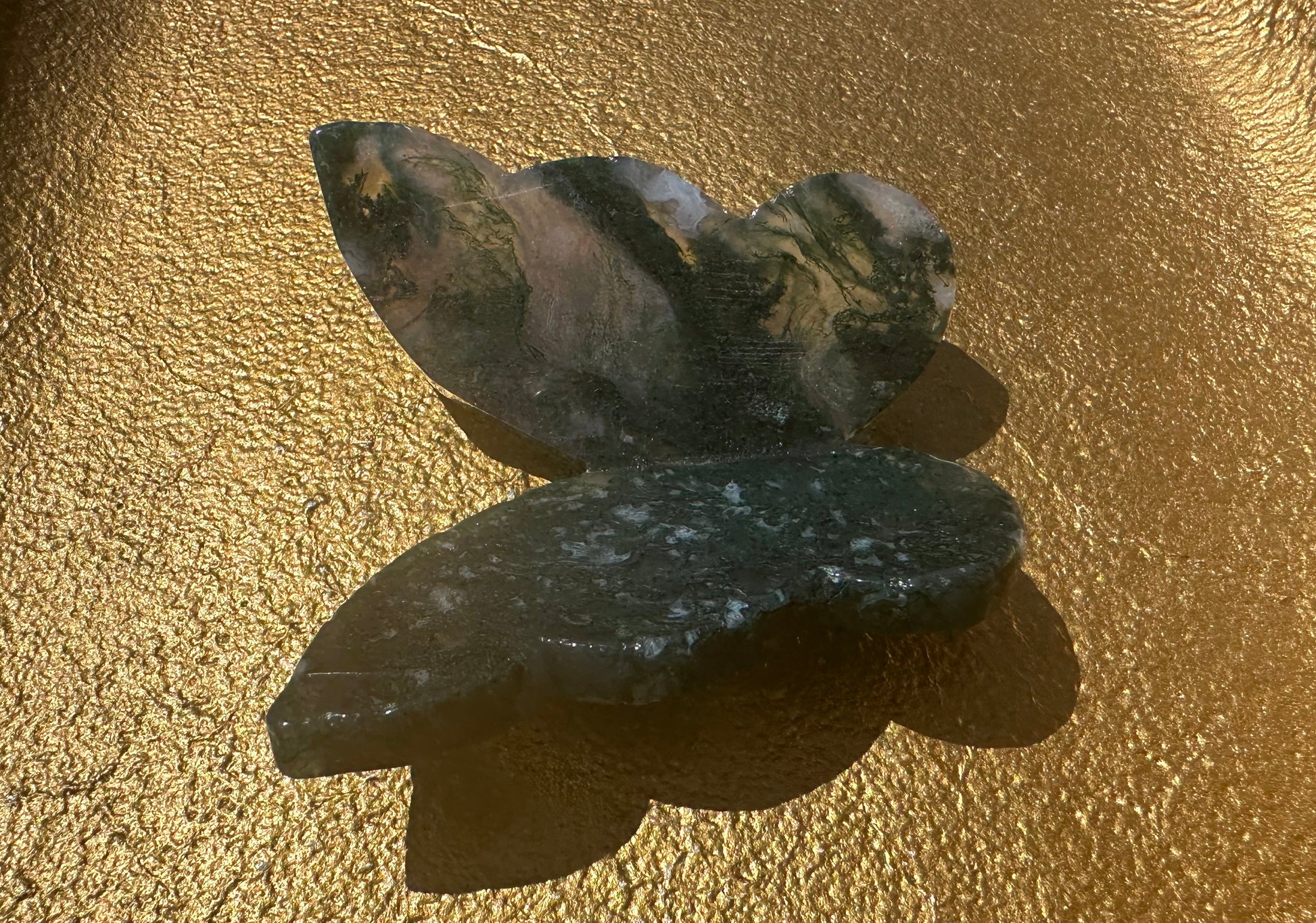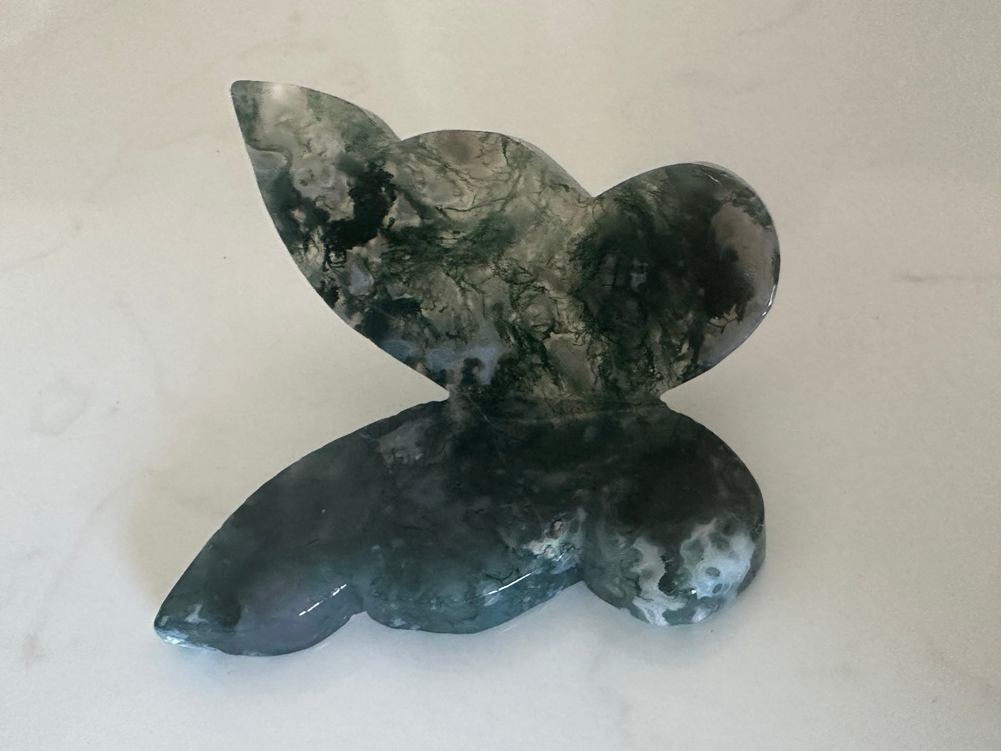 This listing offers a beautiful Moss Agate butterfly carving of your choice. Each butterfly measures about 3 x 2.5 inches and features unique patterns in the stone. These lovely pieces make perfect decorations or thoughtful gifts!