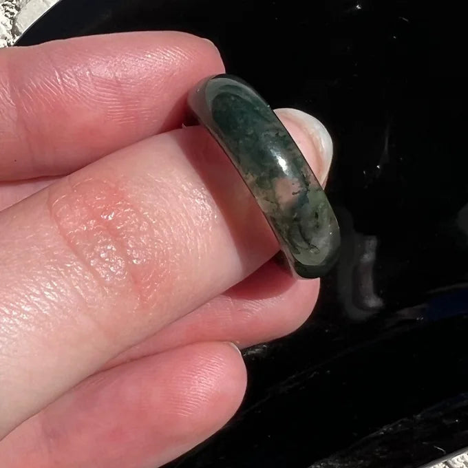 This listing is for 1 Moss Agate Ring that comes in a US size 5. This ring can also be used as a crystal sphere stand.