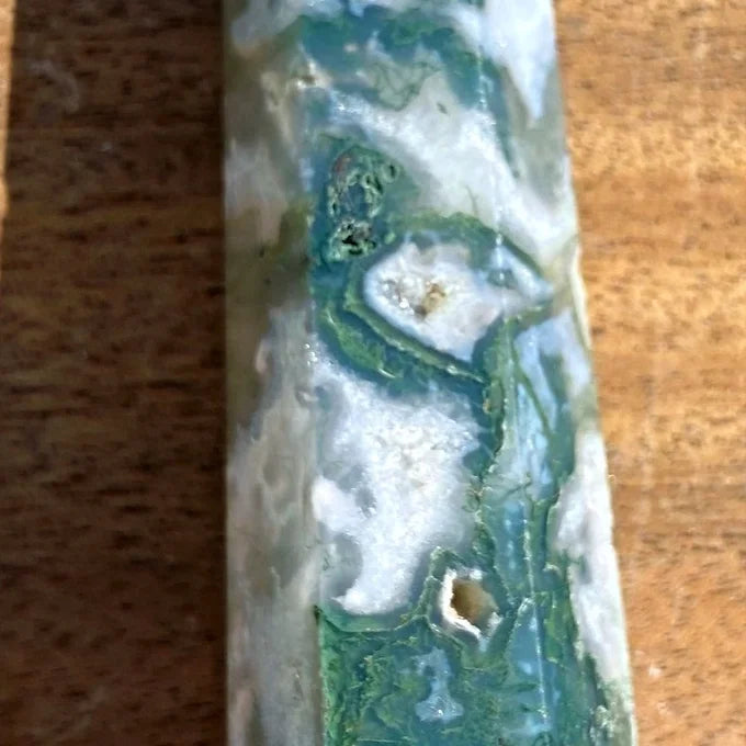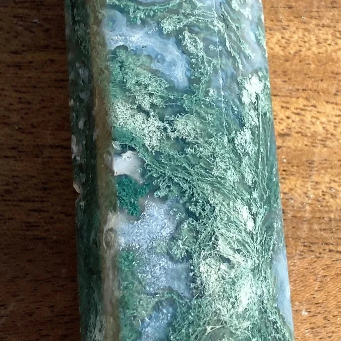 Moss Agate In addition to the generic healing properties of Agate and Chalcedony, Moss Agate is a stone of new beginnings. Refreshes the soul and enables you to see beauty in all you behold. Moss Agate reduces sensitivity to weather and environmental pollutants. It attracts abundance in wealth and improves self-esteem. Develops strength and the ability to get along with others. Inspires new ideals after periods of stagnation. Moss Agate promotes self-expression and communication. Balances the emotions, releasing fear and stress. Encourages trust and hope. It eliminates depression caused by brain imbalances.