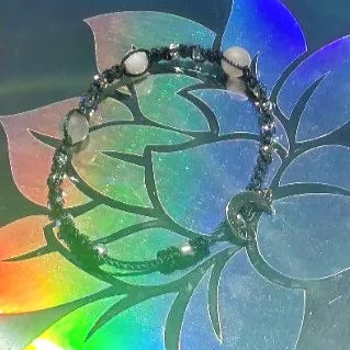 Inspired by the night sky these adjustable bracelets come in a spiral knot or square knot. Handmade with a midnight blue cord, smoky quartz and moonstone. These bracelets have silver seed bead accents along with a moon and star charm.