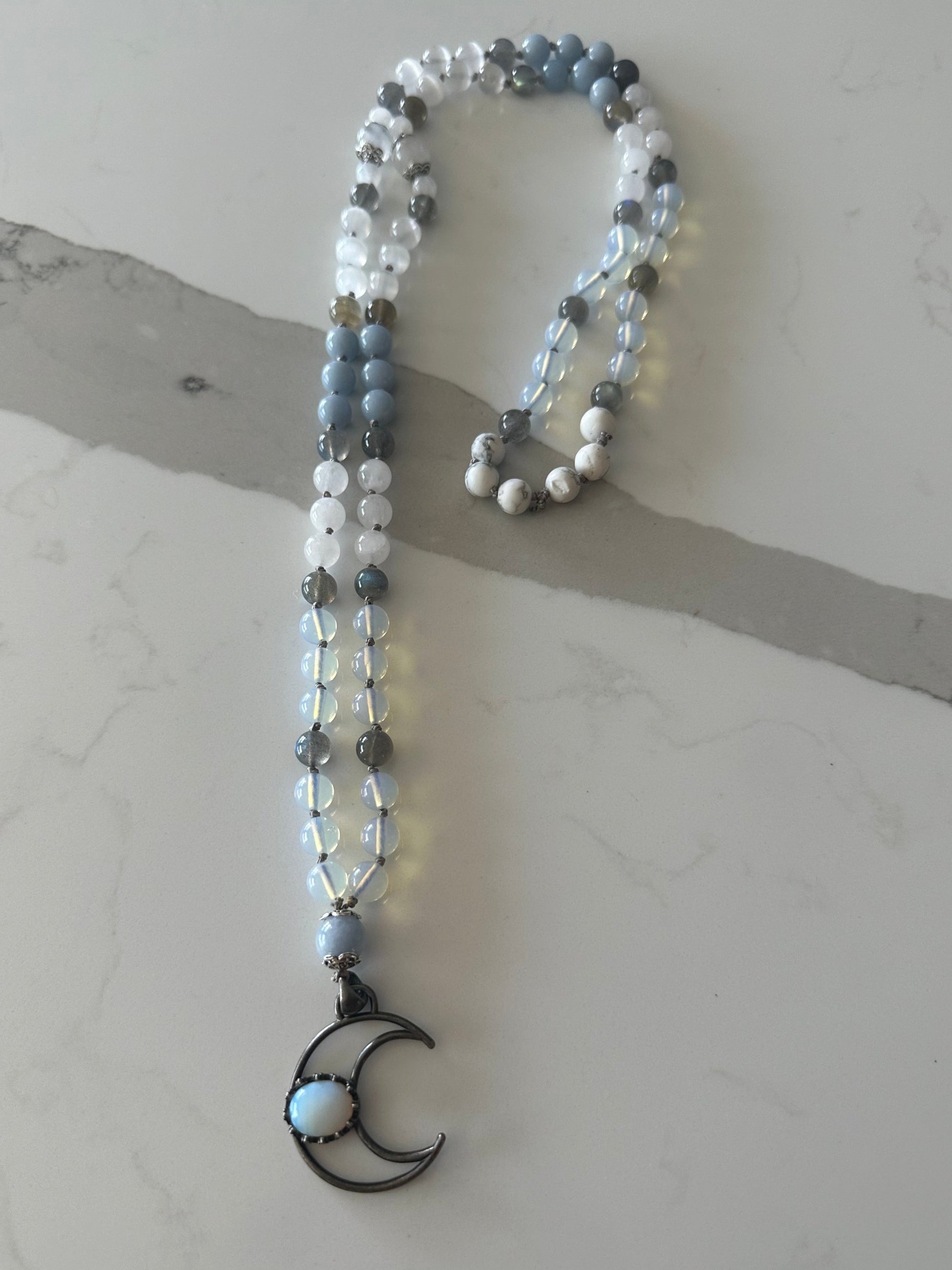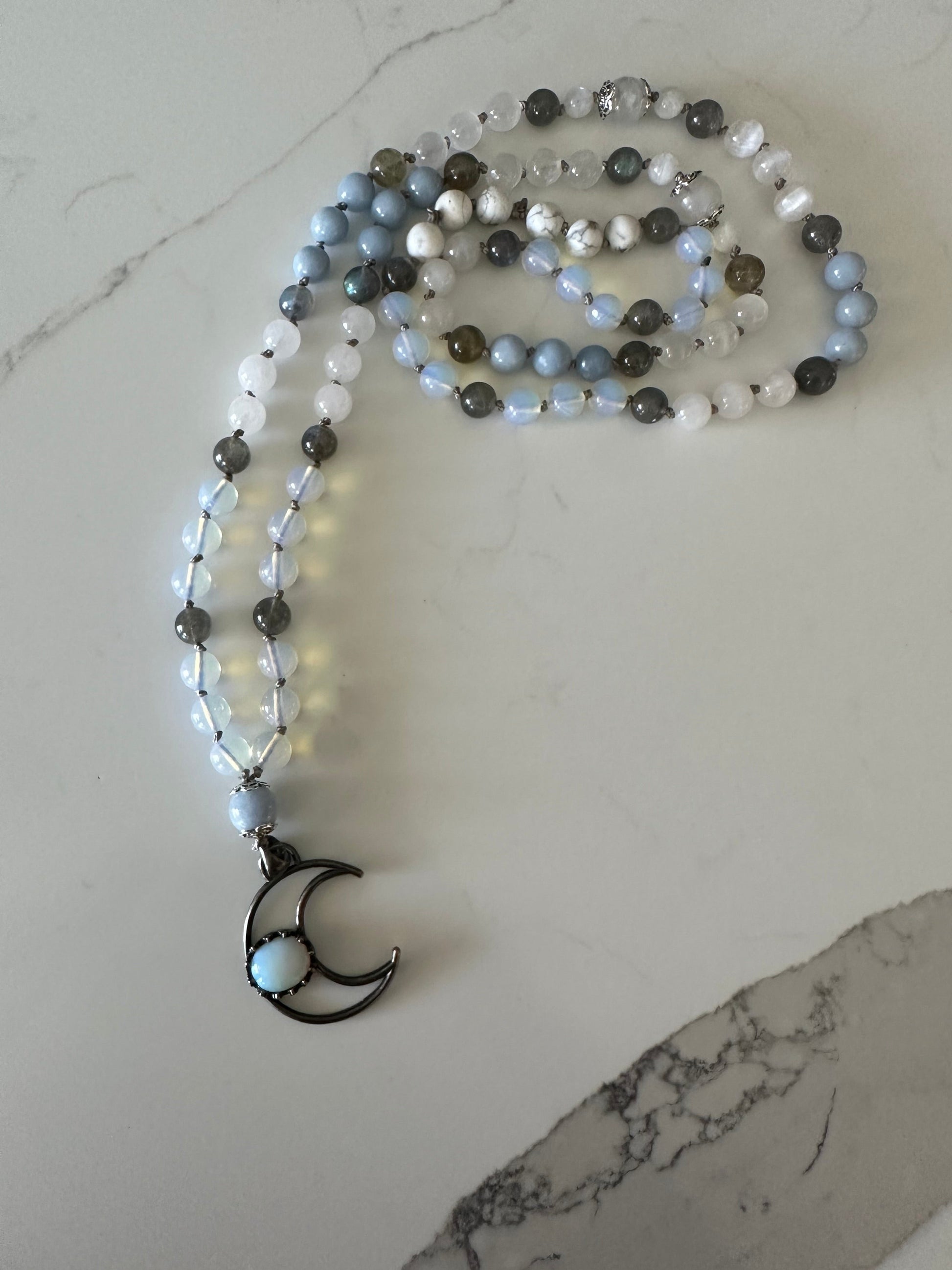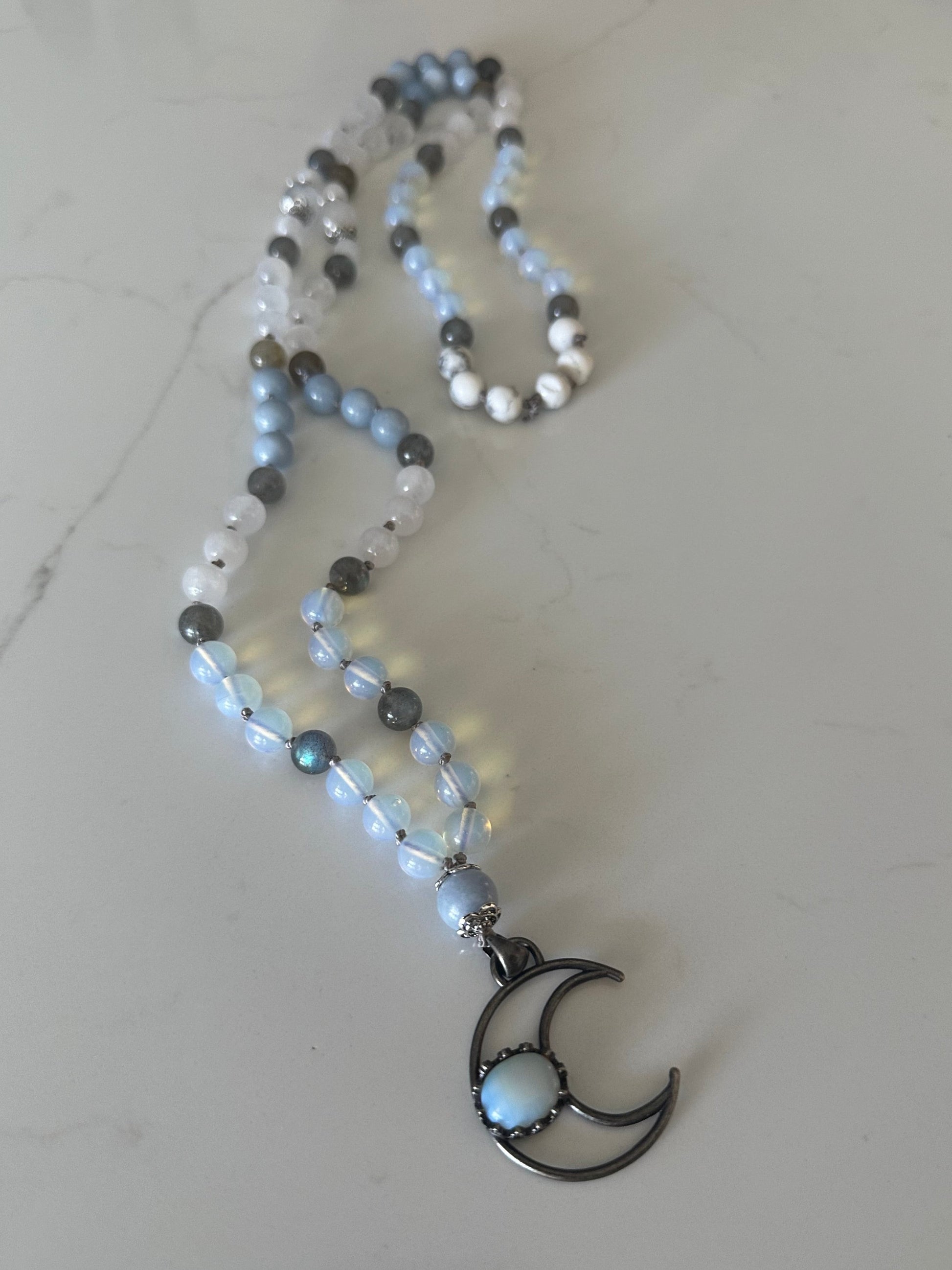 Discover the Angel Guide Moon Mala, featuring a unique blend of Opalite, Howlite, Labradorite, Selenite, White Jade, Rainbow Moonstone, and Blue Morganite, all infused with powerful energy by a certified energy healing and reiki master. This mala has a high vibrational frequency, making it perfect for connecting with angelic spirit guides and enhancing spiritual gifts. Measuring 42 inches and adorned with elegant silver filigree, it is strung on a sophisticated gray silk cord. Please be mindful that this product contains selenite and should not be exposed to water. It is also important to note that Opalite is a manmade crystal.