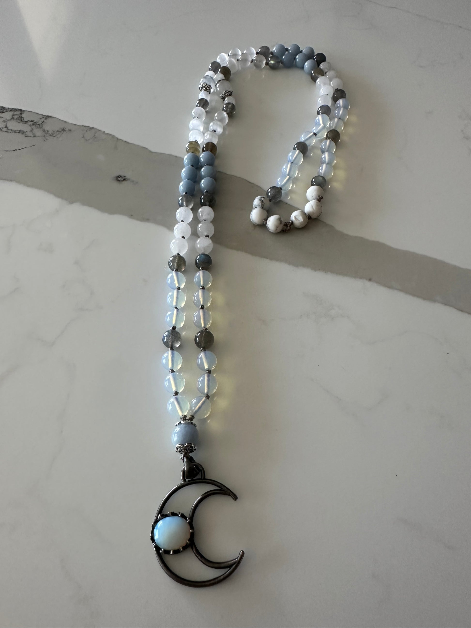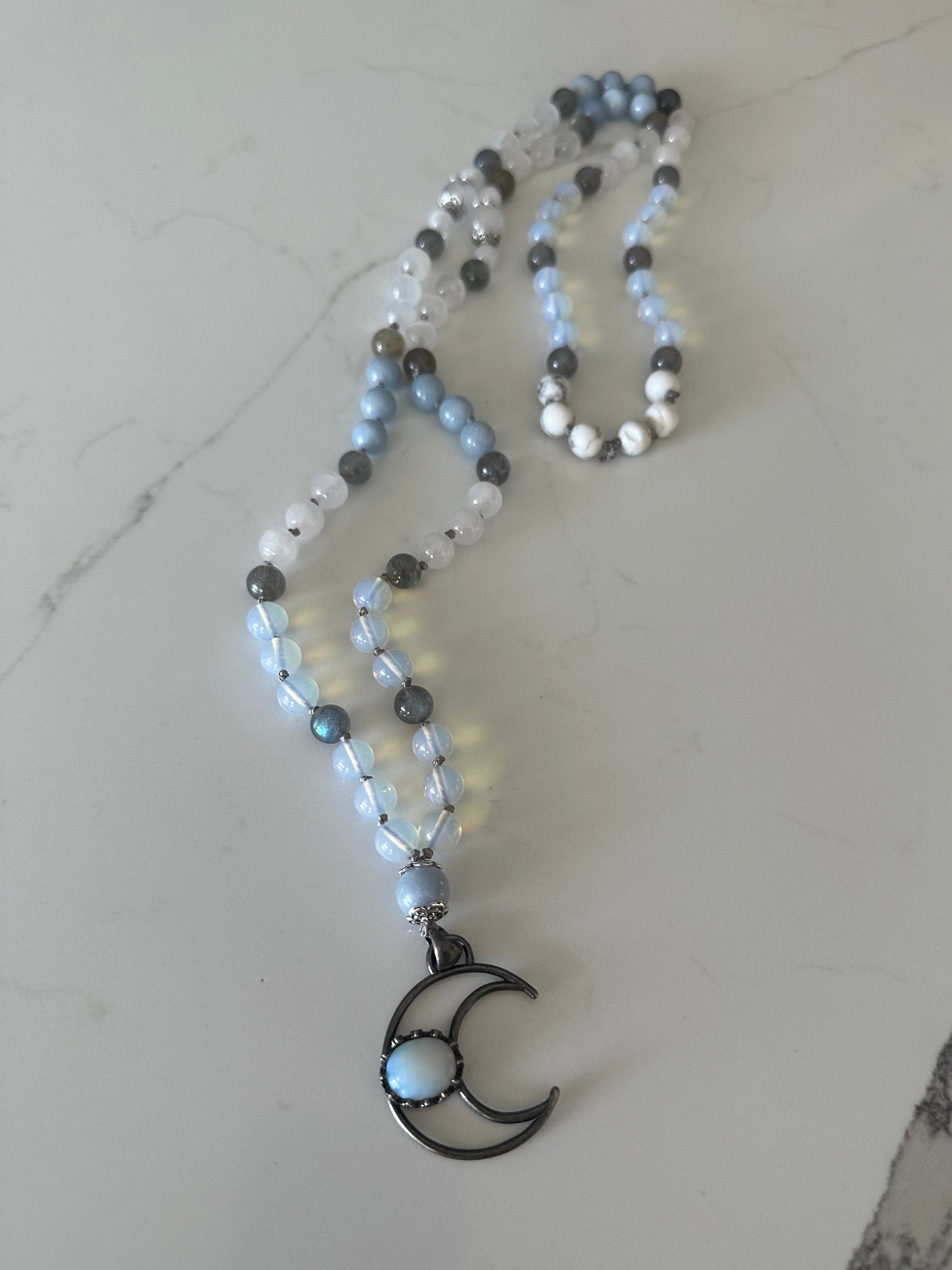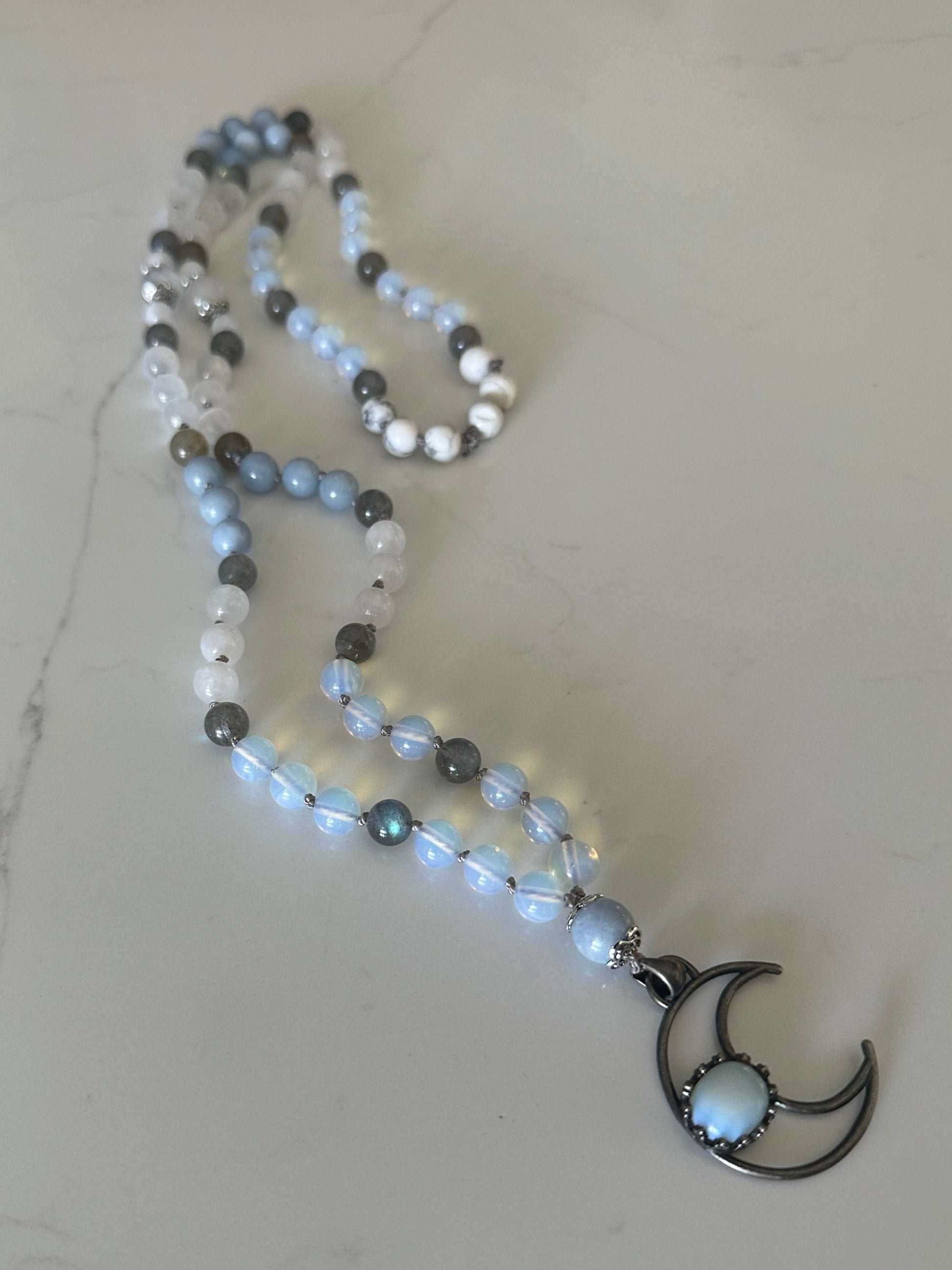 Discover the Angel Guide Moon Mala, featuring a unique blend of Opalite, Howlite, Labradorite, Selenite, White Jade, Rainbow Moonstone, and Blue Morganite, all infused with powerful energy by a certified energy healing and reiki master. This mala has a high vibrational frequency, making it perfect for connecting with angelic spirit guides and enhancing spiritual gifts. Measuring 42 inches and adorned with elegant silver filigree, it is strung on a sophisticated gray silk cord. Please be mindful that this product contains selenite and should not be exposed to water. It is also important to note that Opalite is a manmade crystal.
