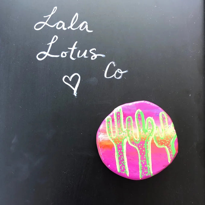 Pink desert sunset magnet is hand painted on a 3 by 3 inch circular stone. The background is magenta, orange, coral and purple ombre. The cacti are green and lime green with green accents.