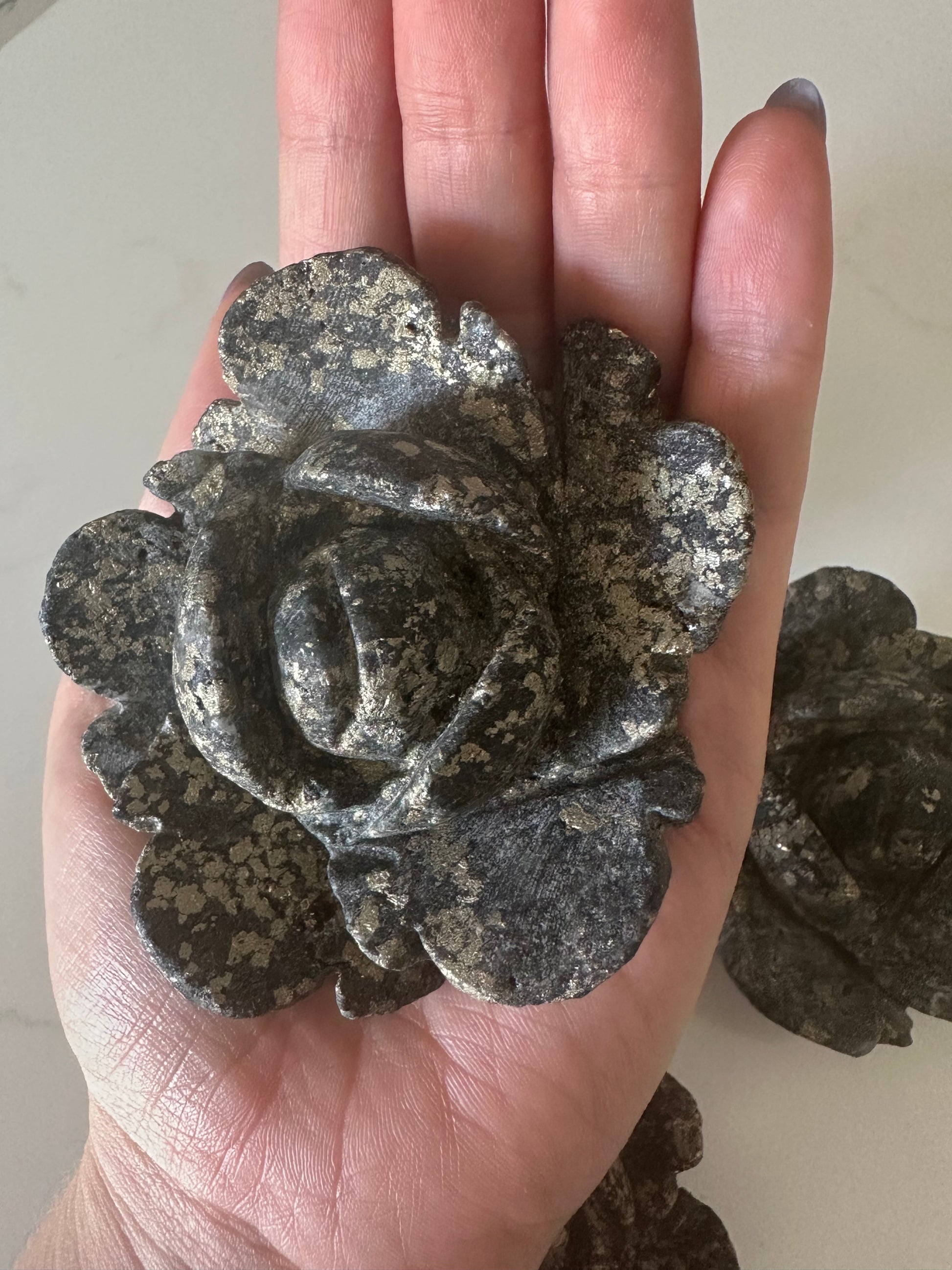 This listing is for one beautifully carved pyrite rose, measuring between 2 to 5 inches, lovingly treated with Reiki by a certified energy healing and Reiki master.