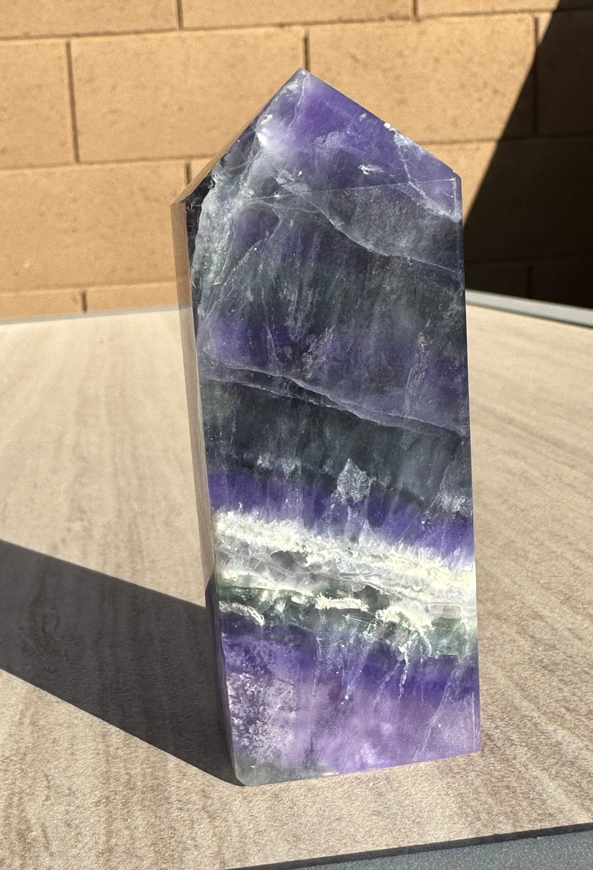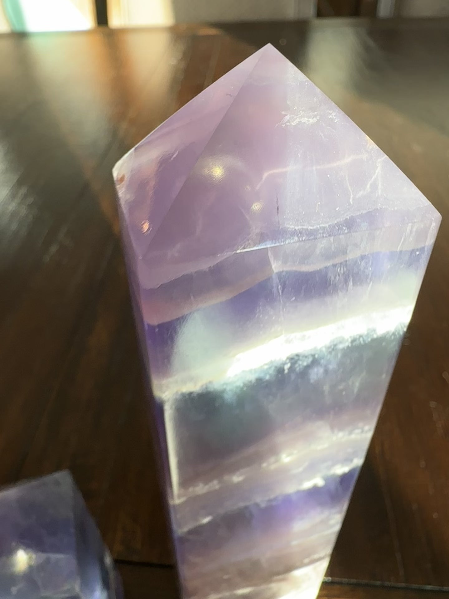 This listing offers 1 Rainbow Fluorite Obelisk, each attuned with certified energy healing by a master of the practice. These obelisks act as an effective focal point of energy for any space. The medium obelisk is 4 inches high and 1.5 inches wide. The large obelisk is 7 inches high and 2 inches wide.