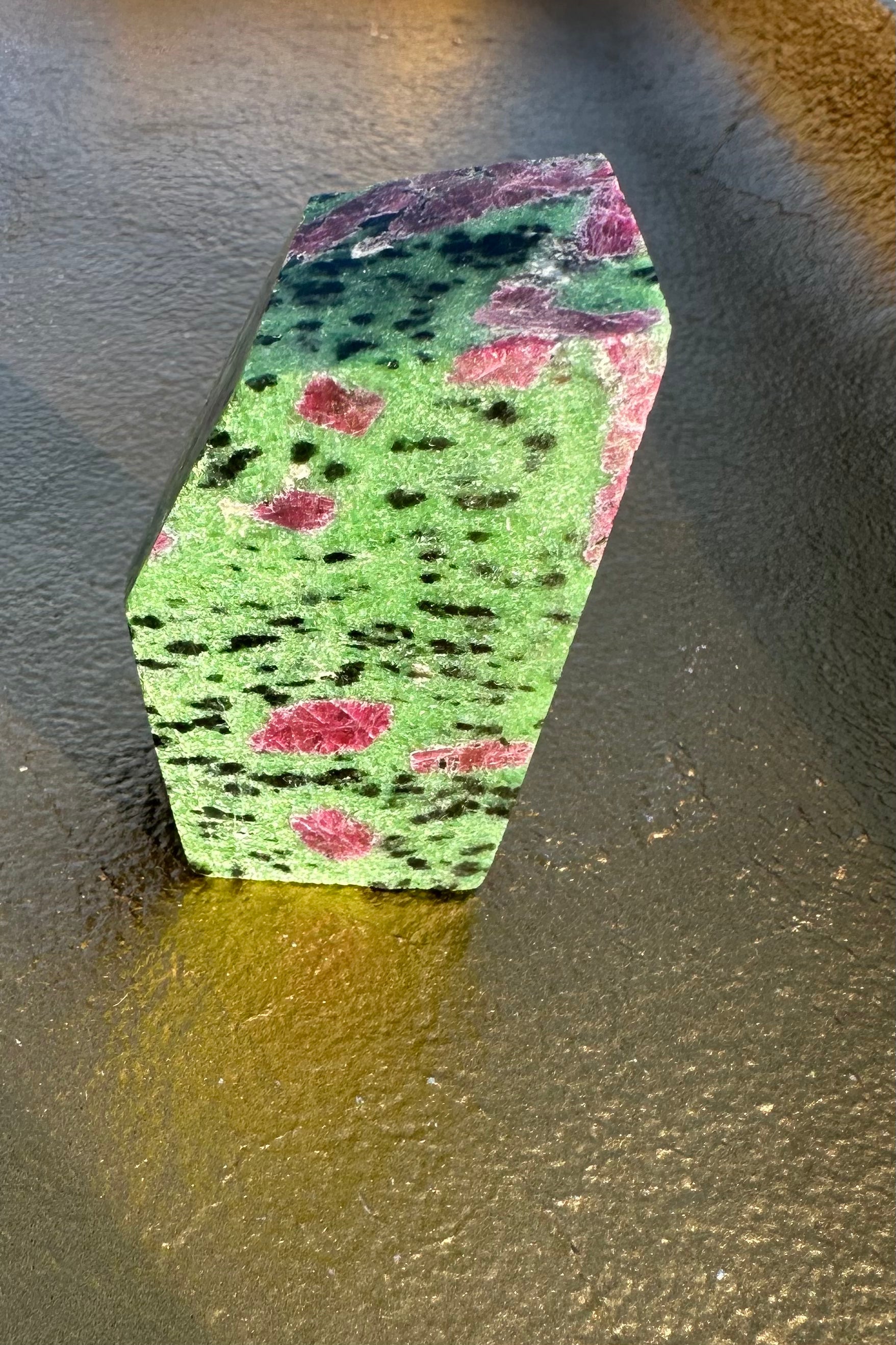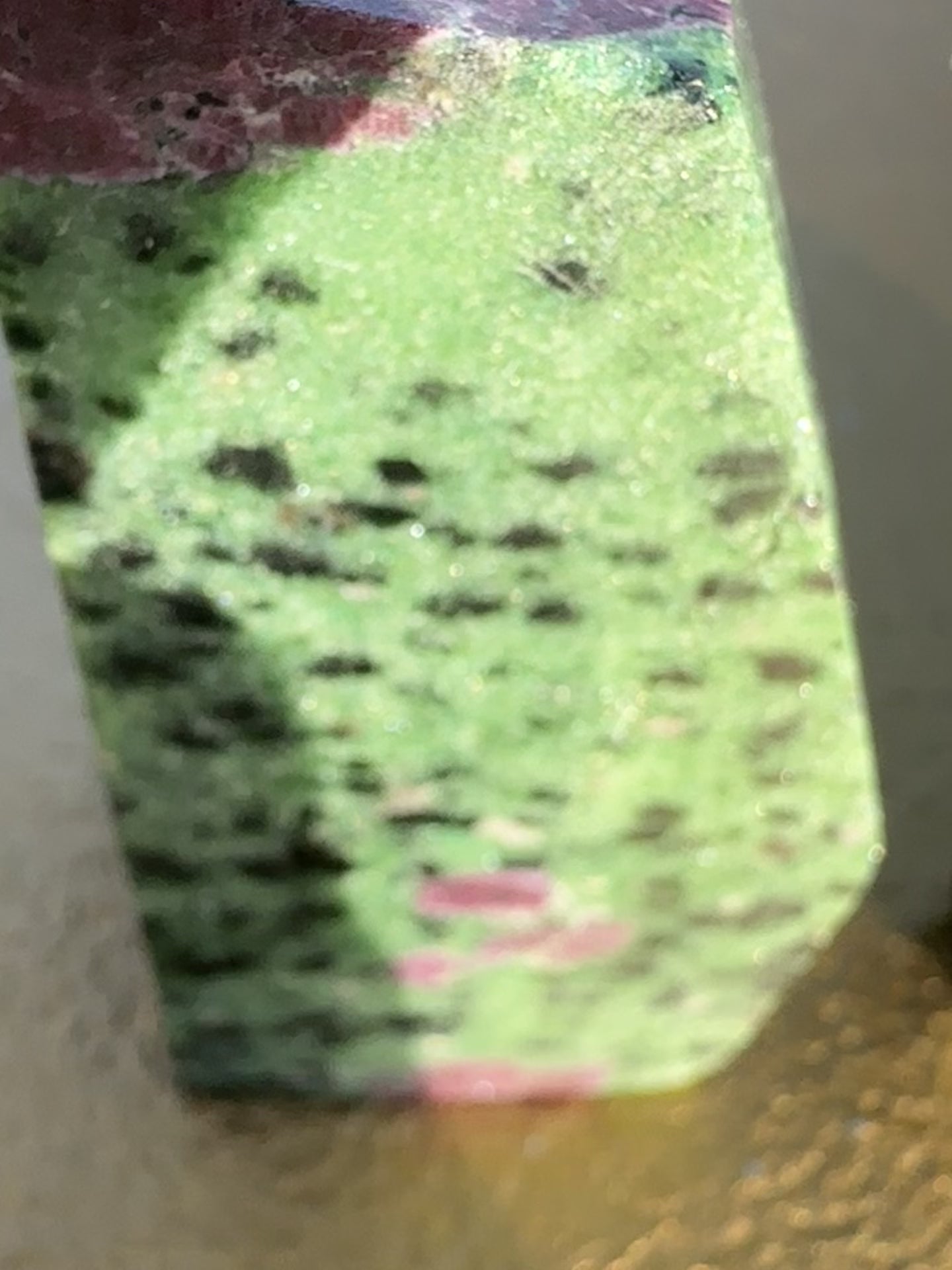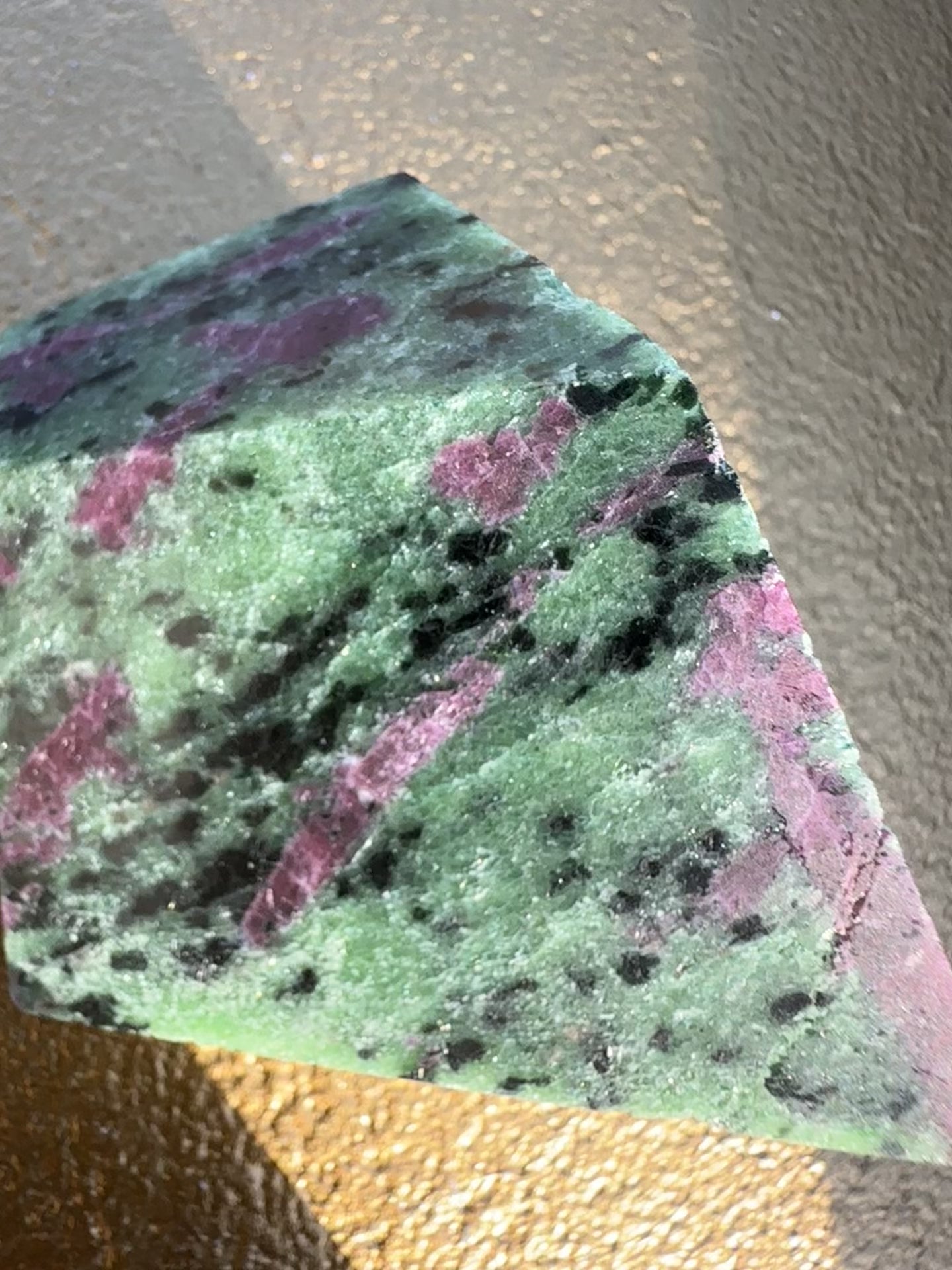 Ruby Zoisite- Ruby Zoisite also known as Anyolite creates an altered state of consciousness, enabling you to reach and utilize talents and abilities of the mind. It stimulates psychic abilities. Increases awareness of one’s individuality. Anyolite instills joy, spontaneity, laughter, and courage, bringing passion and a zest for life. Ruby is UV reactive and glows a neon red under a black light.