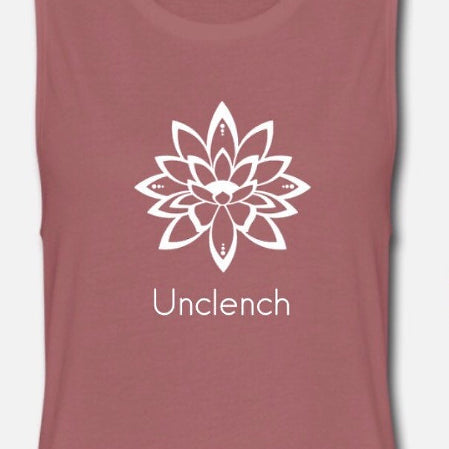 Simple lotus unclench tank top comes in any size. The tank top is a beautiful pink and very soft. There’s a simple white lotus with wire lettering that says “unclench” underneath. This is part of the unclench brand.
