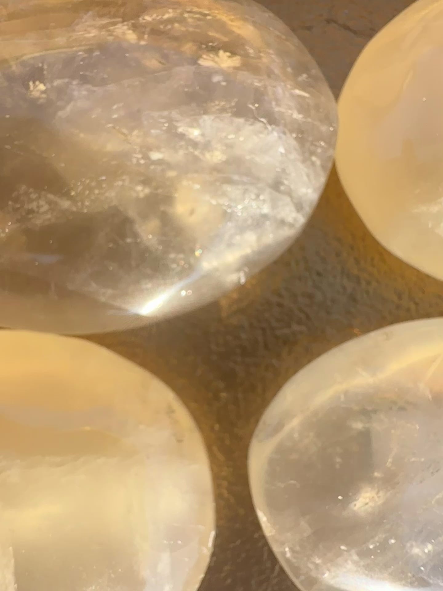 These Starry Citrine Palm stones are of superior quality and come blessed by a certified reiki and energy healing expert. Citrine is highly effective in aiding the manifestation of success, abundance, and prosperity. Included gypsum stars are a characteristic feature of these palm stones, giving them a distinct and powerful energy. Choose from a large or medium size, and note that stones will be intuitively selected unless otherwise specified (i.e. smoky citrine or lemon-shaped citrine).
