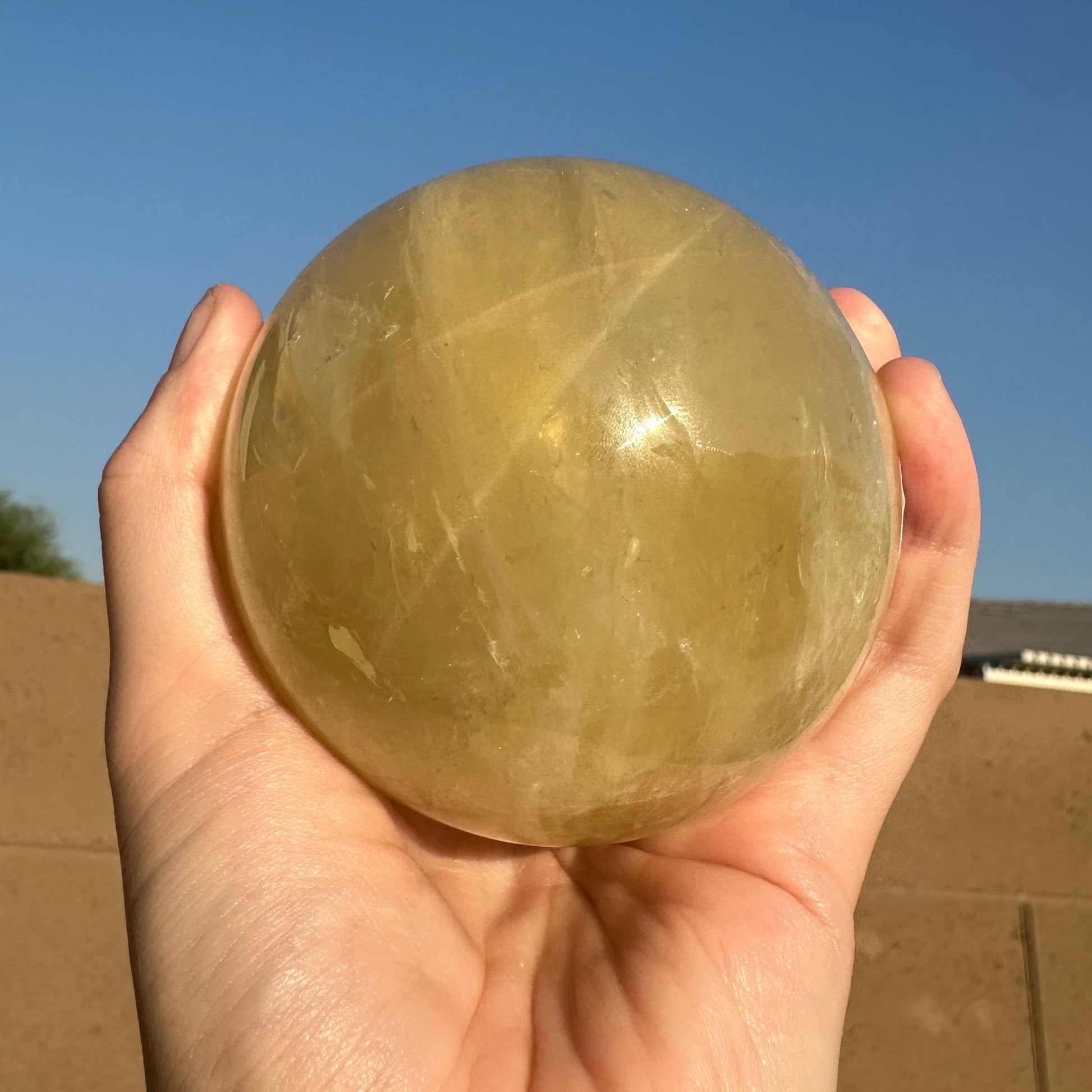 This unique starry citrine sphere features a natural double inclusion of gypsum star, making it a highly sought-after item. The exceptional quality of star citrines is extremely difficult to come by. This sphere has been blessed by a certified energy healing and reiki practitioner, adding to its rarity and value.