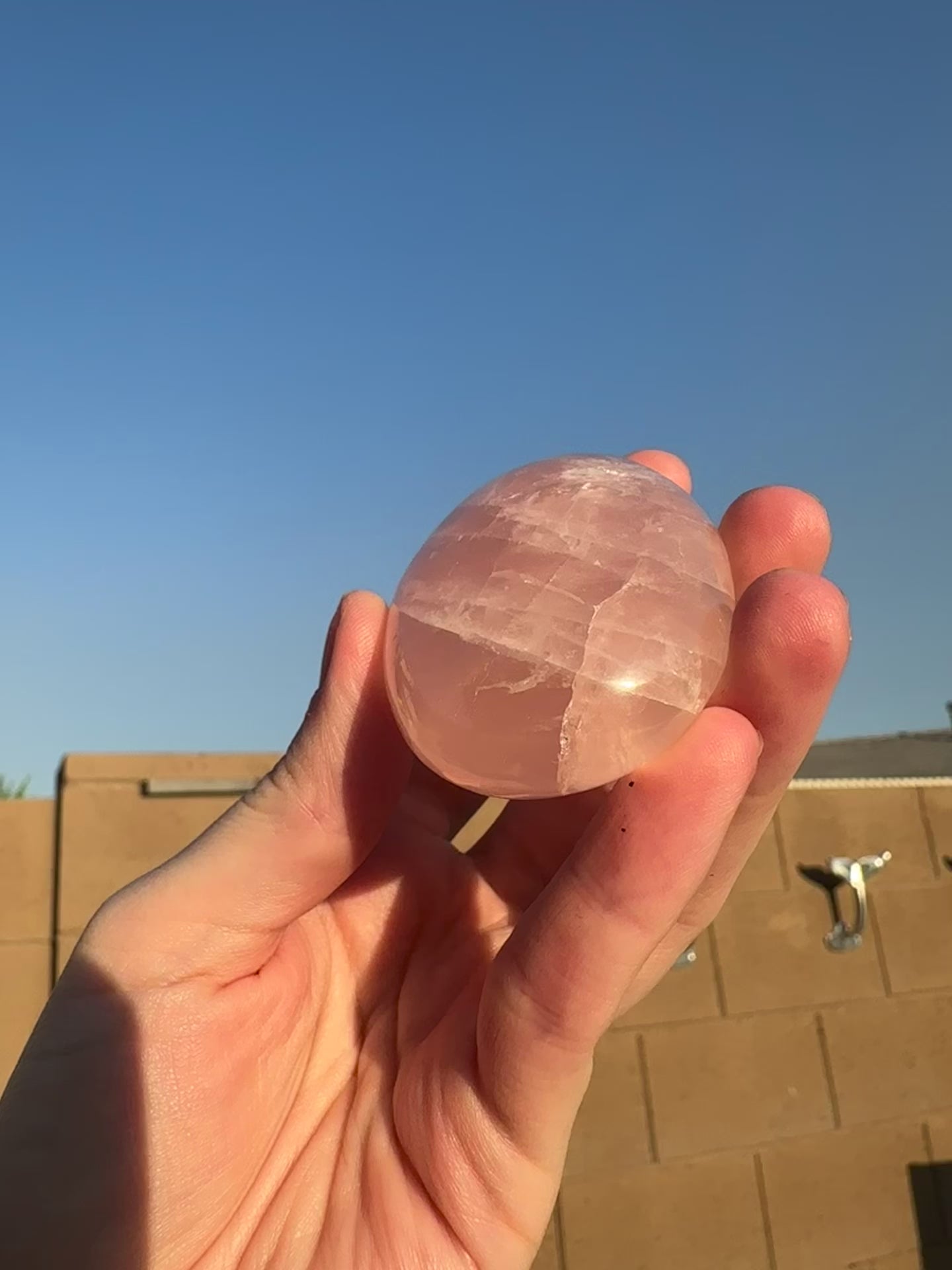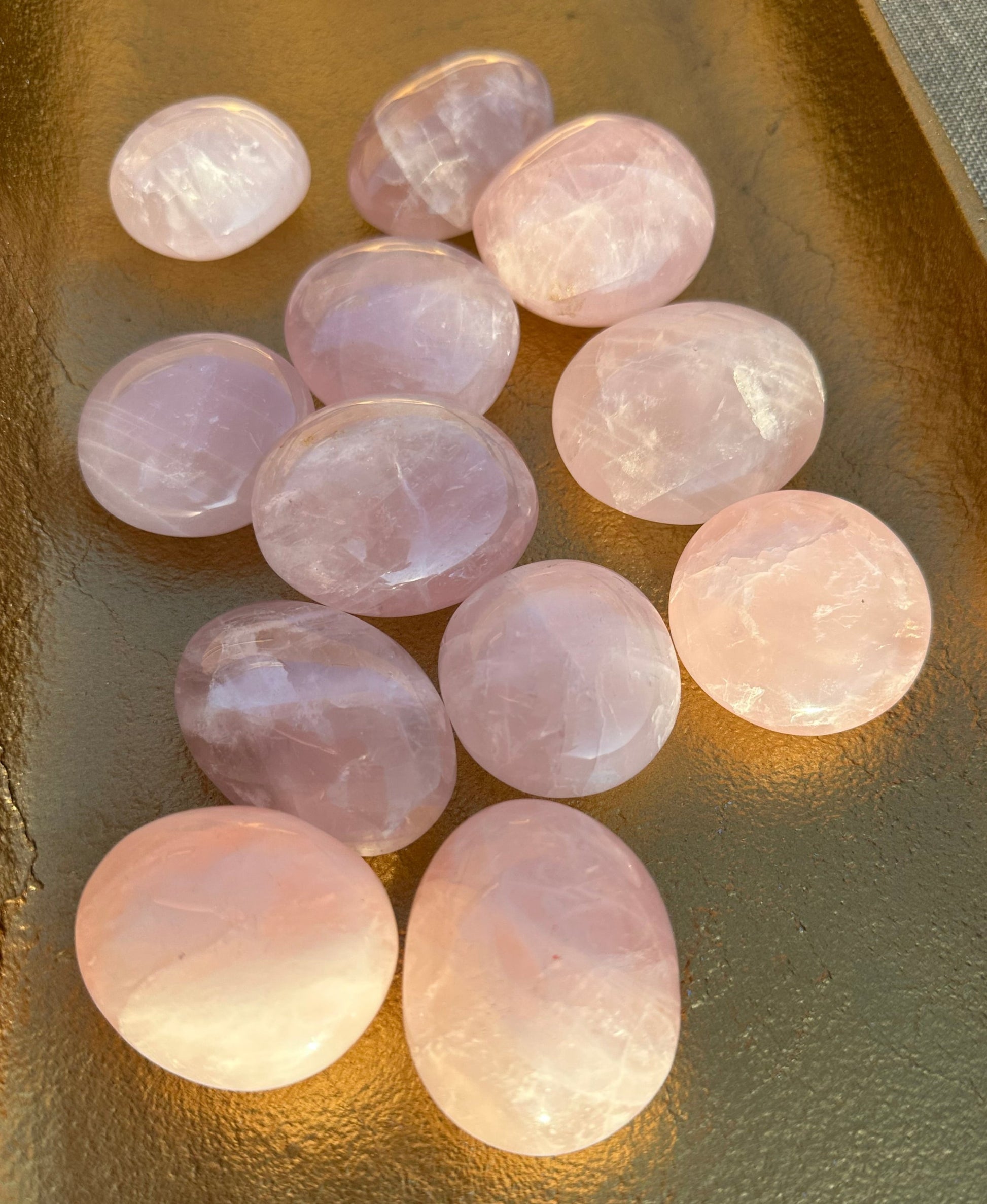 Discover these exquisite starry rose quartz palm stones. Our top-of-the-line stones are expertly blessed by a certified energy healing and reiki master, and feature naturally occurring gypsum starts.