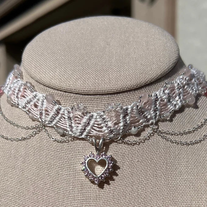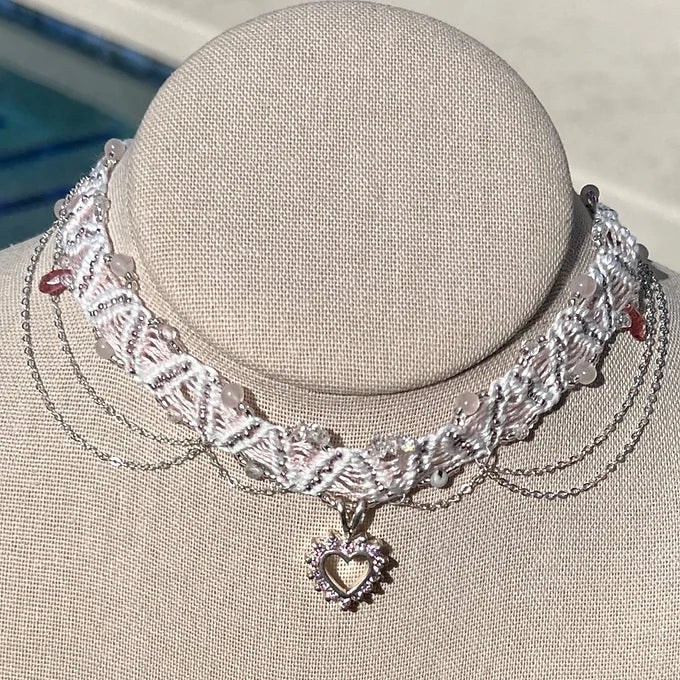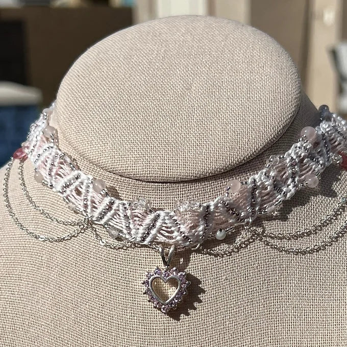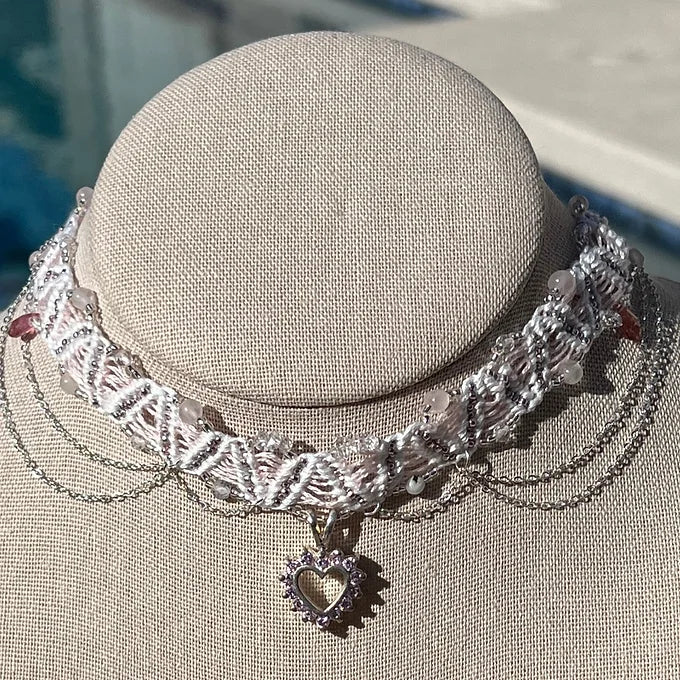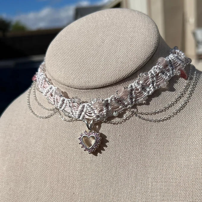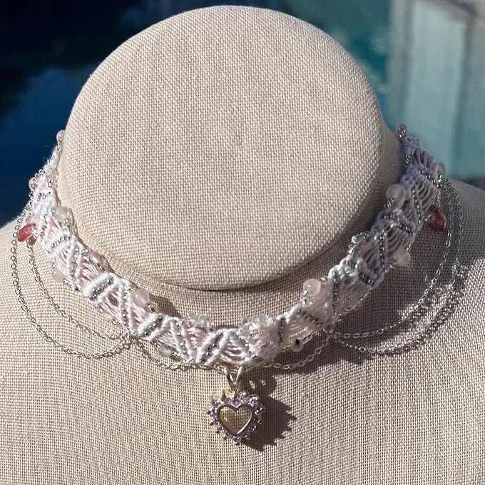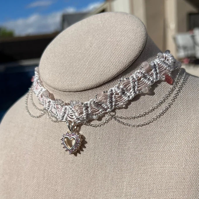 The Sweet Heart Choker is handmade with over 500 beads and knots. This one-of-a-kind Lala Lotus Co. original is a wonderful addition to any jewelry collection or would make a beautiful gift for valentines day. Each crystal and crystal creation has been Reikied by a certified Energy healing and Reiki master. This necklace is 14 inches and adjustable to 17 inches.