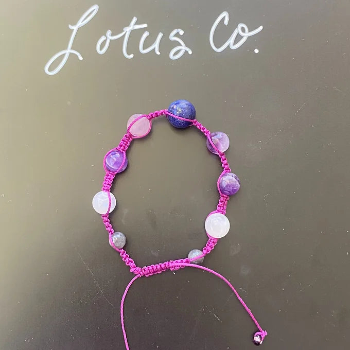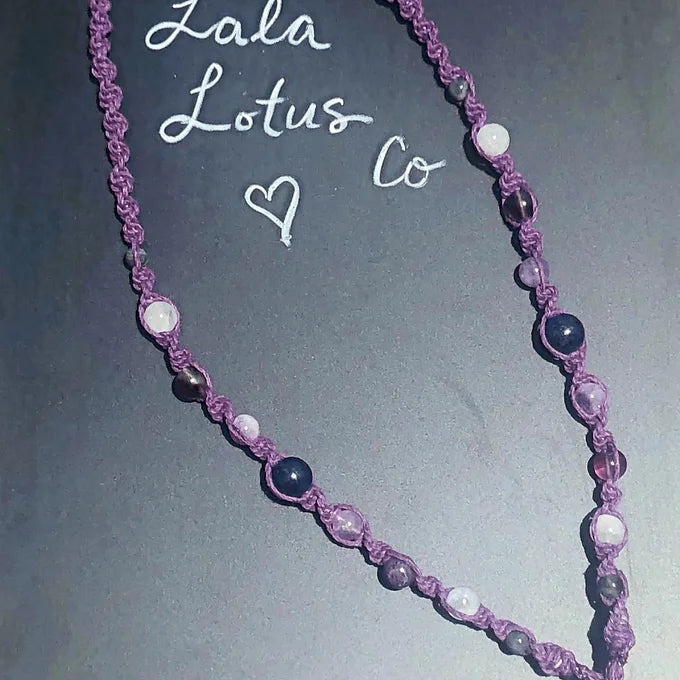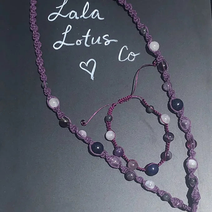 Third eye chakra set is handmade with grade A or higher crystals that were hand selected for the third eye chakra. The third eye chakra necklace is made with purple hemp and is 20-23inches. The bracelet is adjustable.