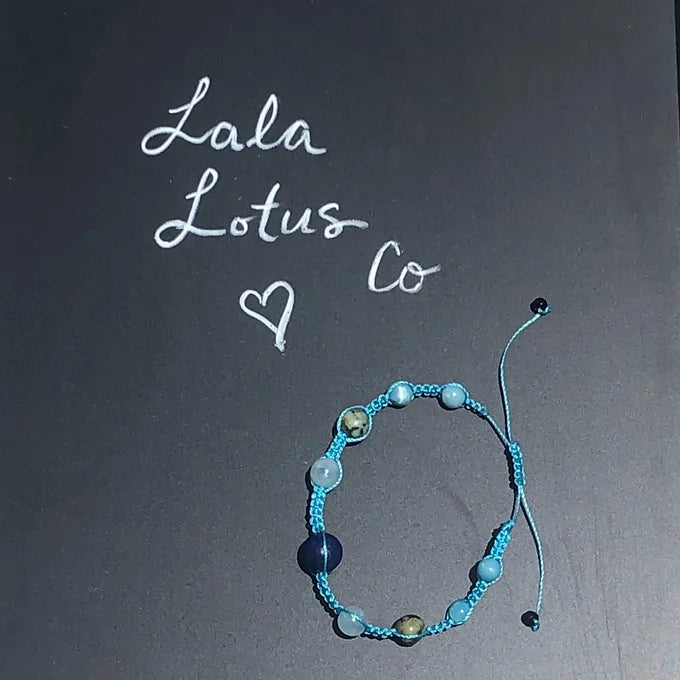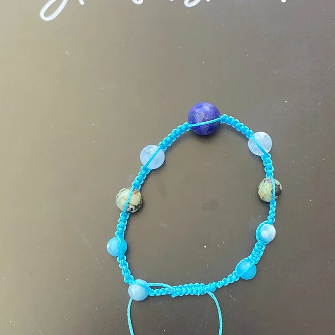 Throat chakra jewelry set is handmade with intentionally selected crystals. The throat chakra necklace is 22 inches and can adjust to 24 inches. It is made with a white hemp cord that glows blue in the dark. The throat chakra bracelet is also adjustable. Both items have been infused with good energies and reikied by certified masters.