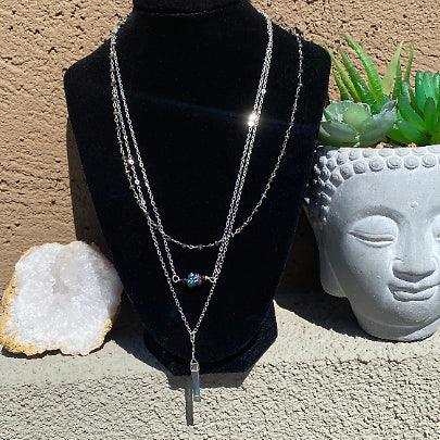 Transformed by skilled Phoenix artisans, this necklace features triple layers of titanium quartz and silver. The first layer is a 17 inch titanium quartz rosary beaded chain, followed by a 19 inch silver chain with a titanium quartz centerpiece. The final layer is a 21 inch silver chain with a titanium quartz point. Certified reiki and energy healing masters have imbued this necklace with positive energy. Known for its ability to enhance focus and self-awareness in both ourselves and our surroundings, titanium quartz also brings joy and vitality through its rainbow of colors. Mentally, it boosts analytical thinking and provides a stronger, more confident mindset. To maintain its longevity, it is best to remove this necklace before sleeping.